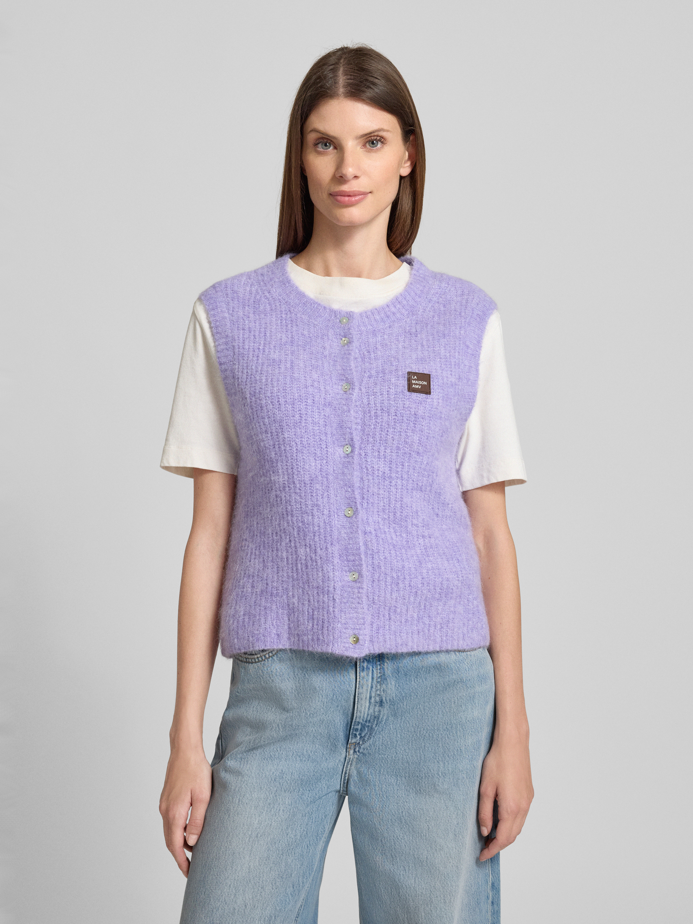 Mouwloos vest met labelpatch in lila gemêleerd