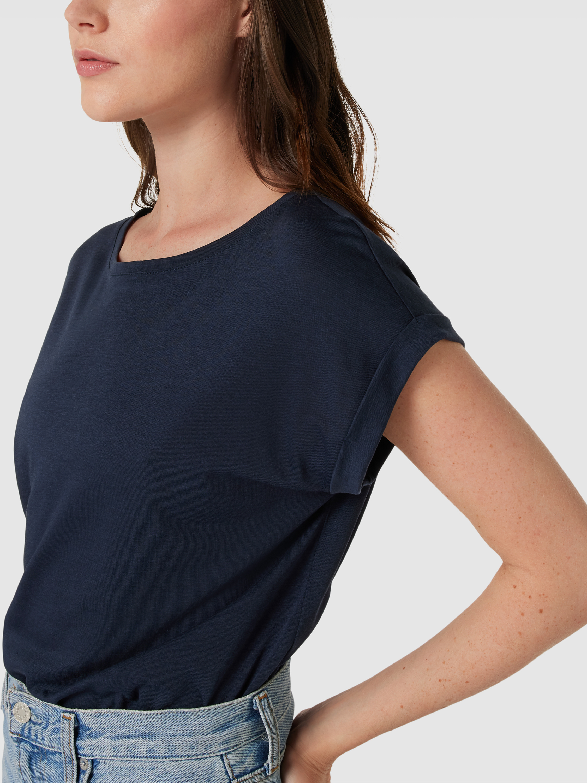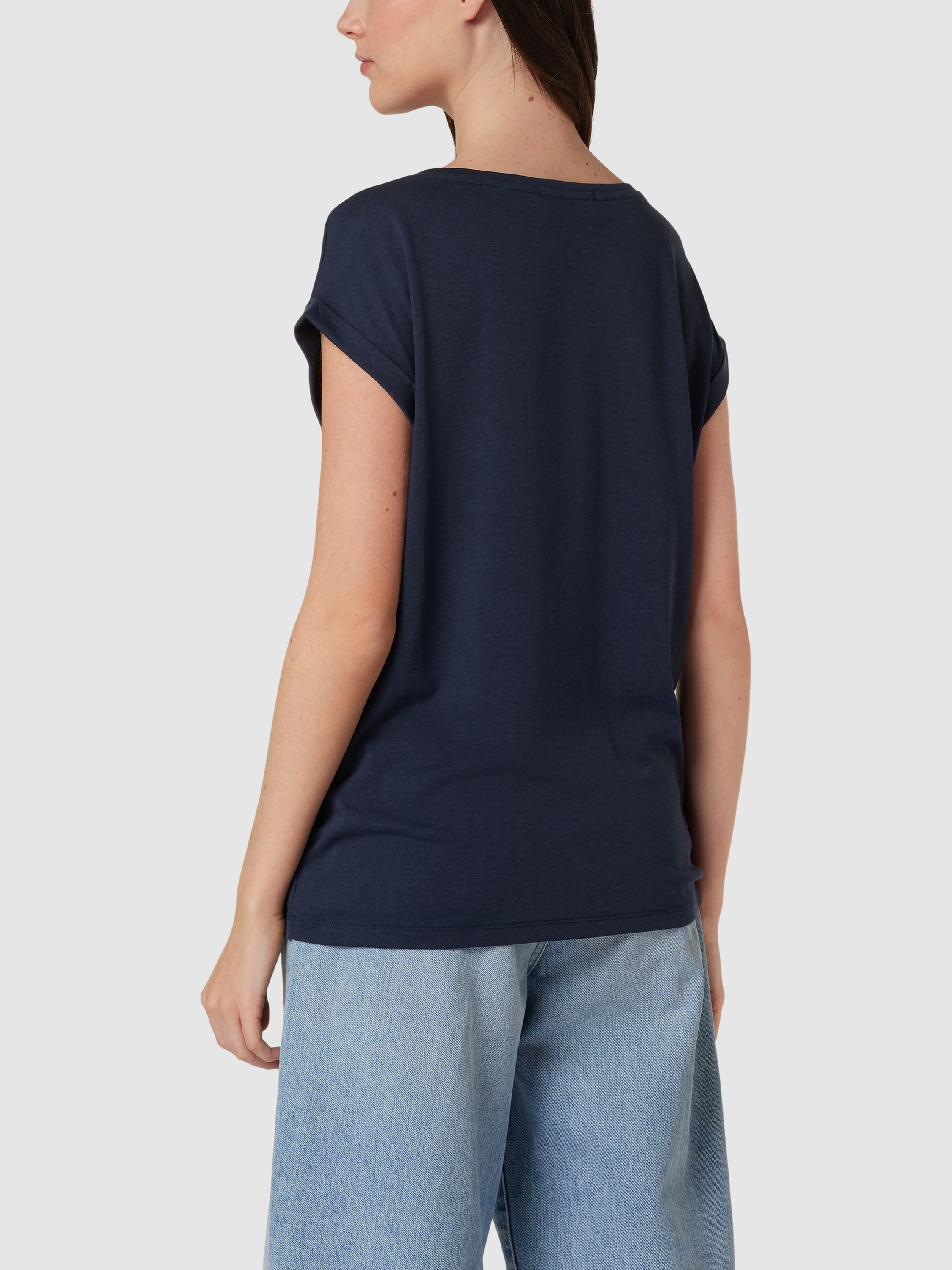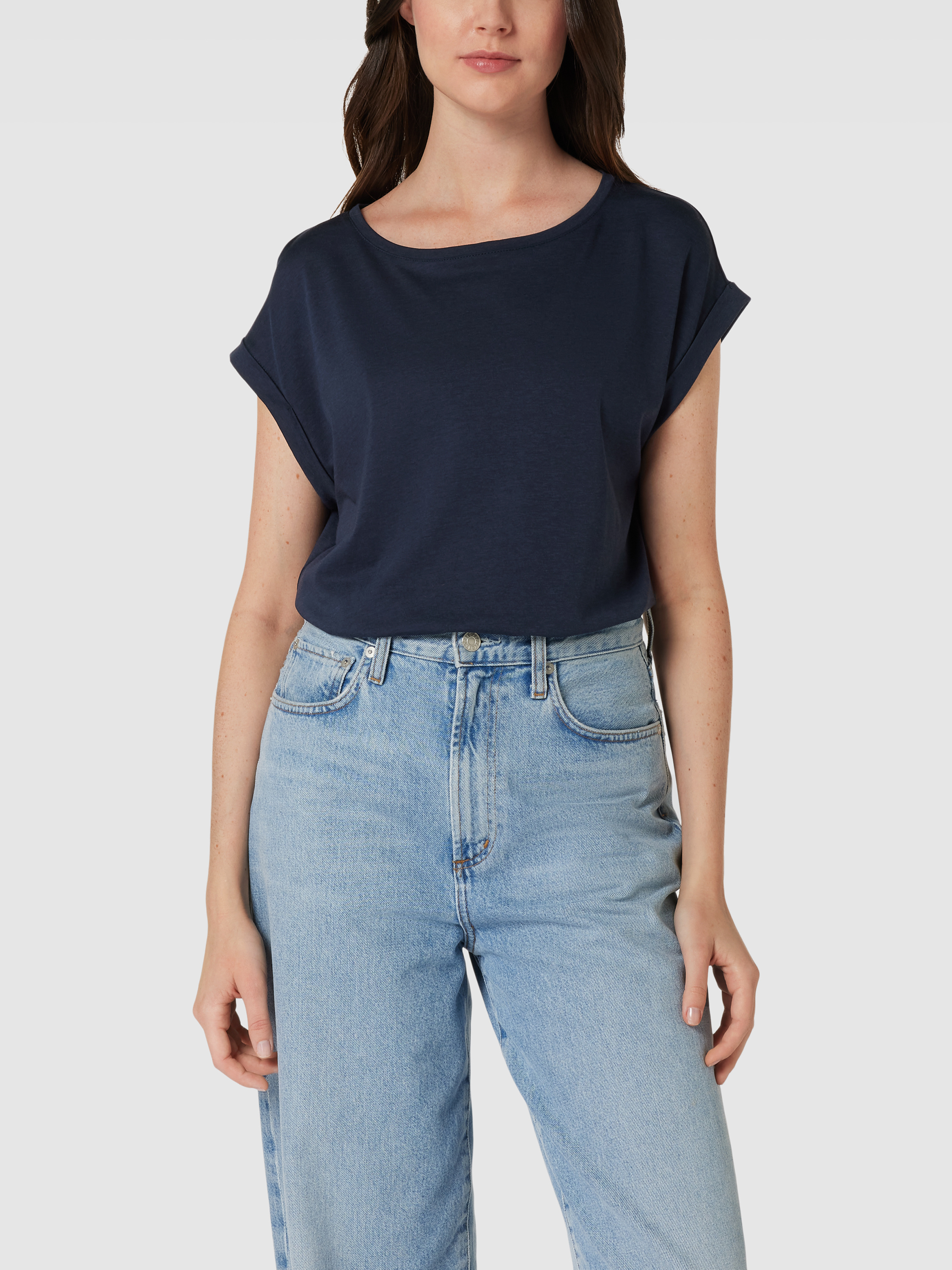 T-shirt met geribde ronde hals, model 'JILAANA' in marineblauw