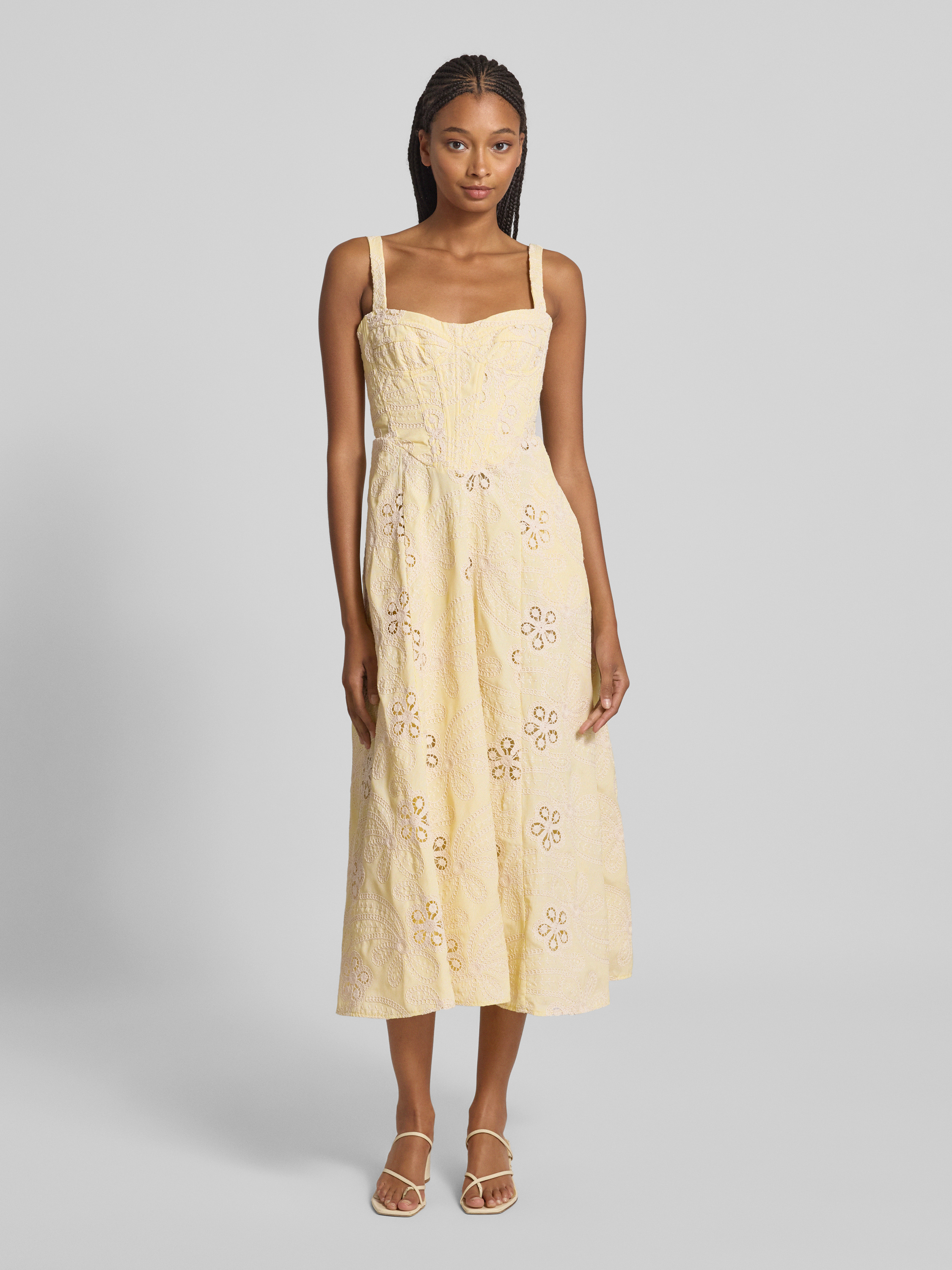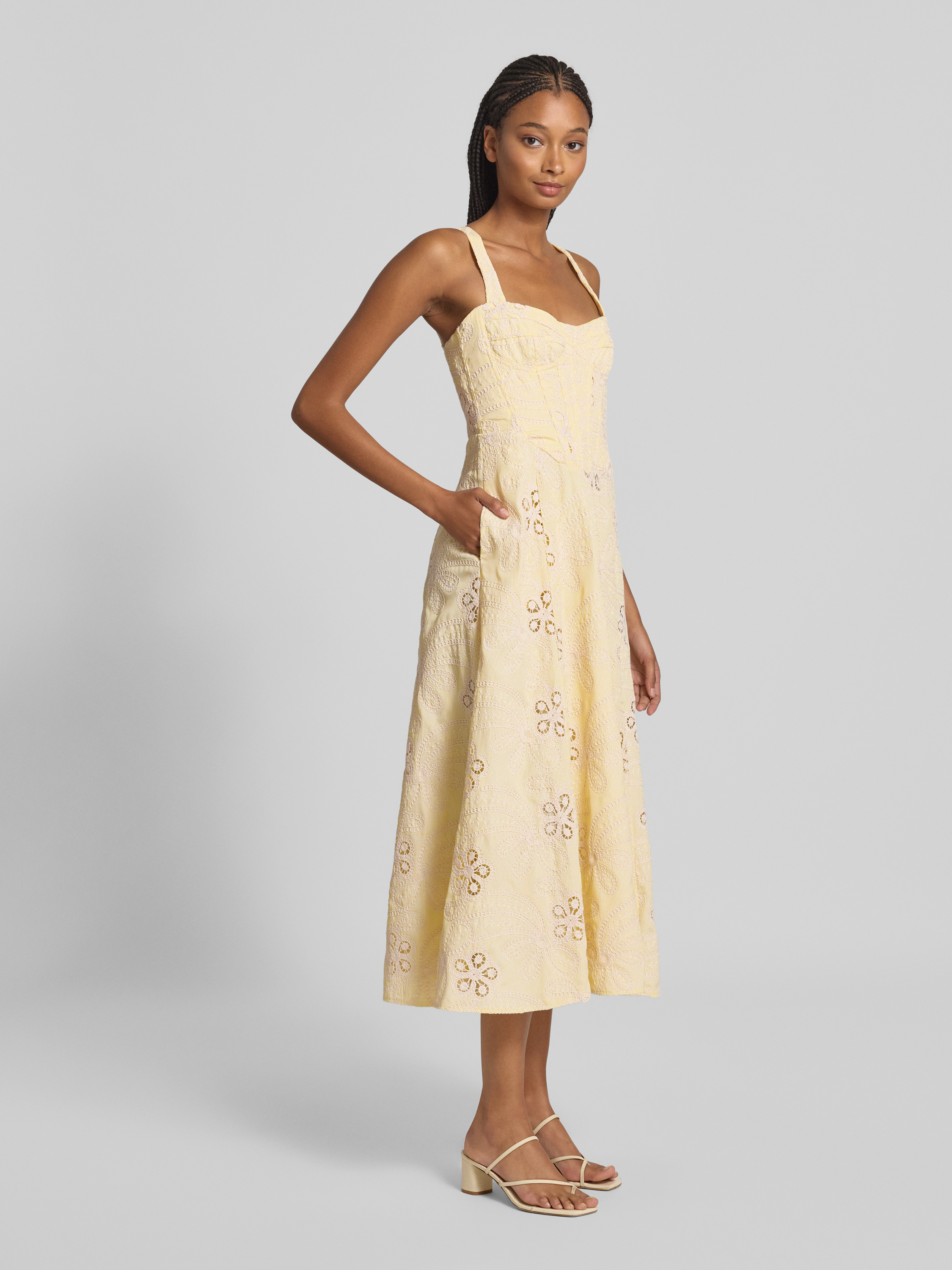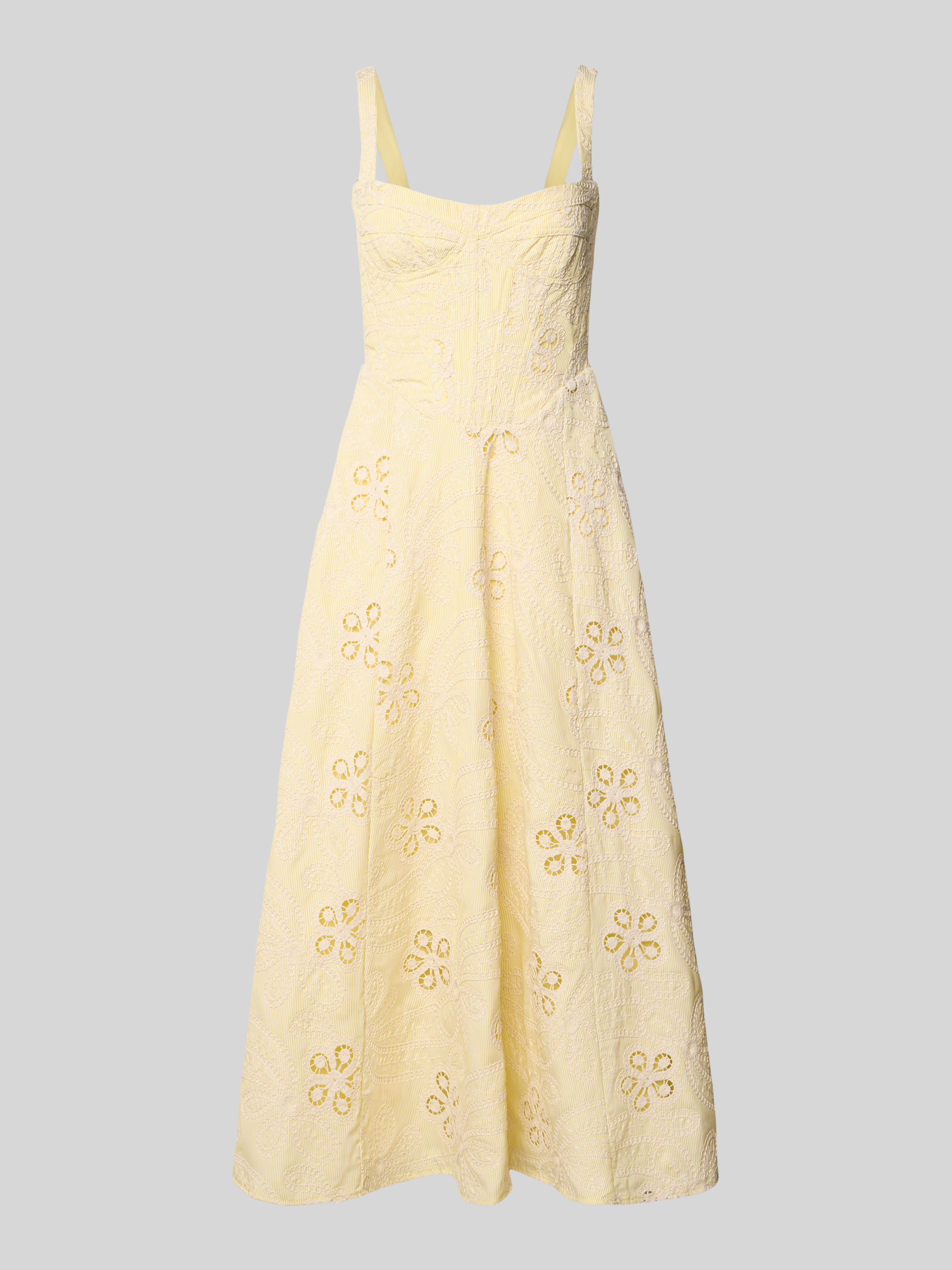 BardotCocktailjurk met broderie anglaise, model 'LILAH' in lichtgeel