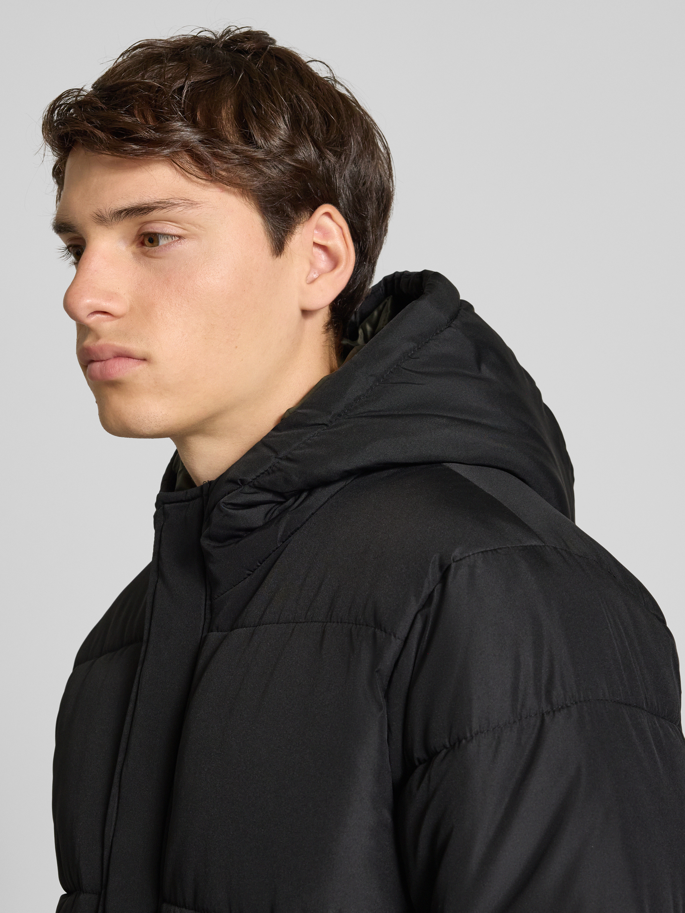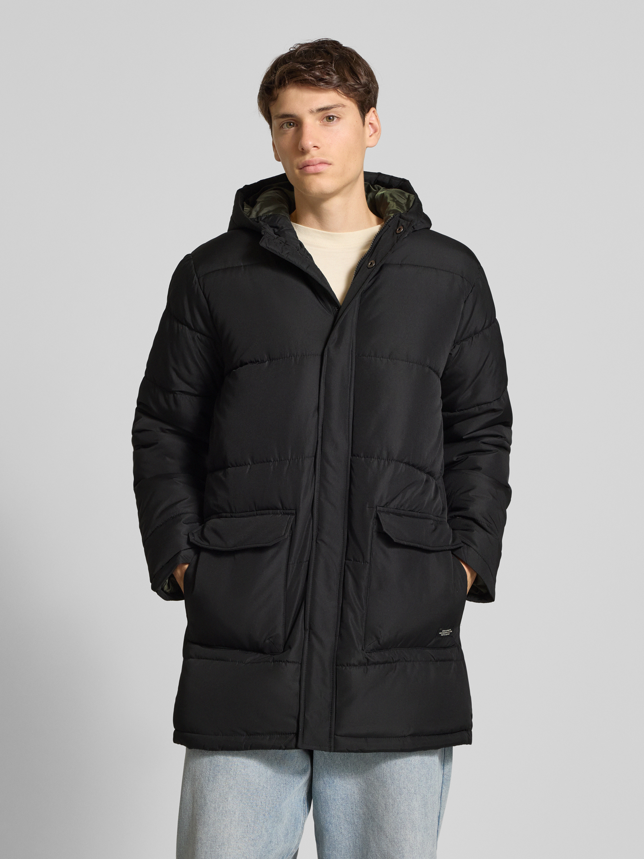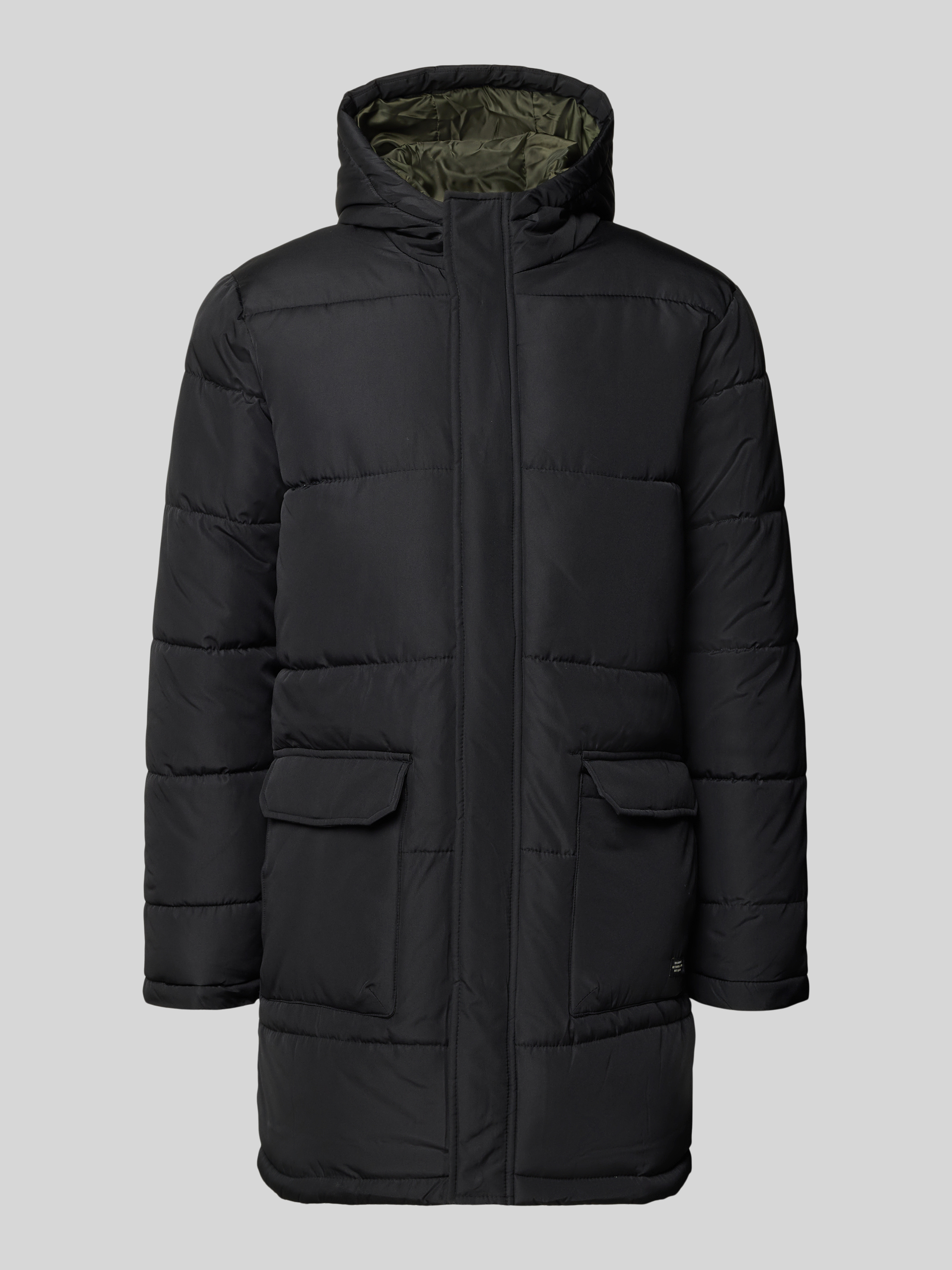 Gewatteerde lange jas met klepzakken, model 'ONLGABI' in zwart