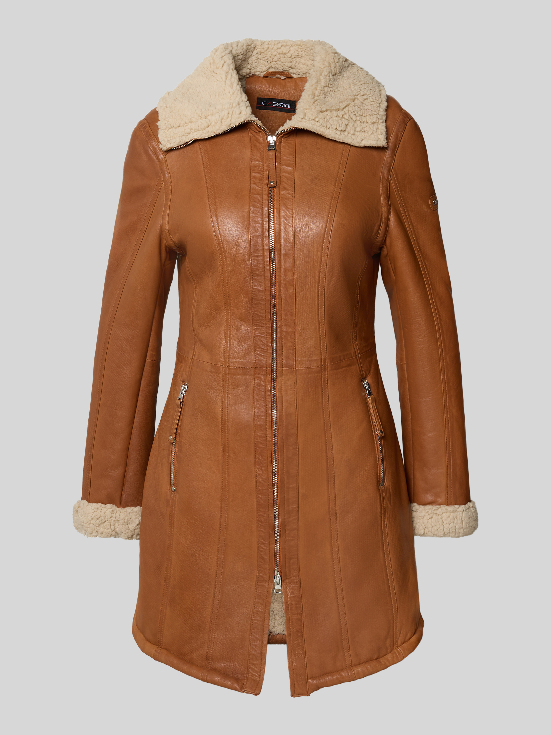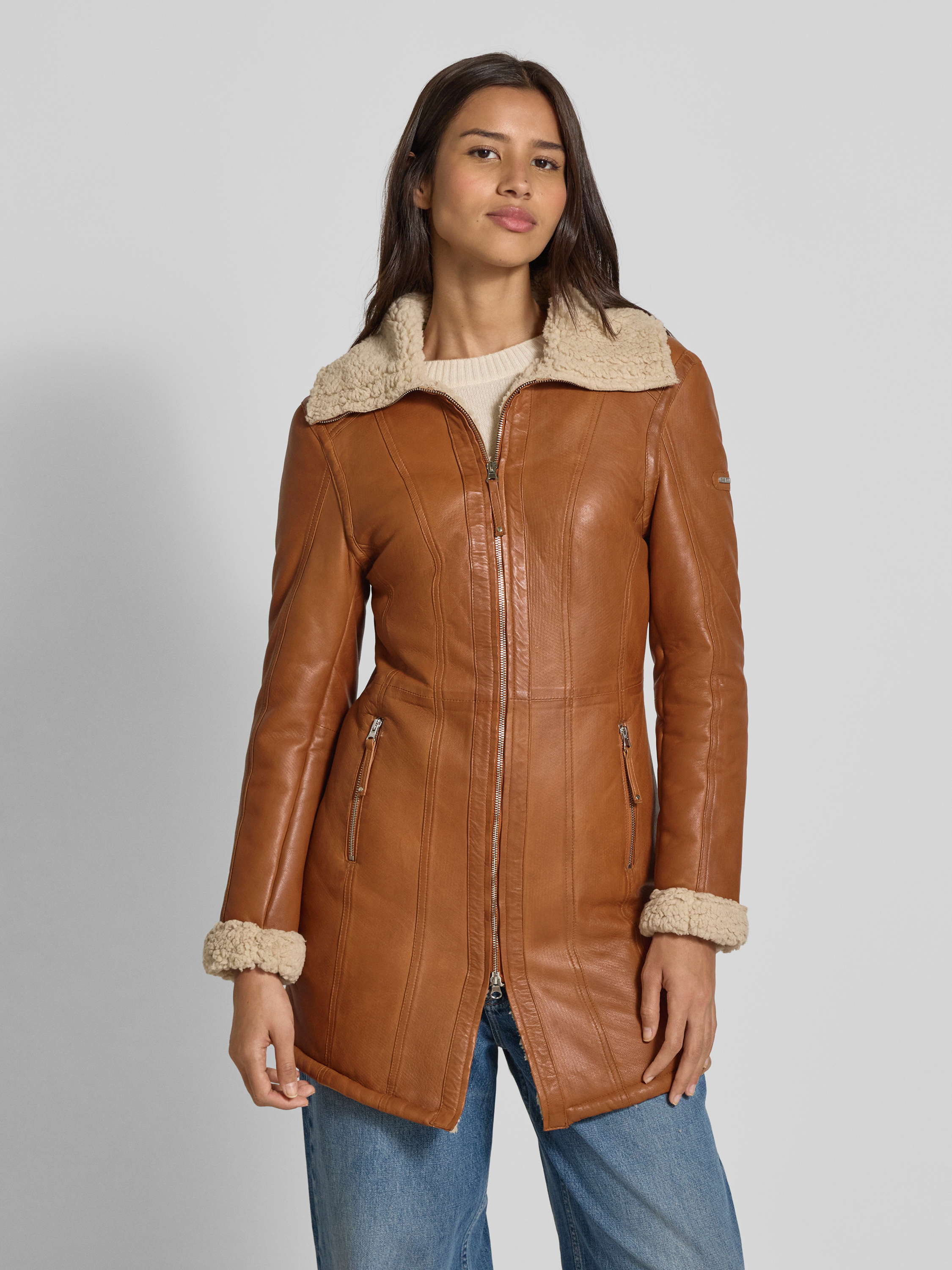 Leren jack met voering van teddybont in cognac