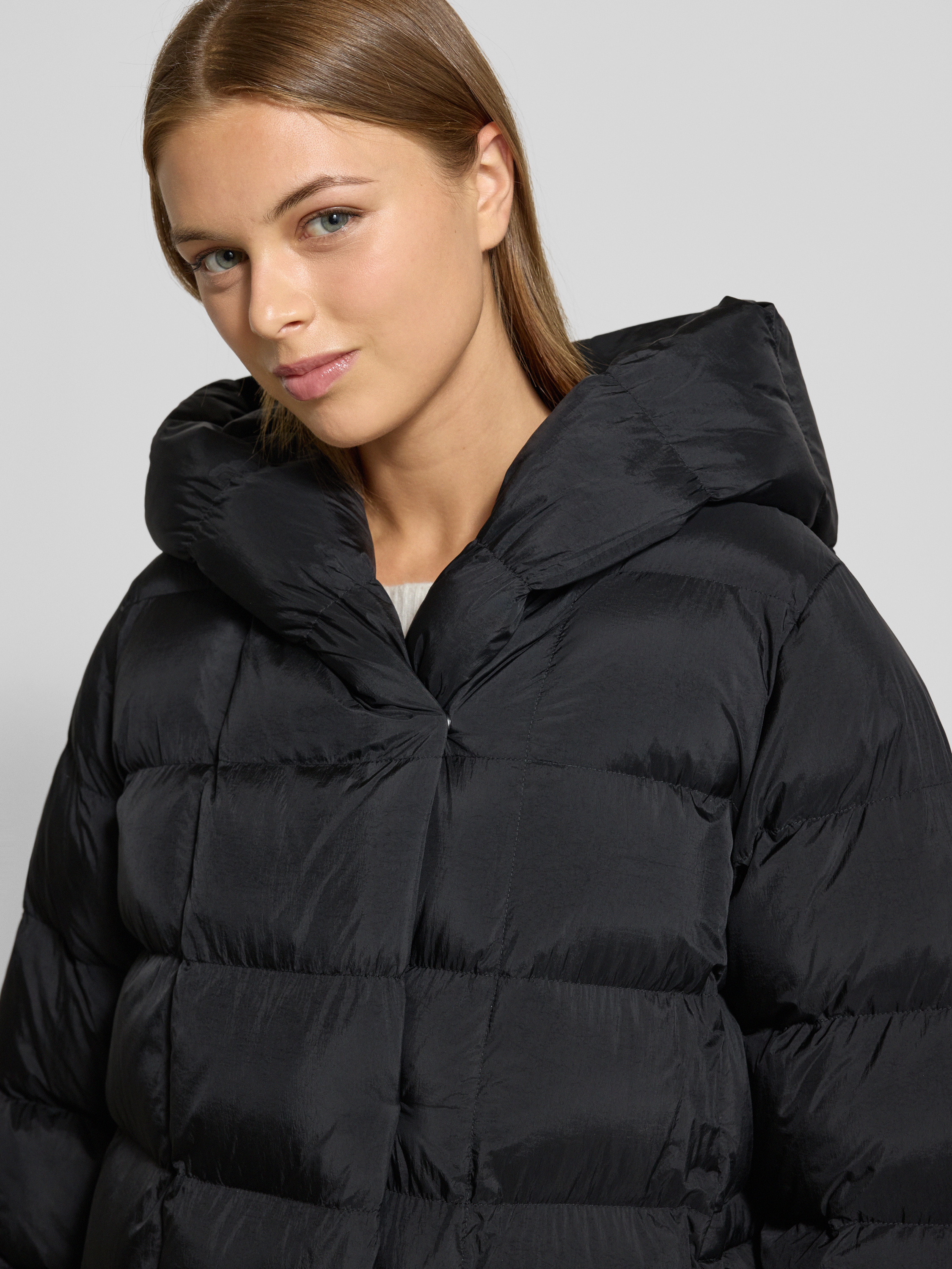 Glanzende gewatteerde lange jas met capuchon in zwart