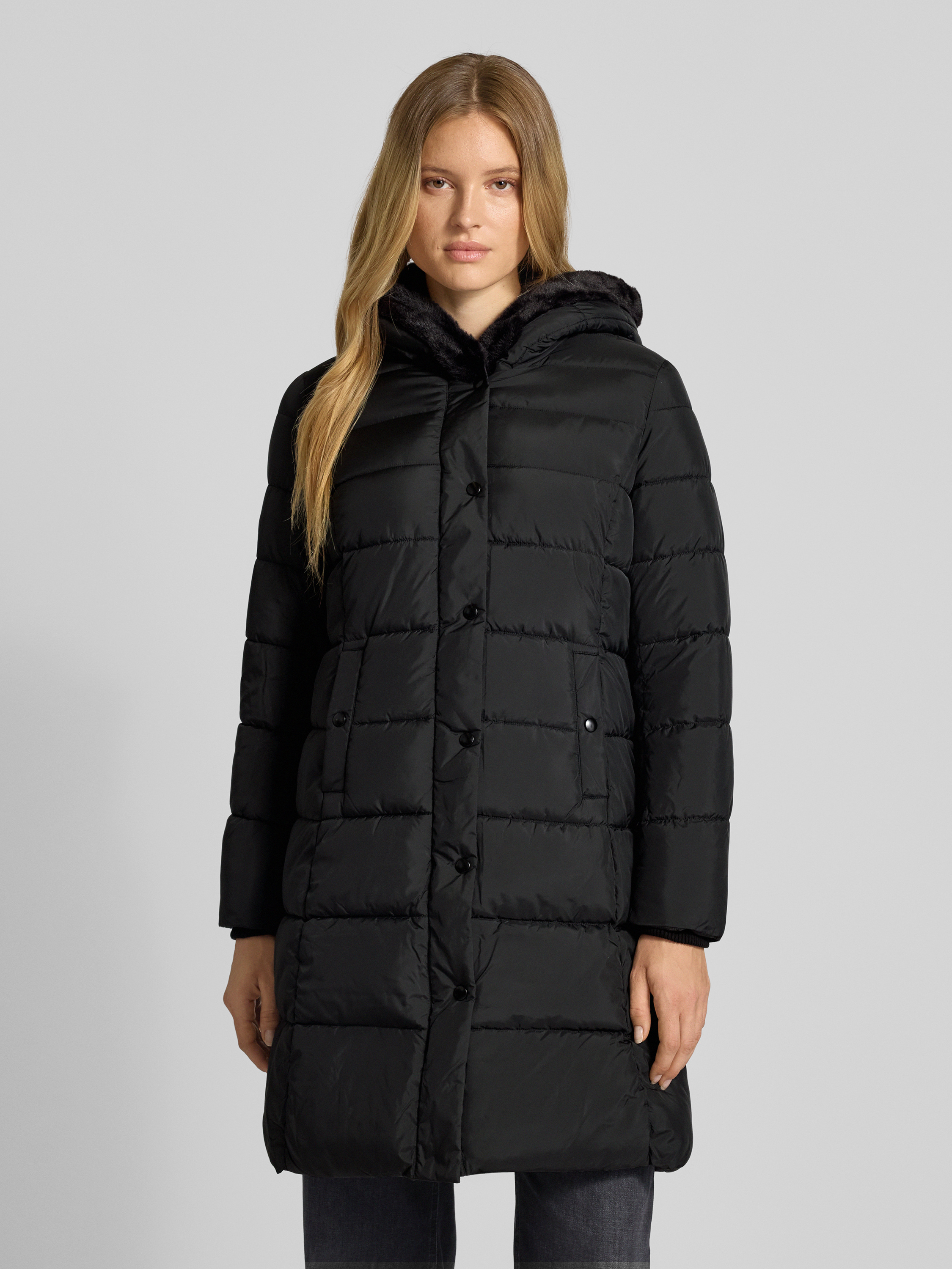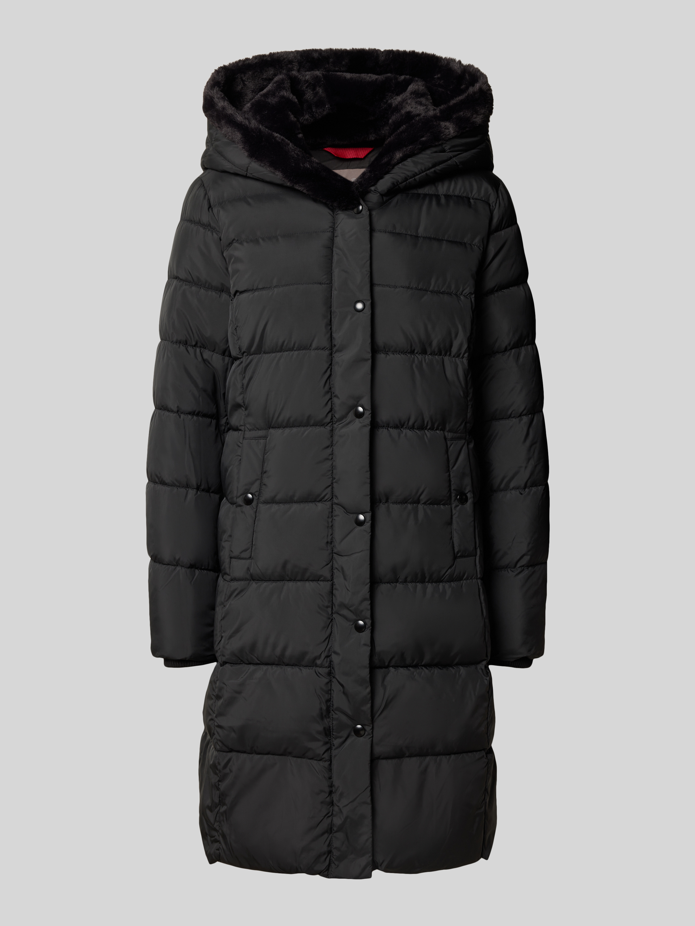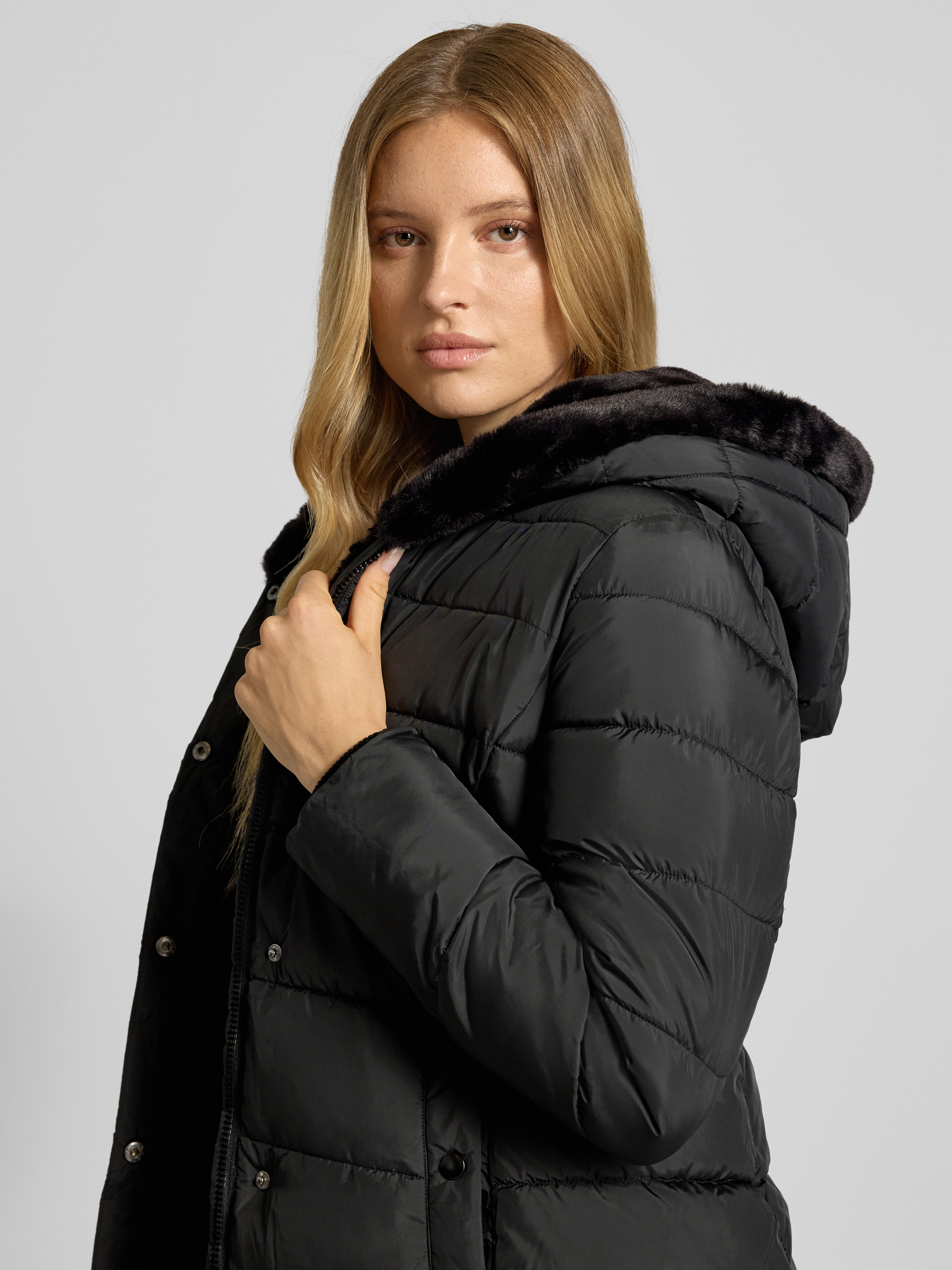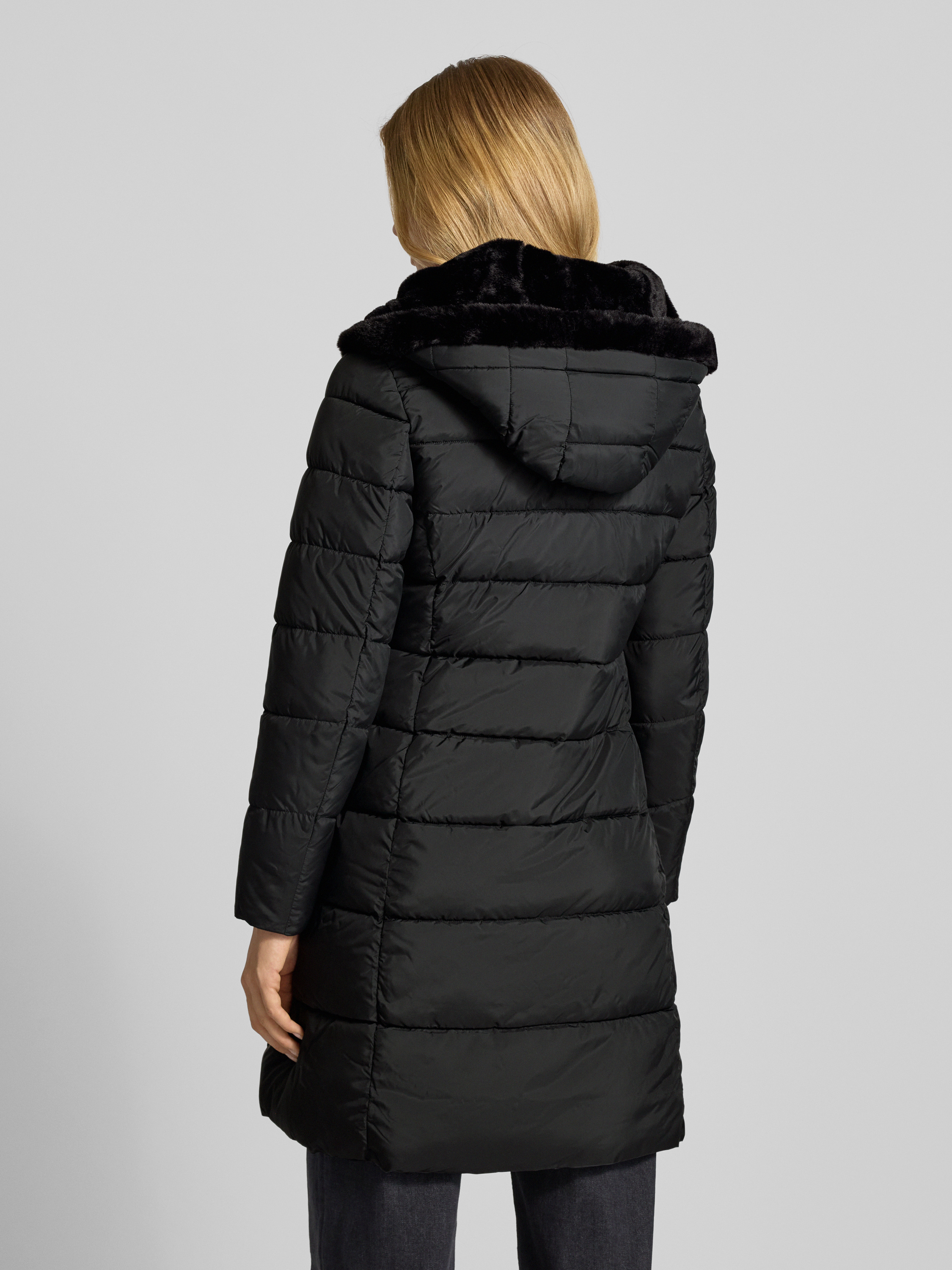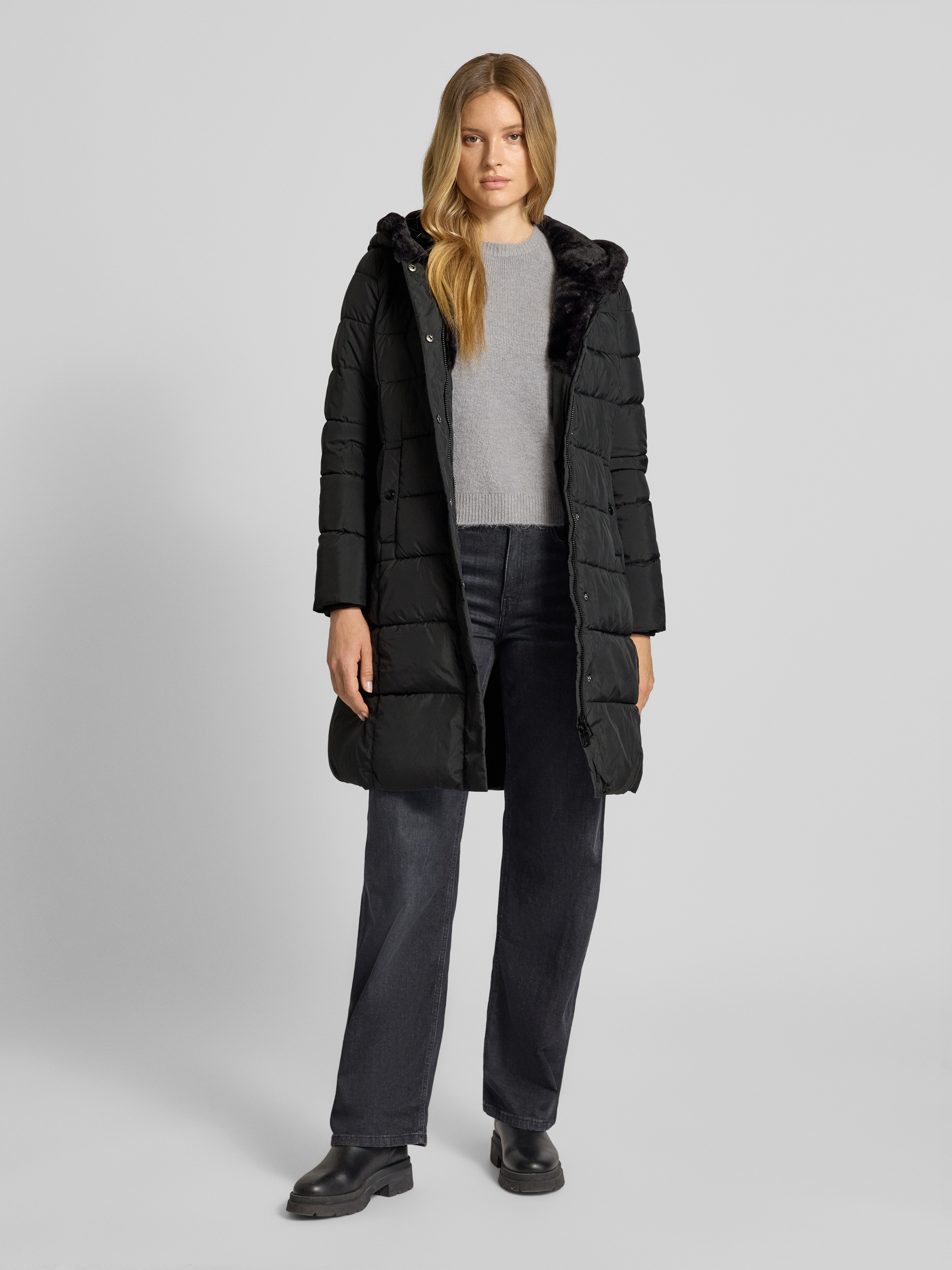 Gewateerde lange jas met imitatiebont en steekzakken in zwart