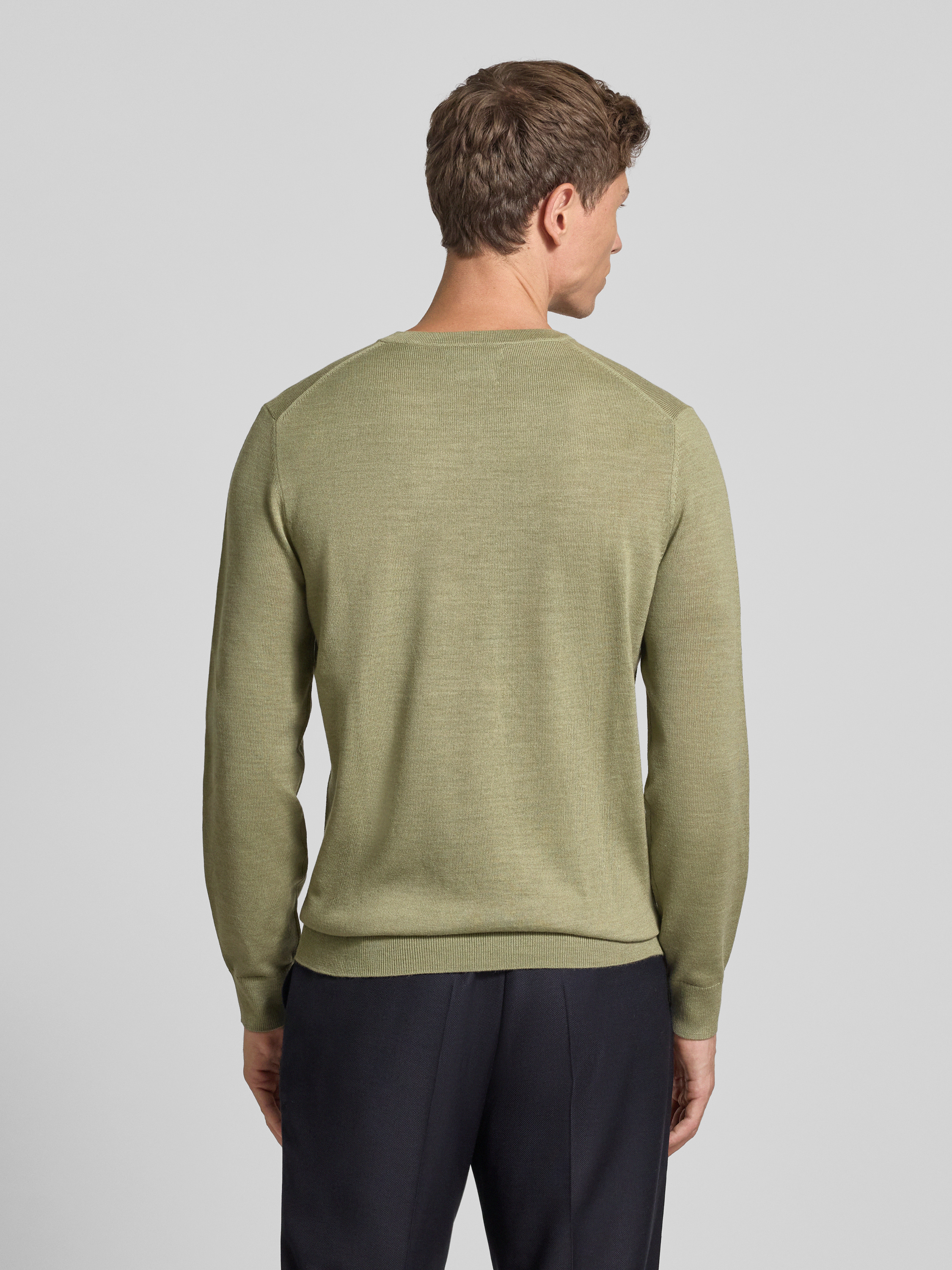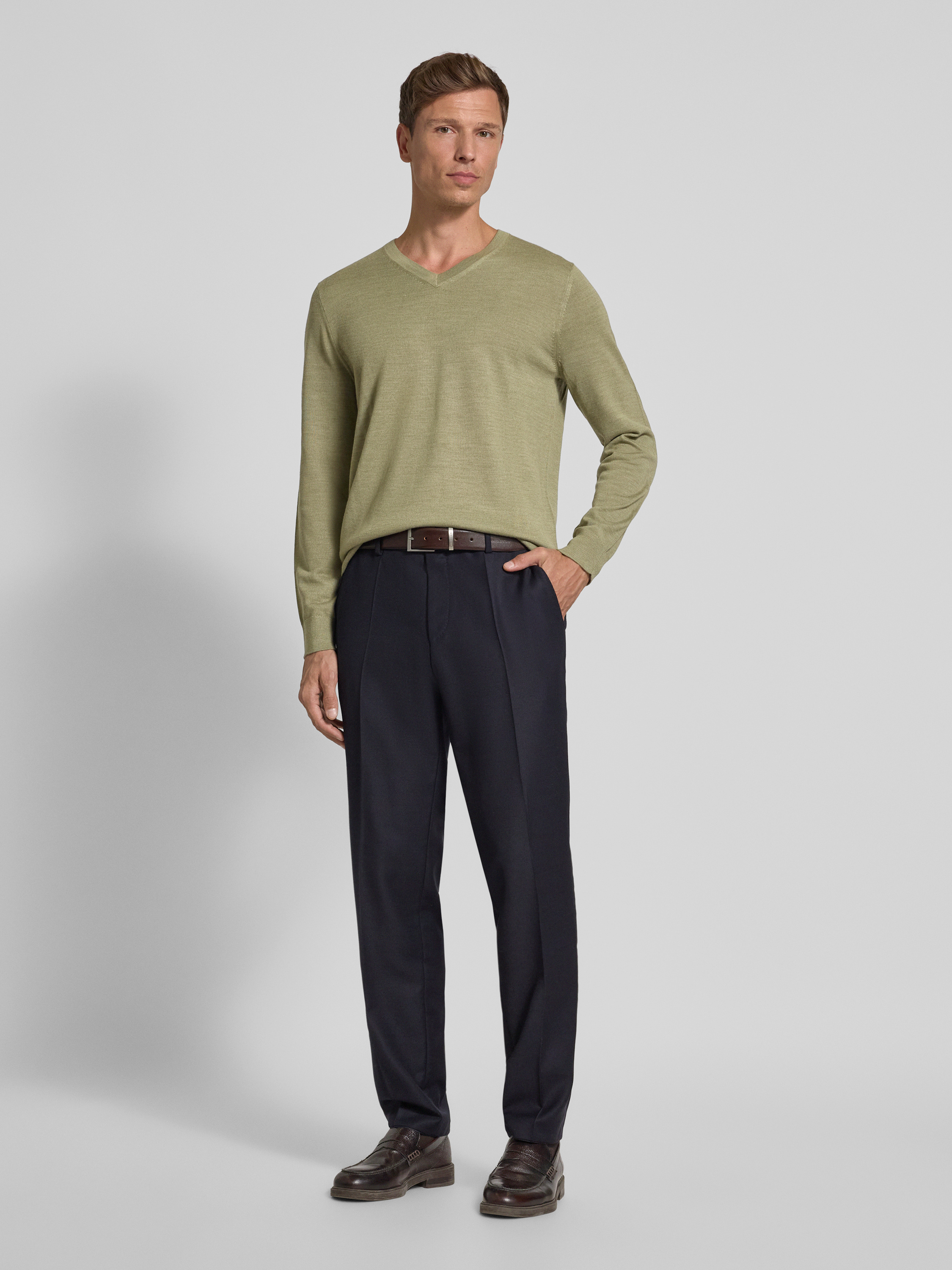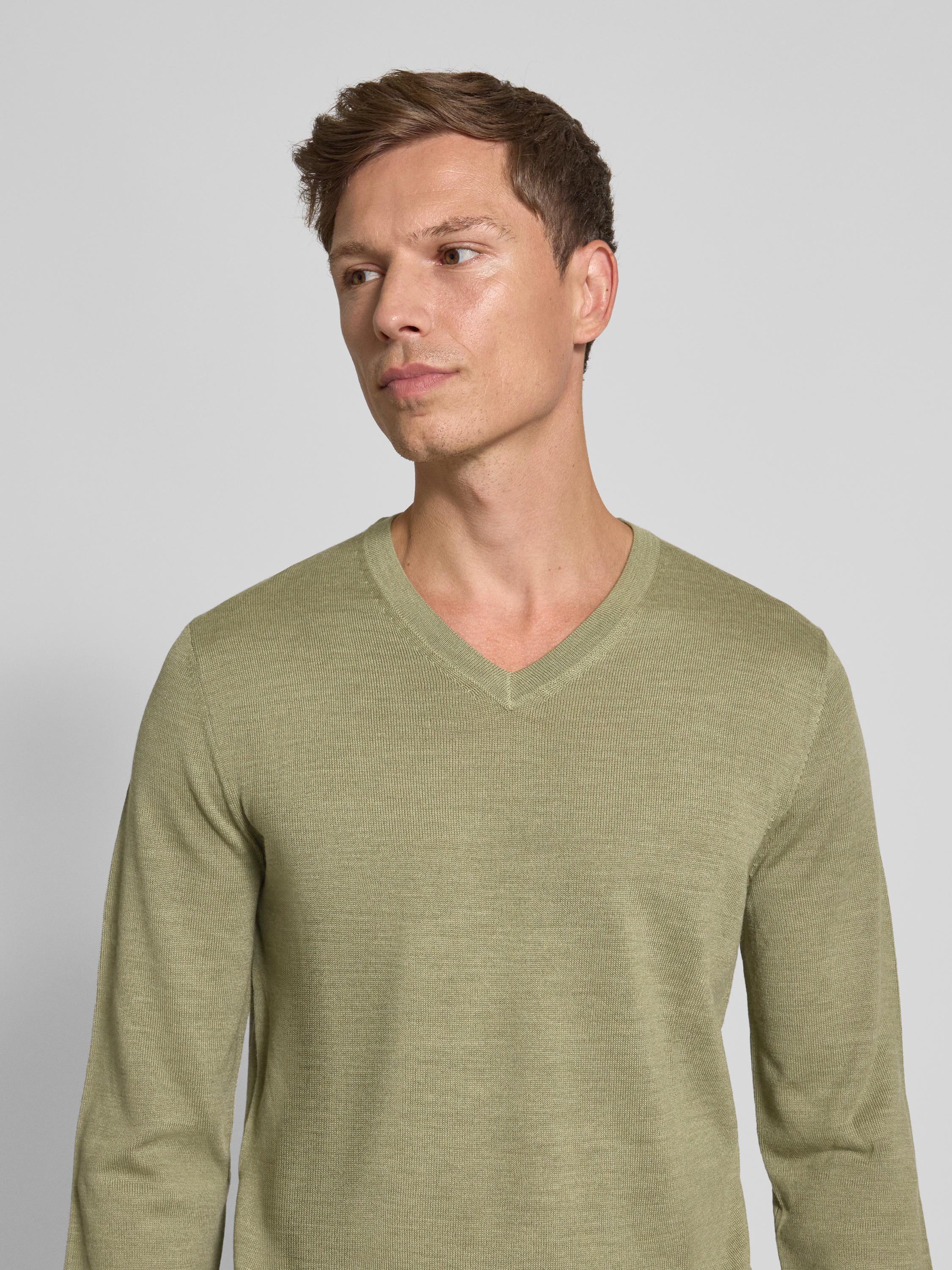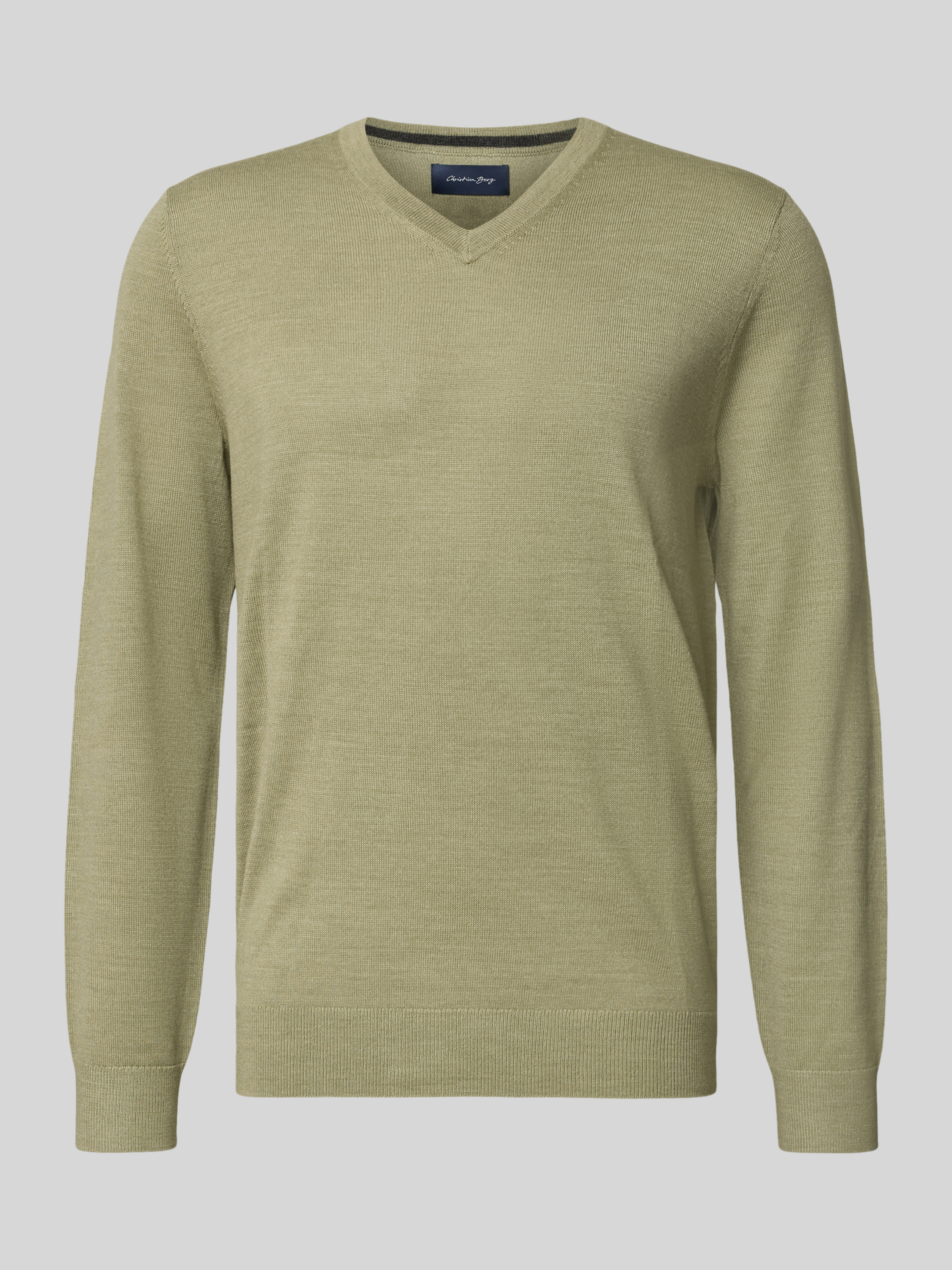 Christian Berg MenGebreide pullover van een mix van merinowol met V-hals in olijfgroen gemêleerd