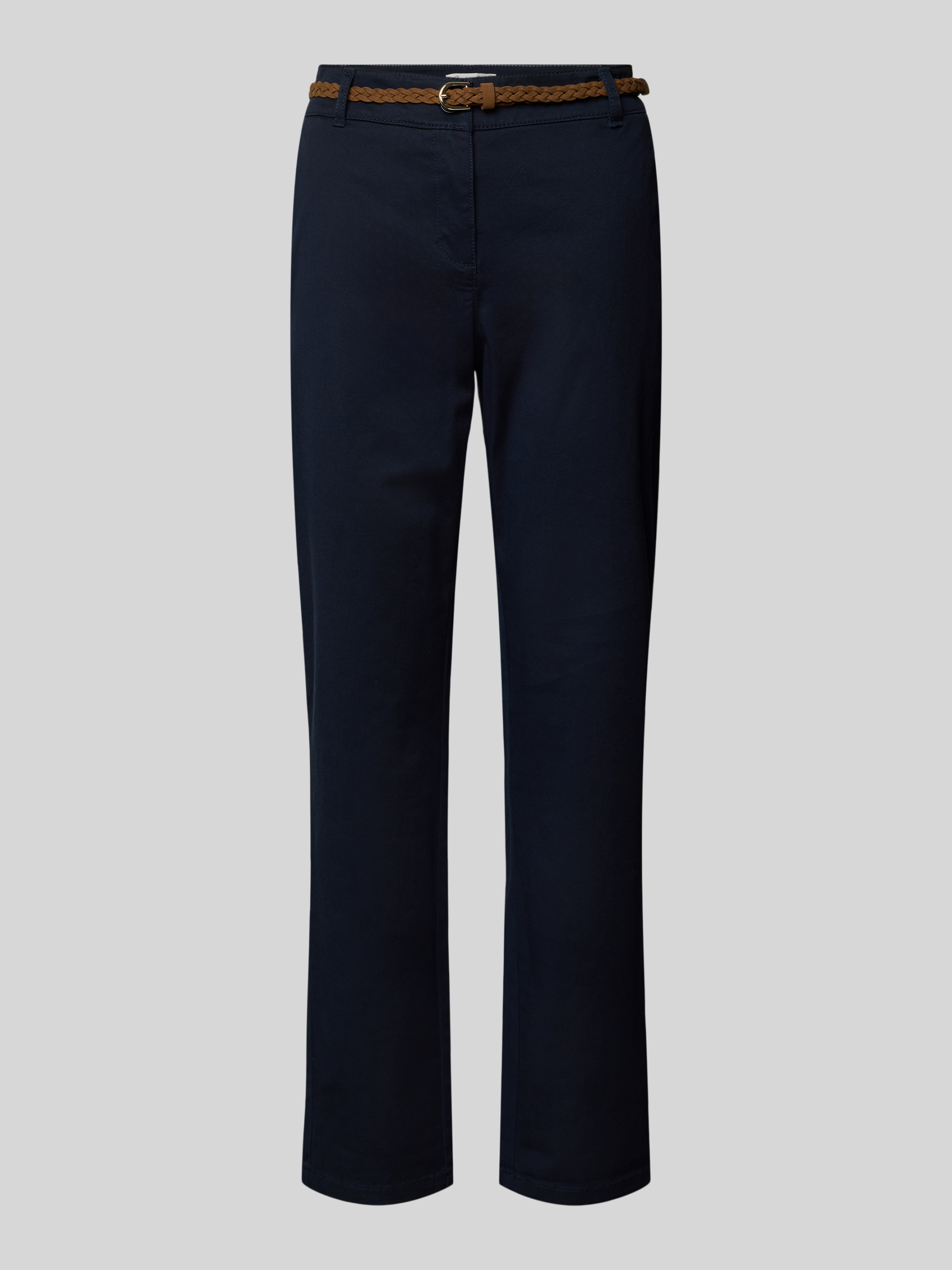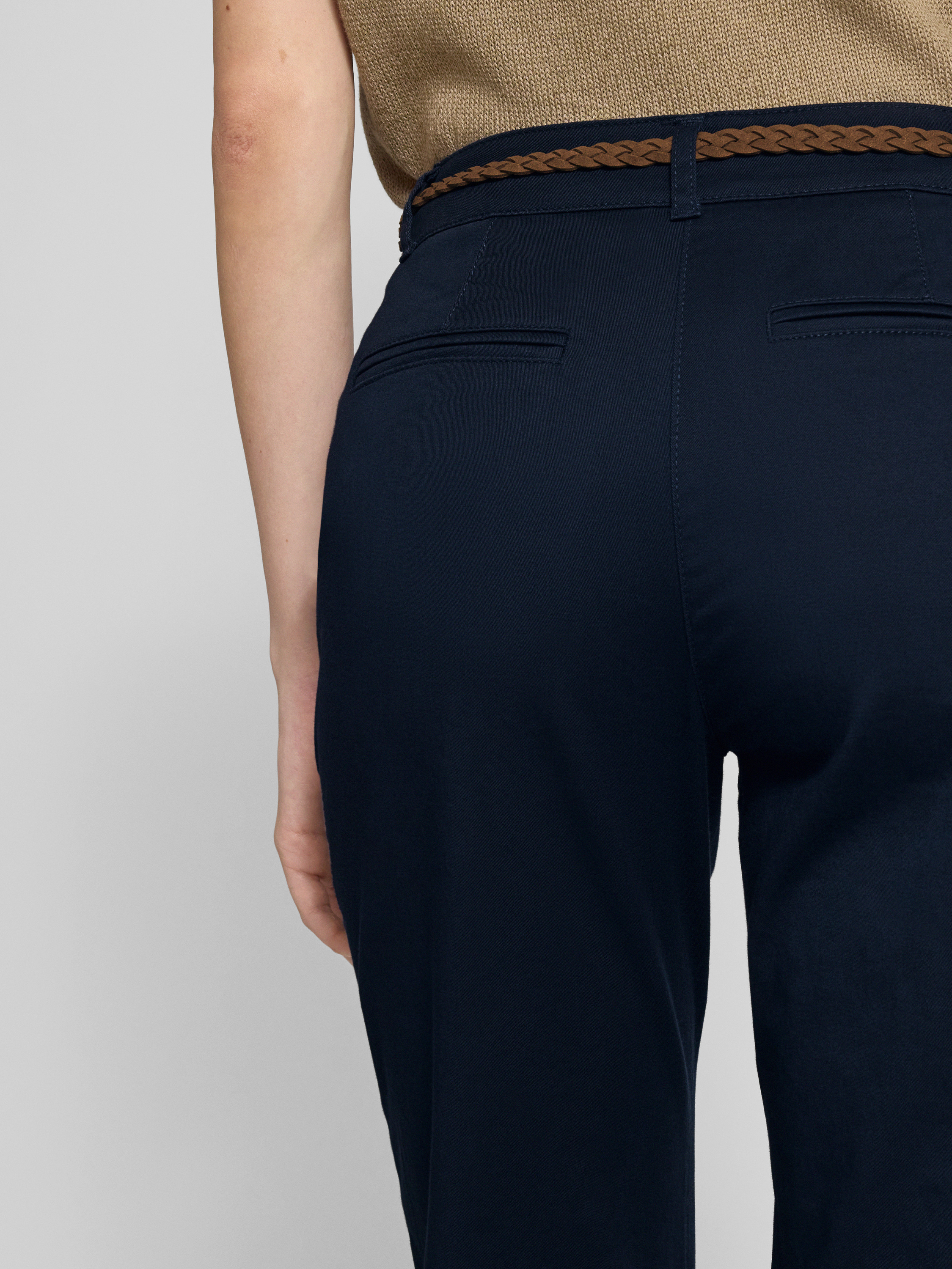 Chino met paspelzakken aan de achterkant en riem in donkerblauw