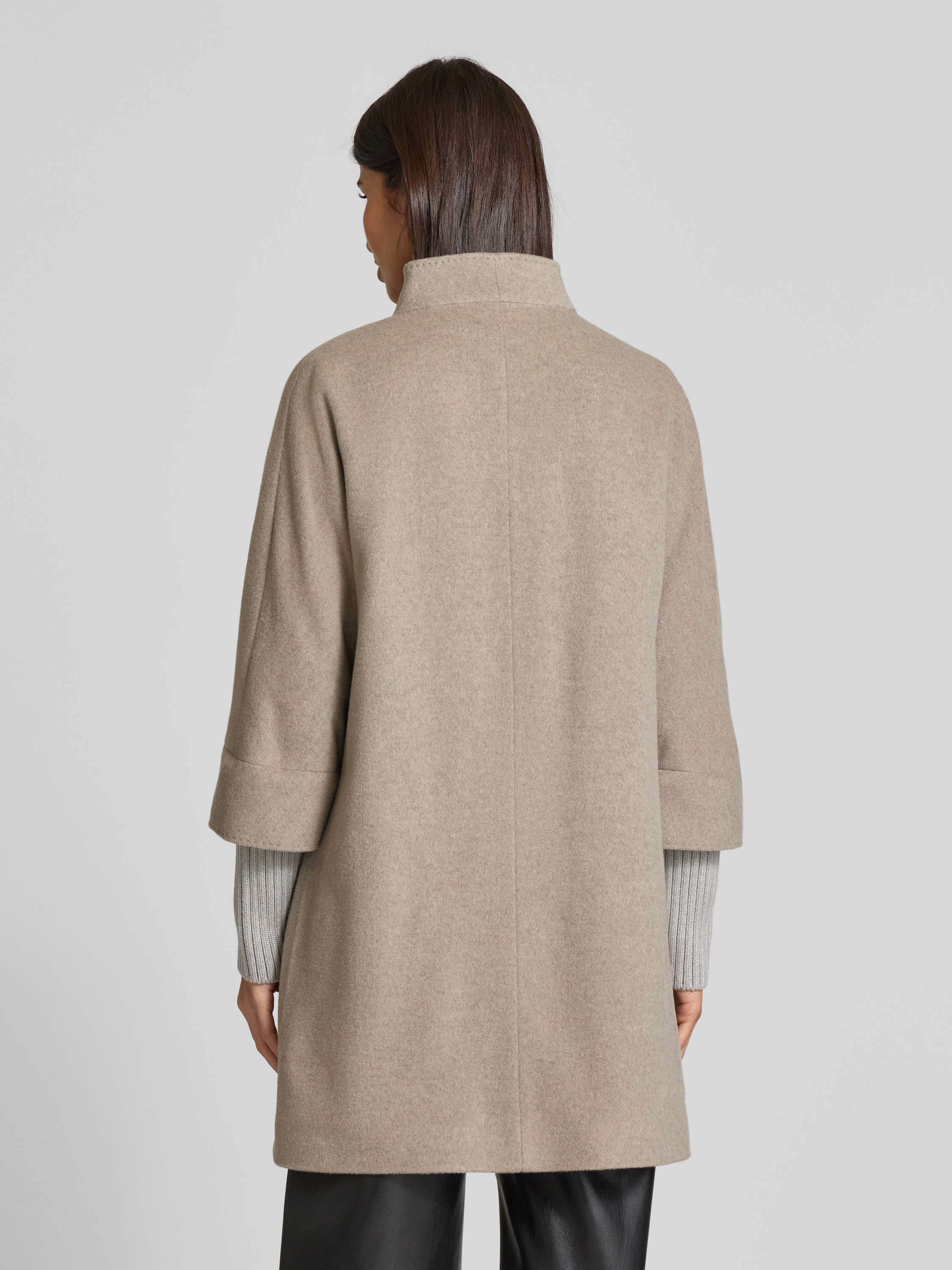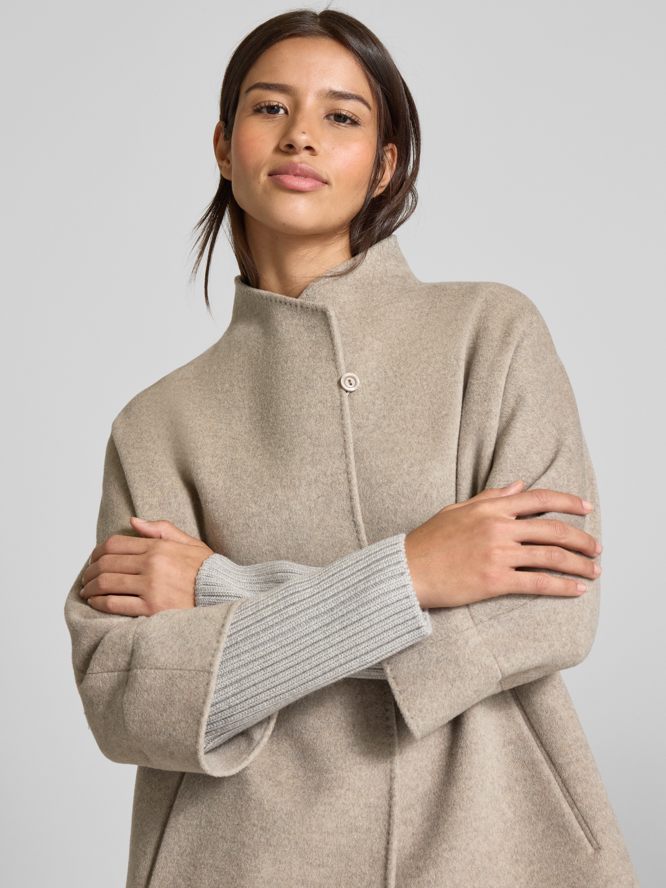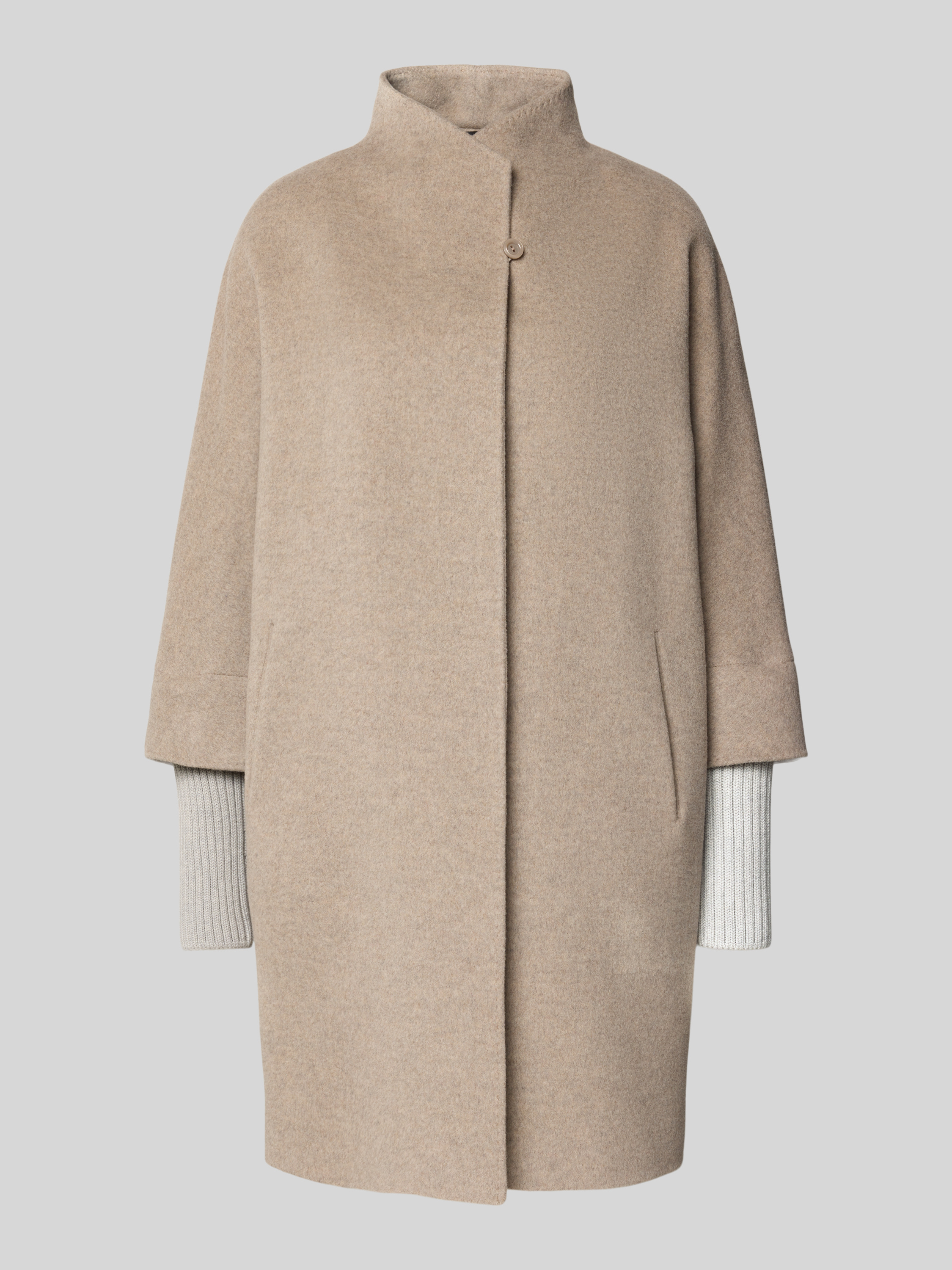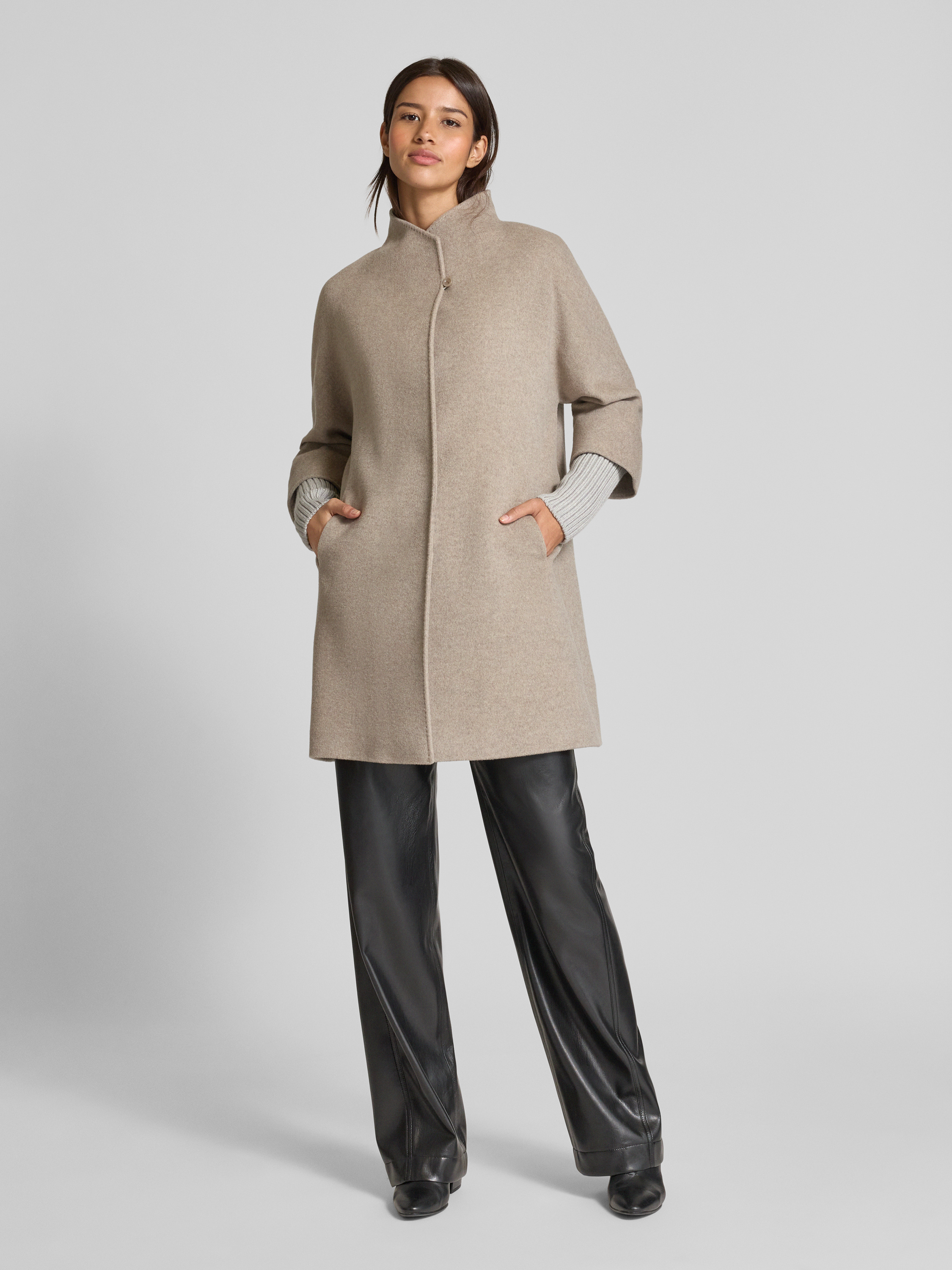 Lange jas van scheerwol met opstaande kraag in beige gemêleerd