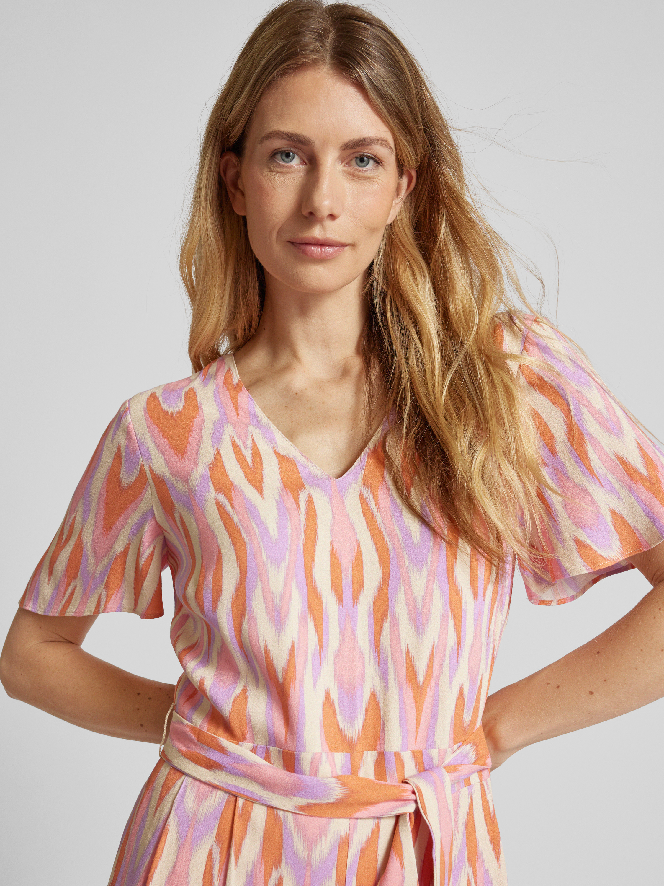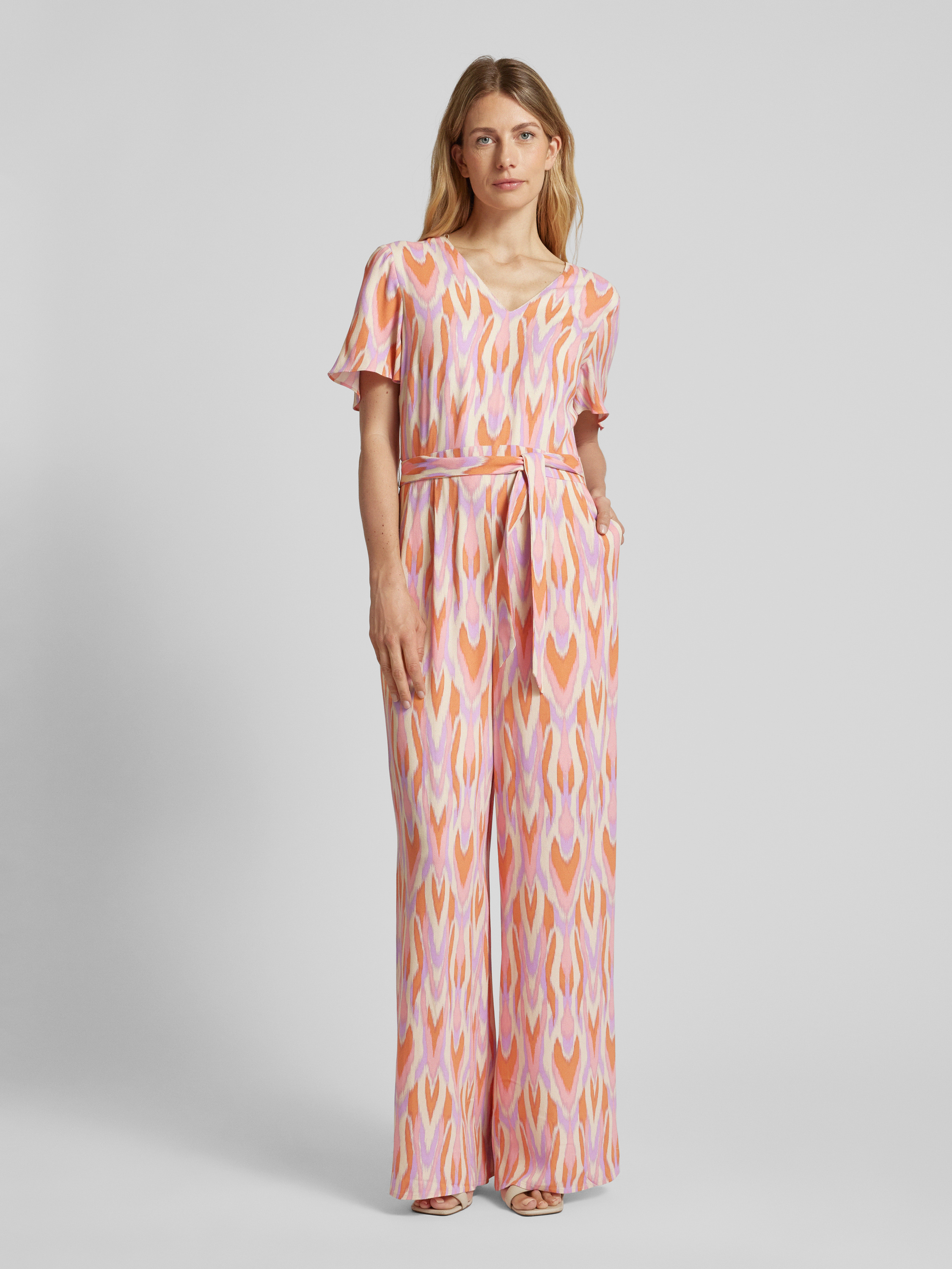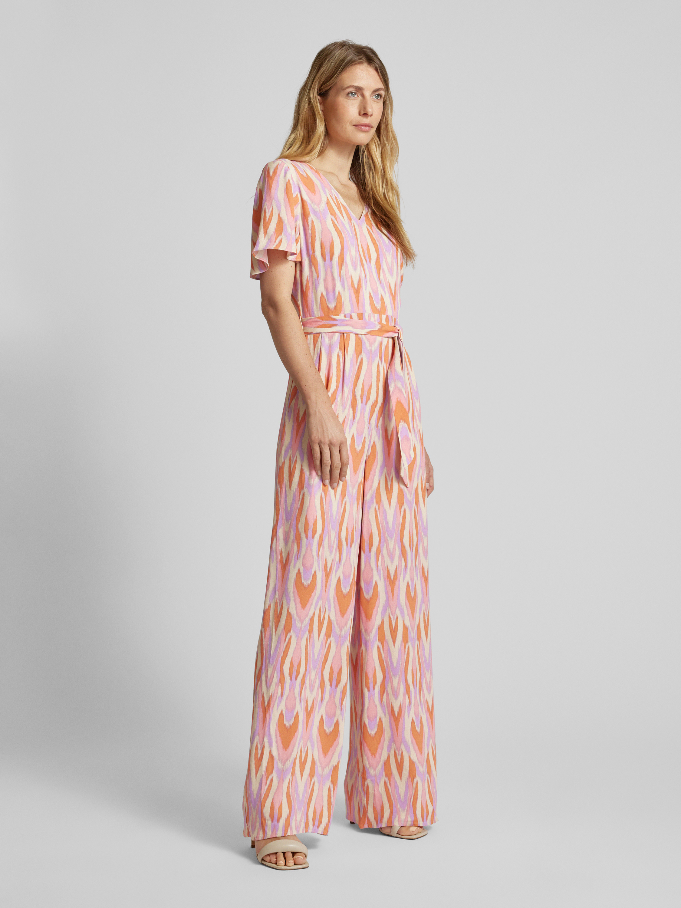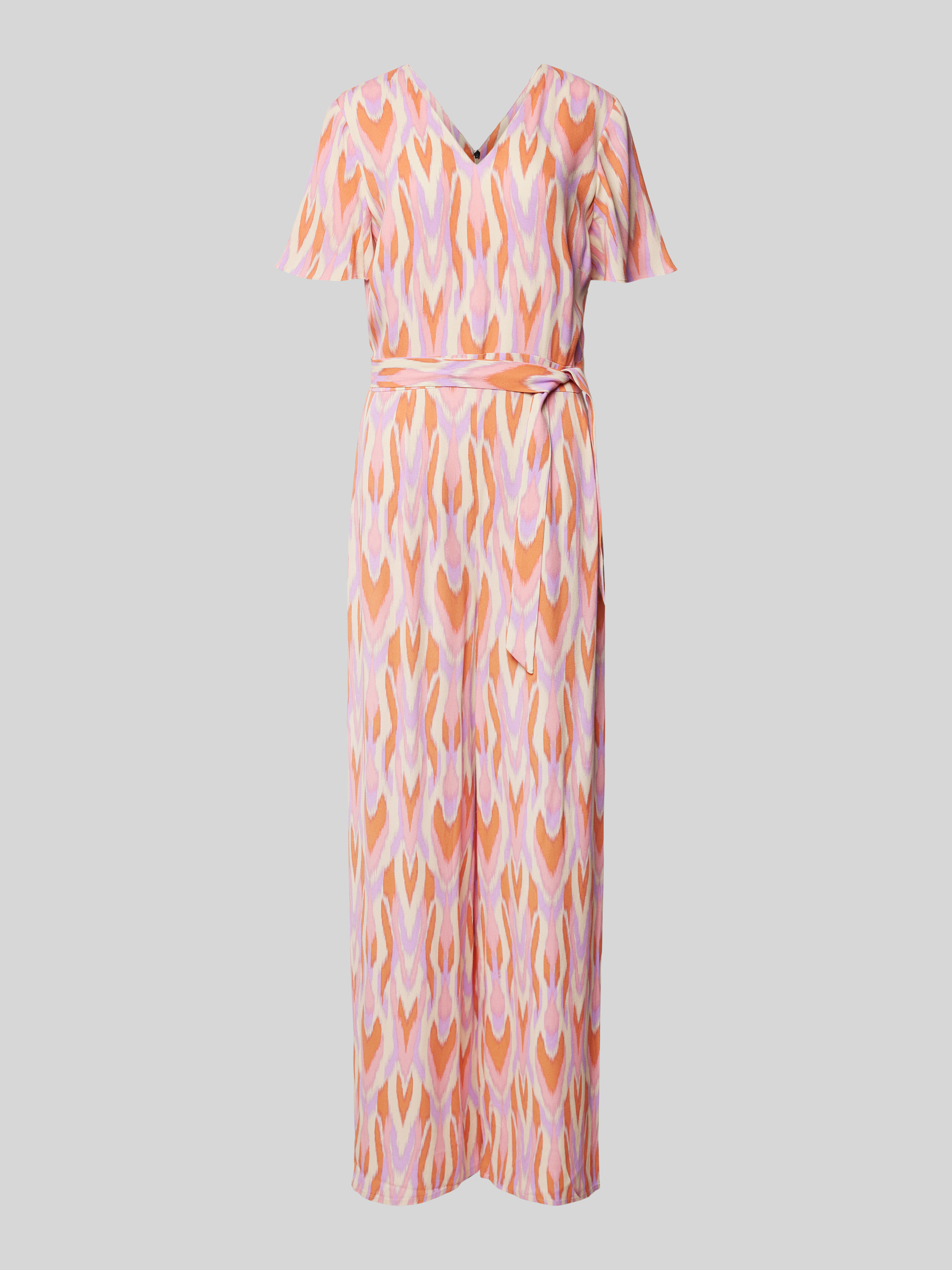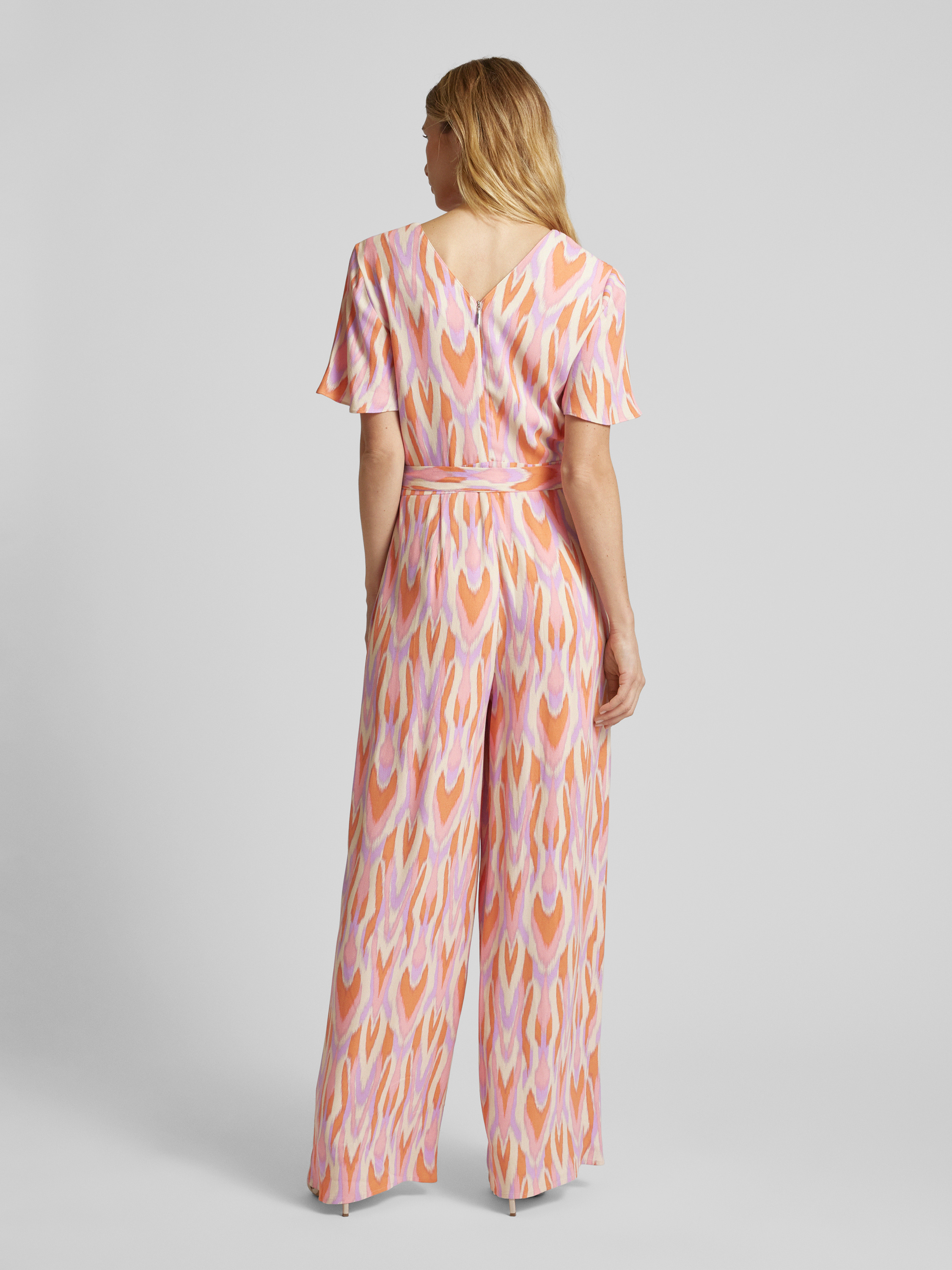 commaJumpsuit van viscose met all-over motief en strikceintuur in felroze