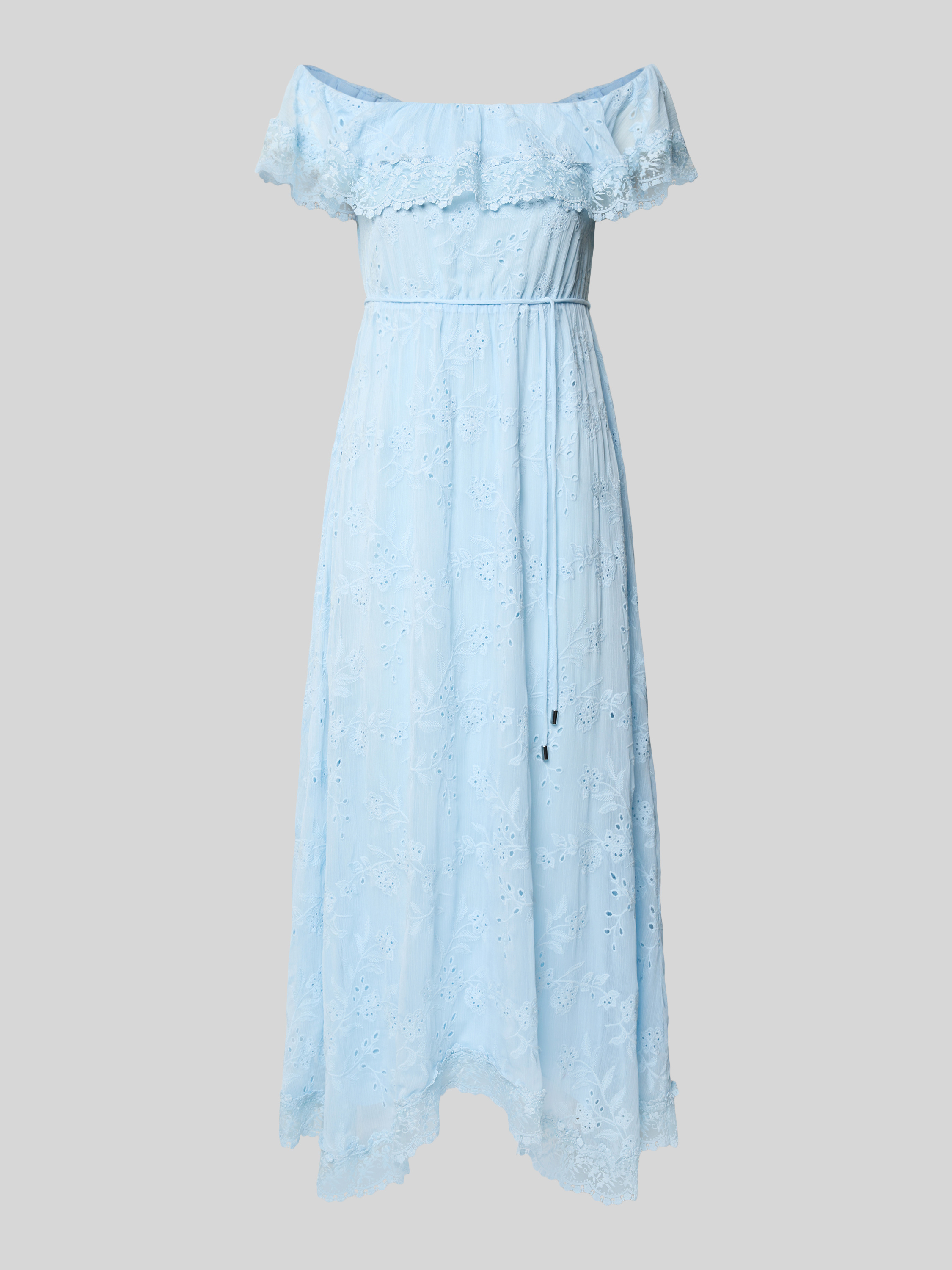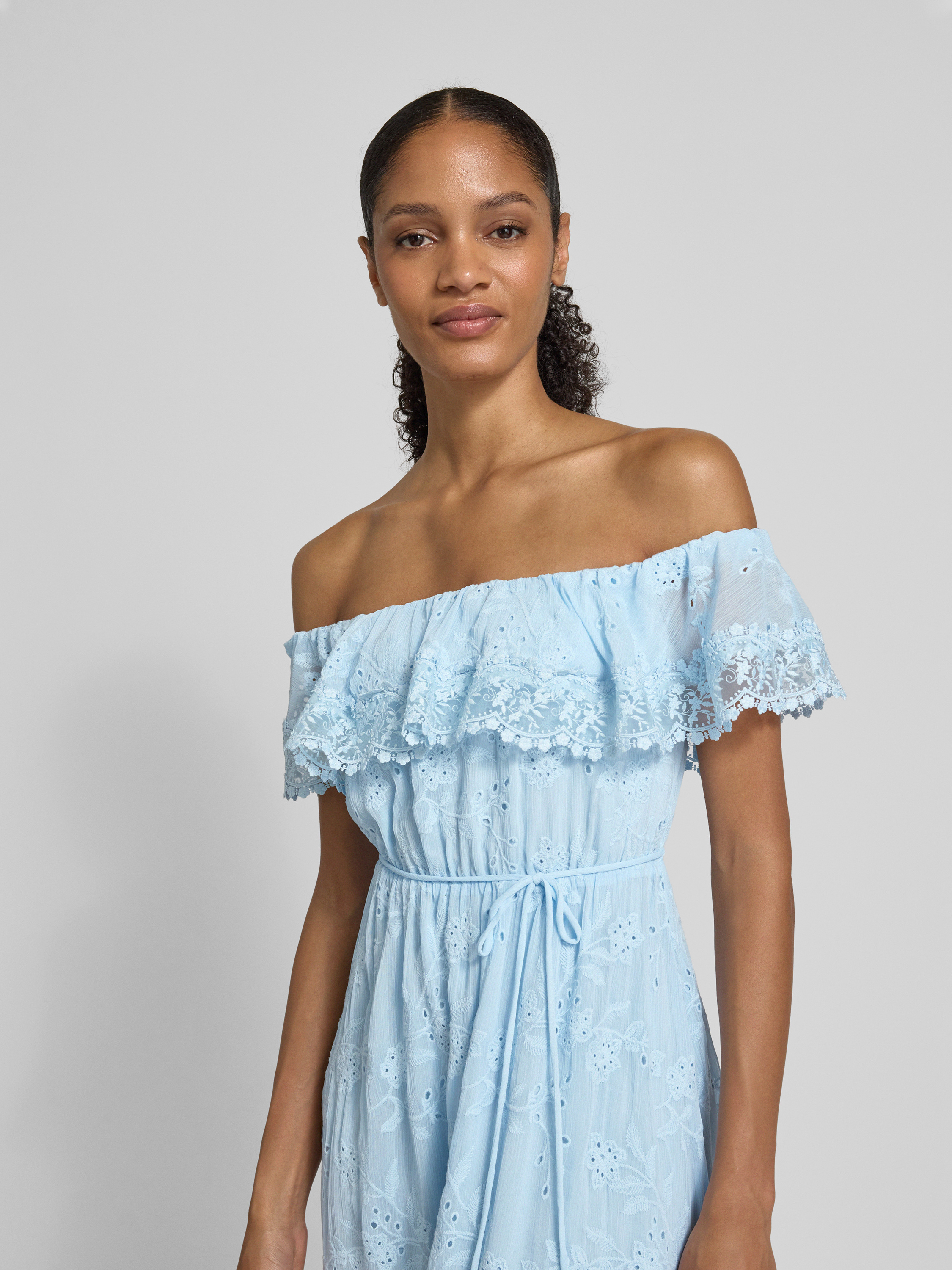 Avondjurk met broderie anglaise en strikceintuur in lichtblauw