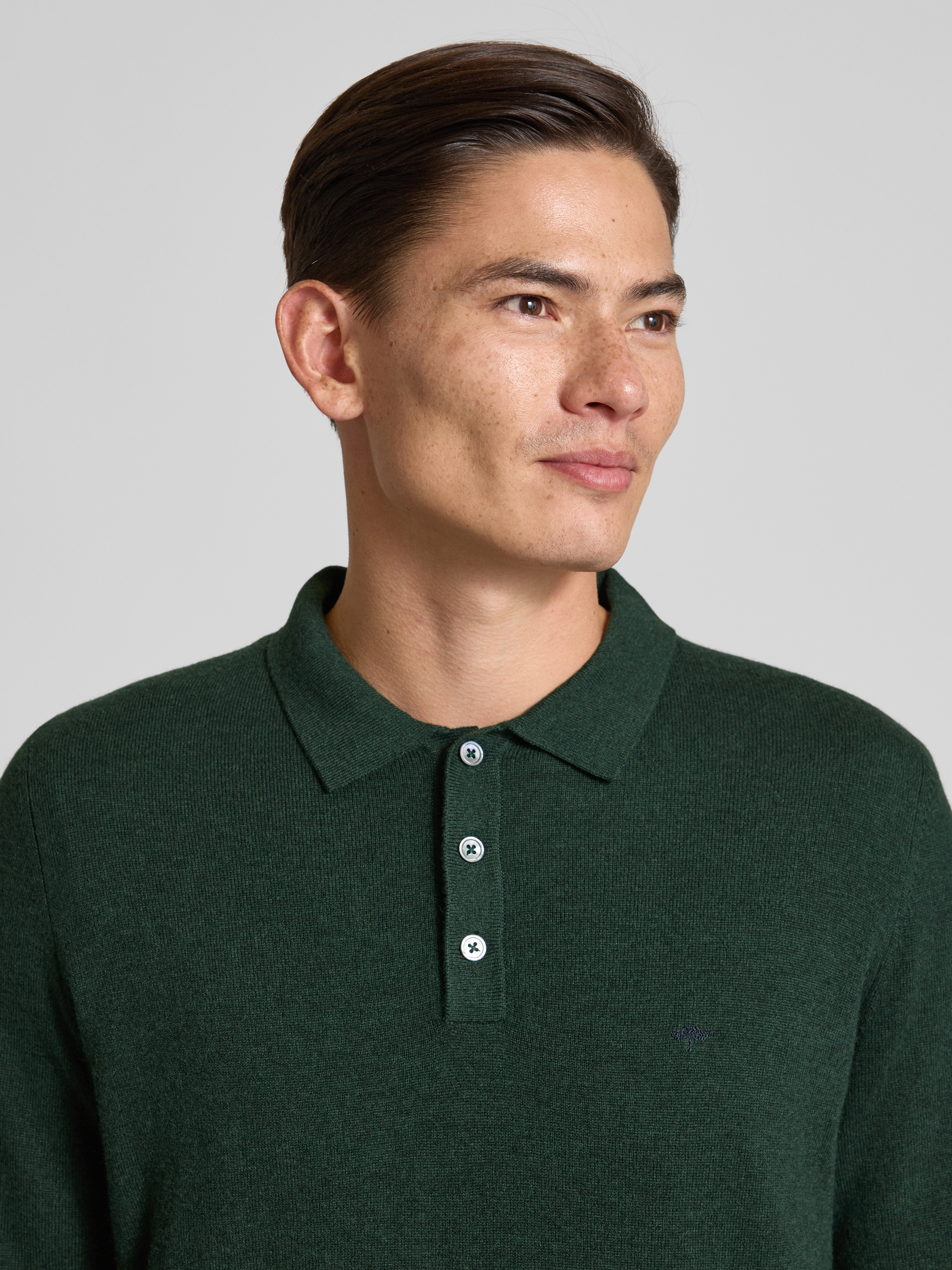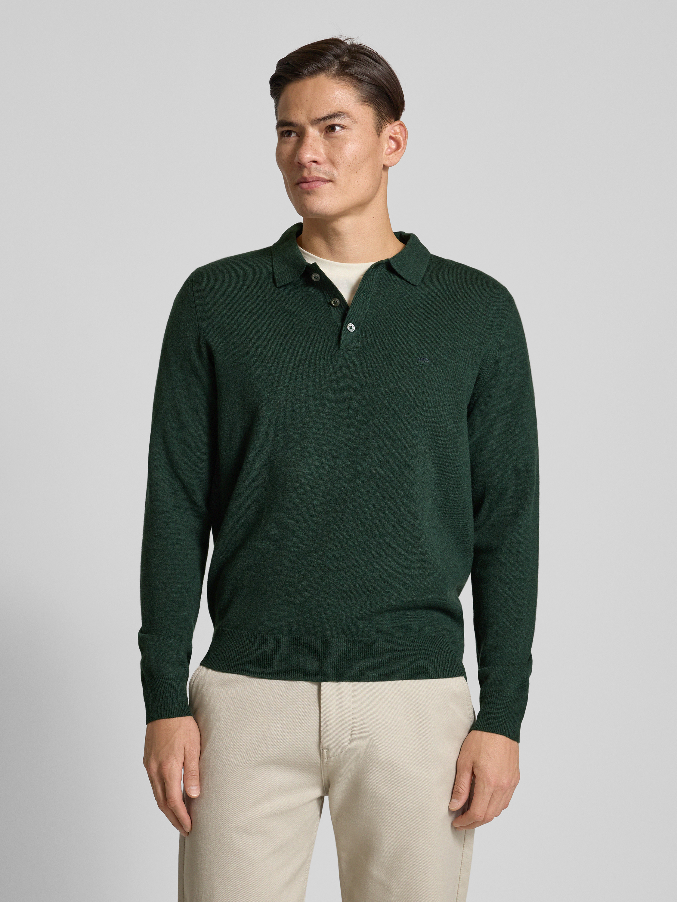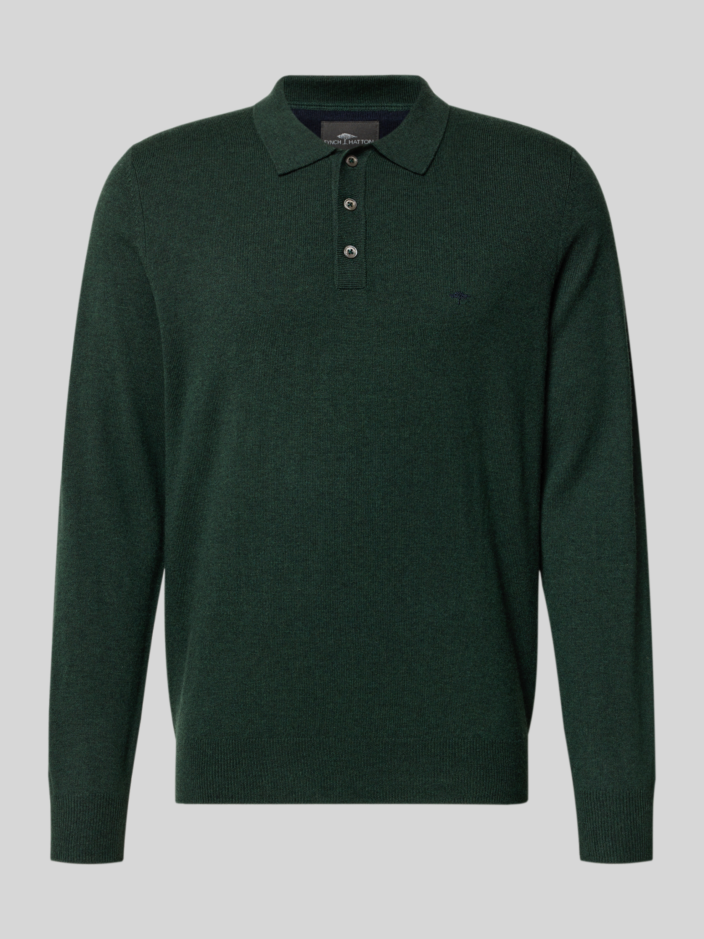 Fynch-HattonPoloshirt van een mix van merinowol en kasjmier met labelstitching in flessengroen