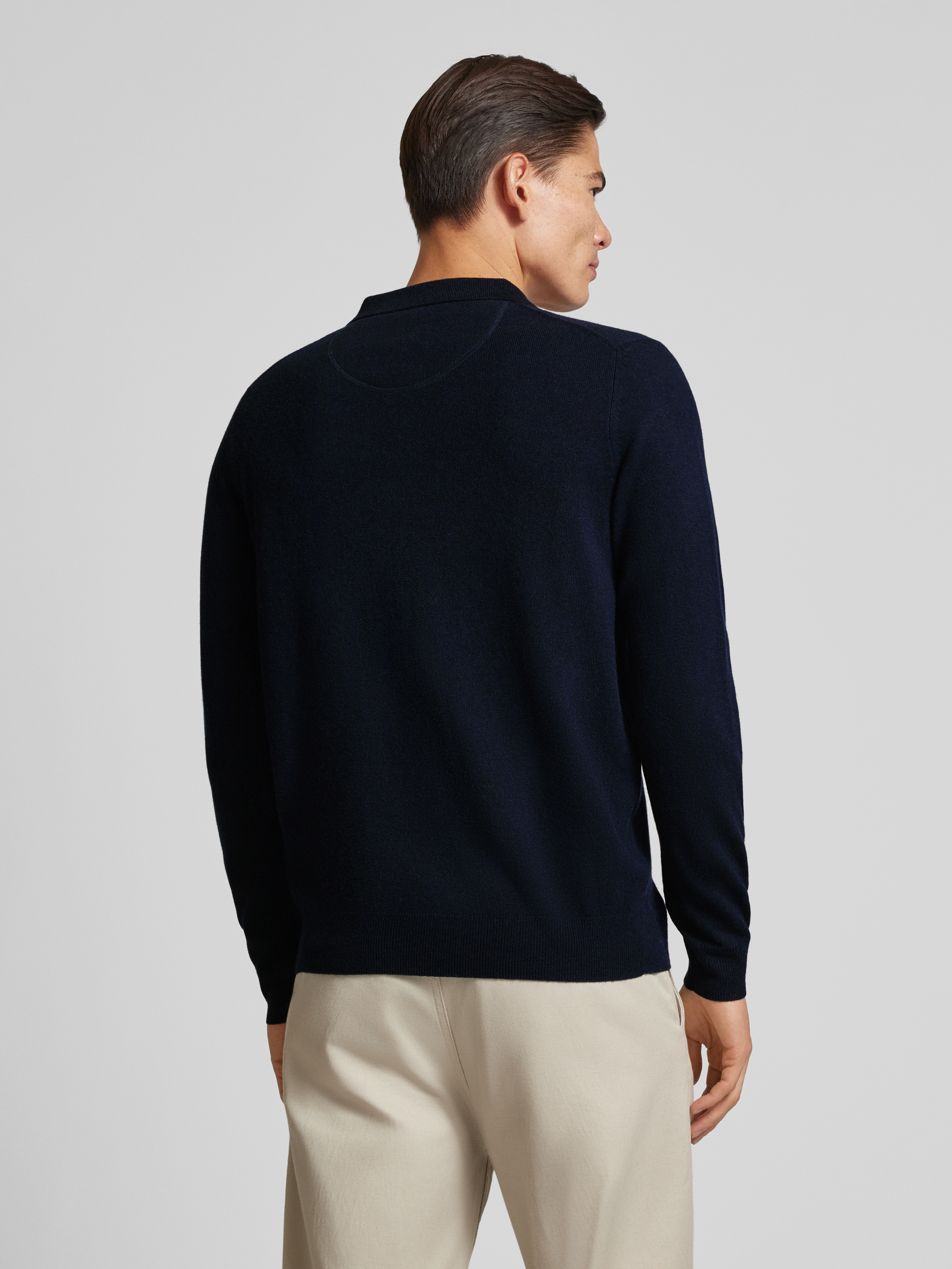 Fynch-HattonPoloshirt van een mix van merinowol en kasjmier met labelstitching in marineblauw