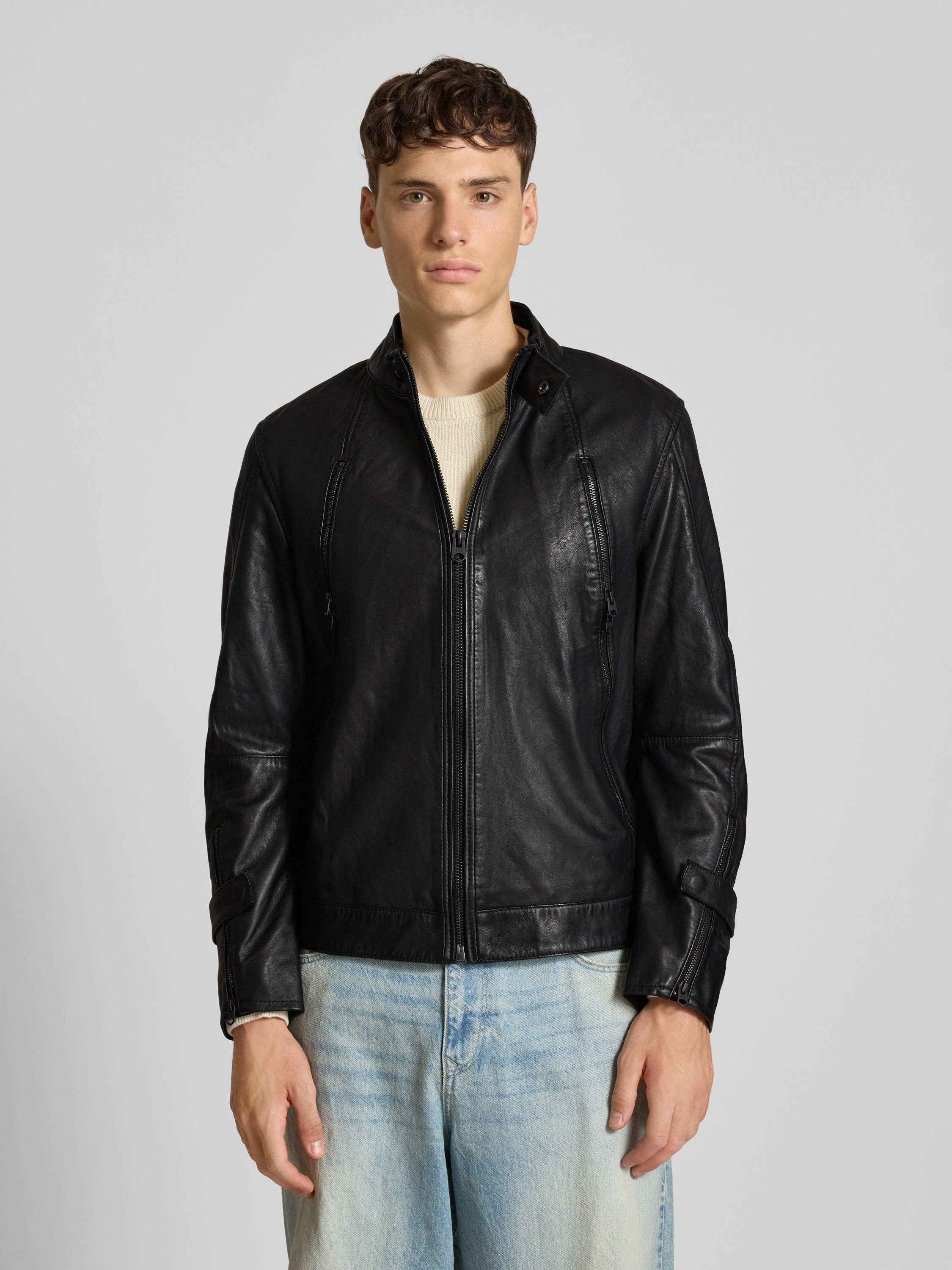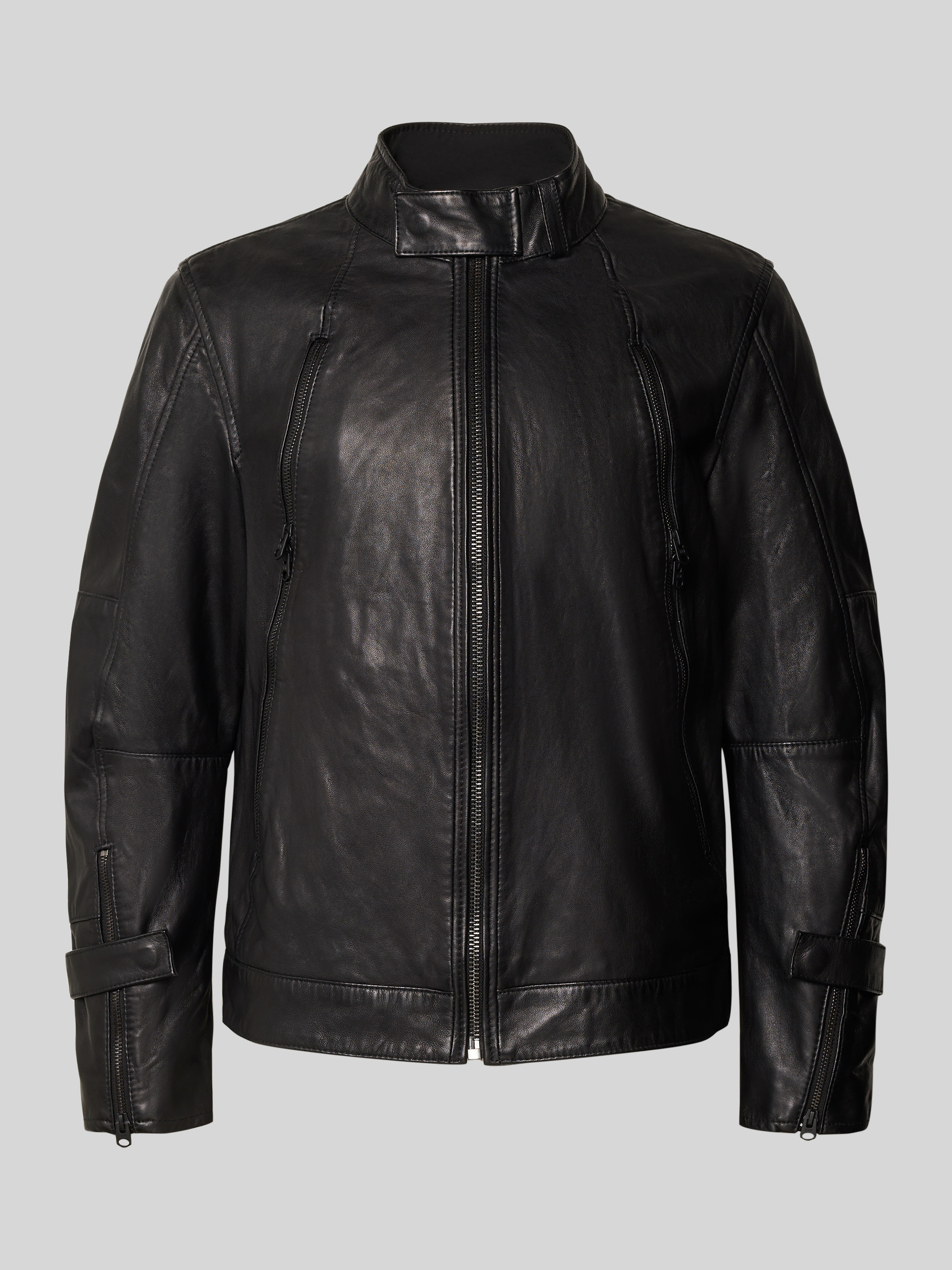 Bikerjack van schapenleer met opstaande kraag in zwart