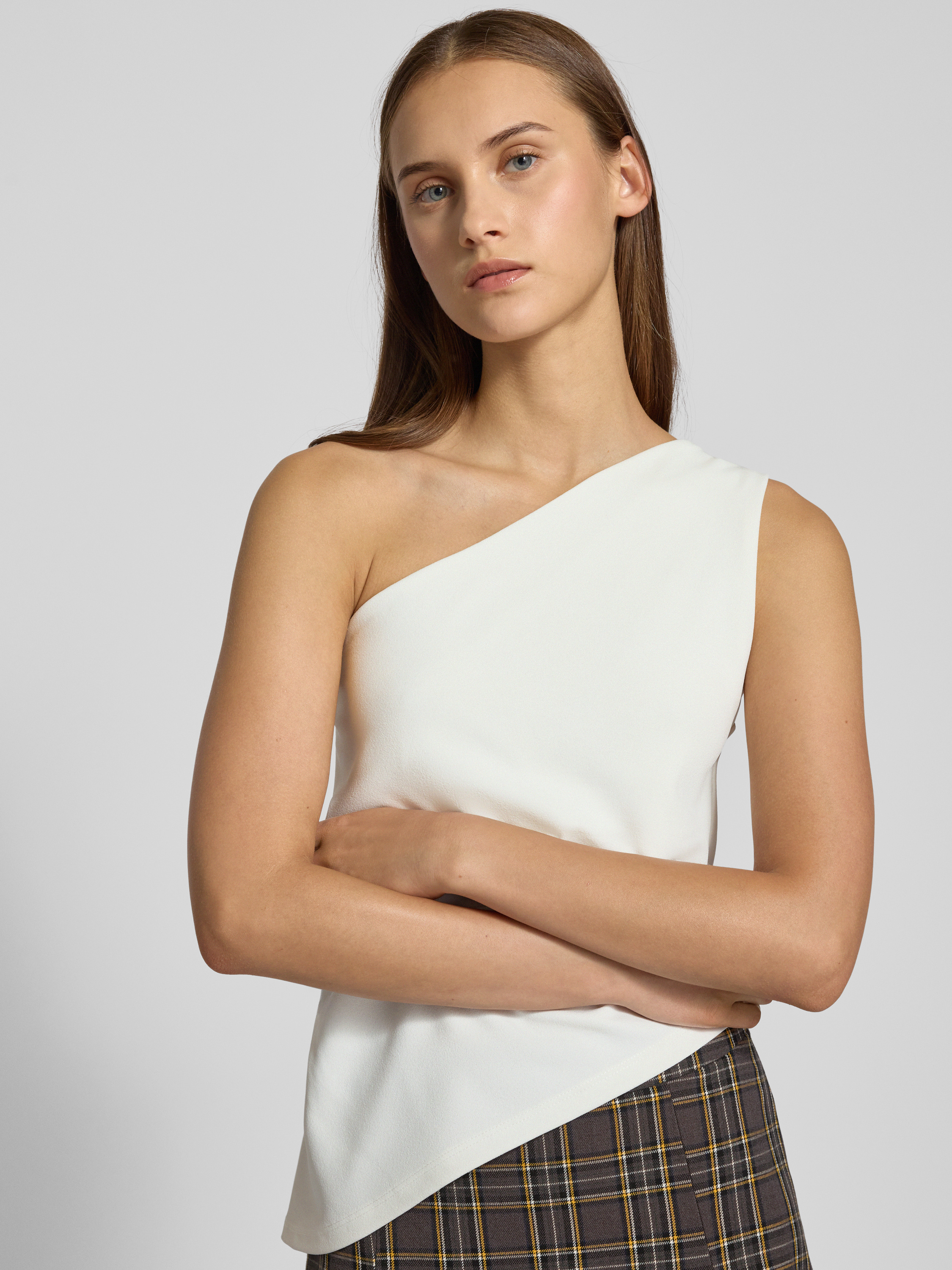 One shoulder-top met plooien in offwhite