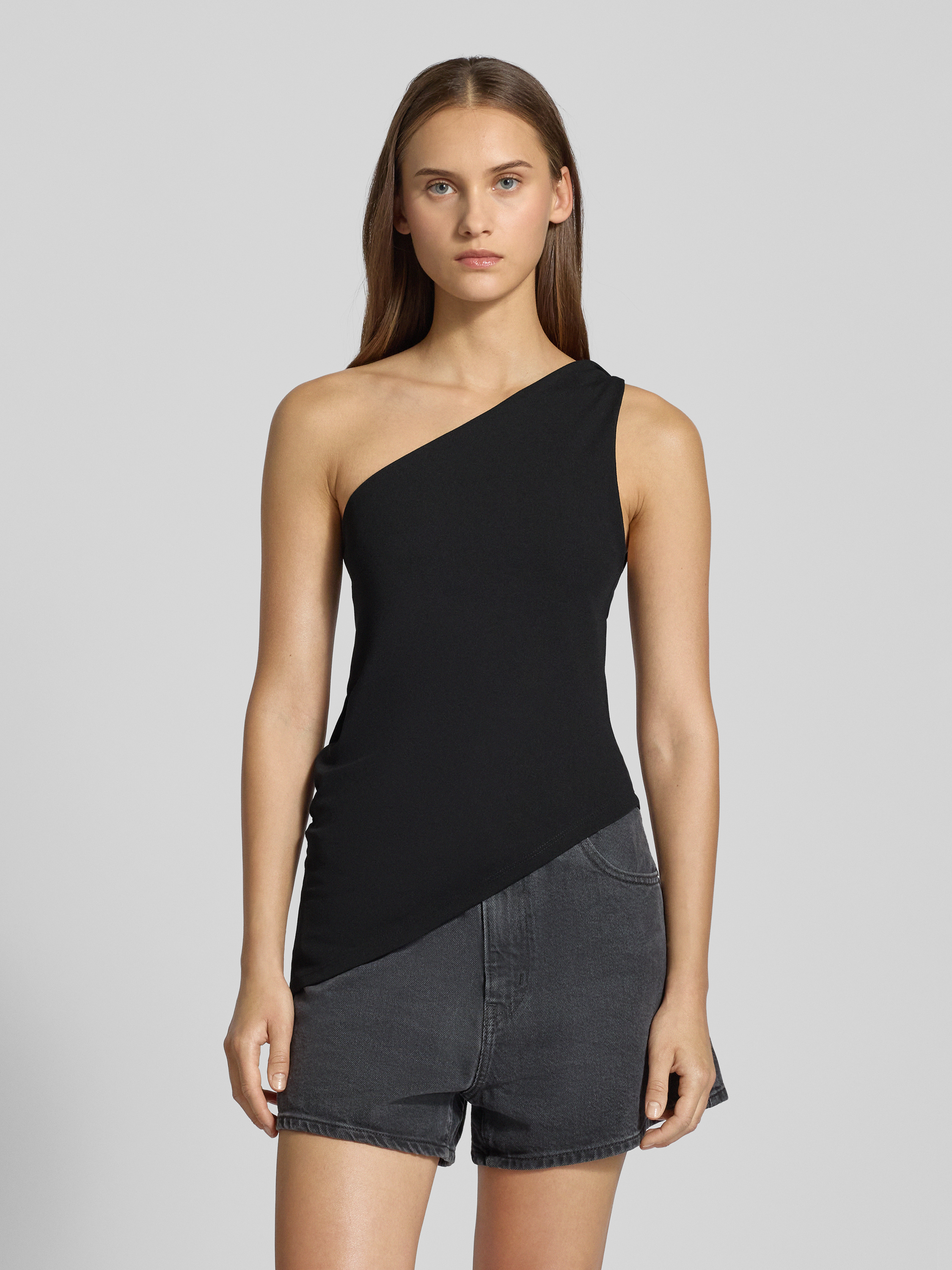 One shoulder-top met plooien in zwart