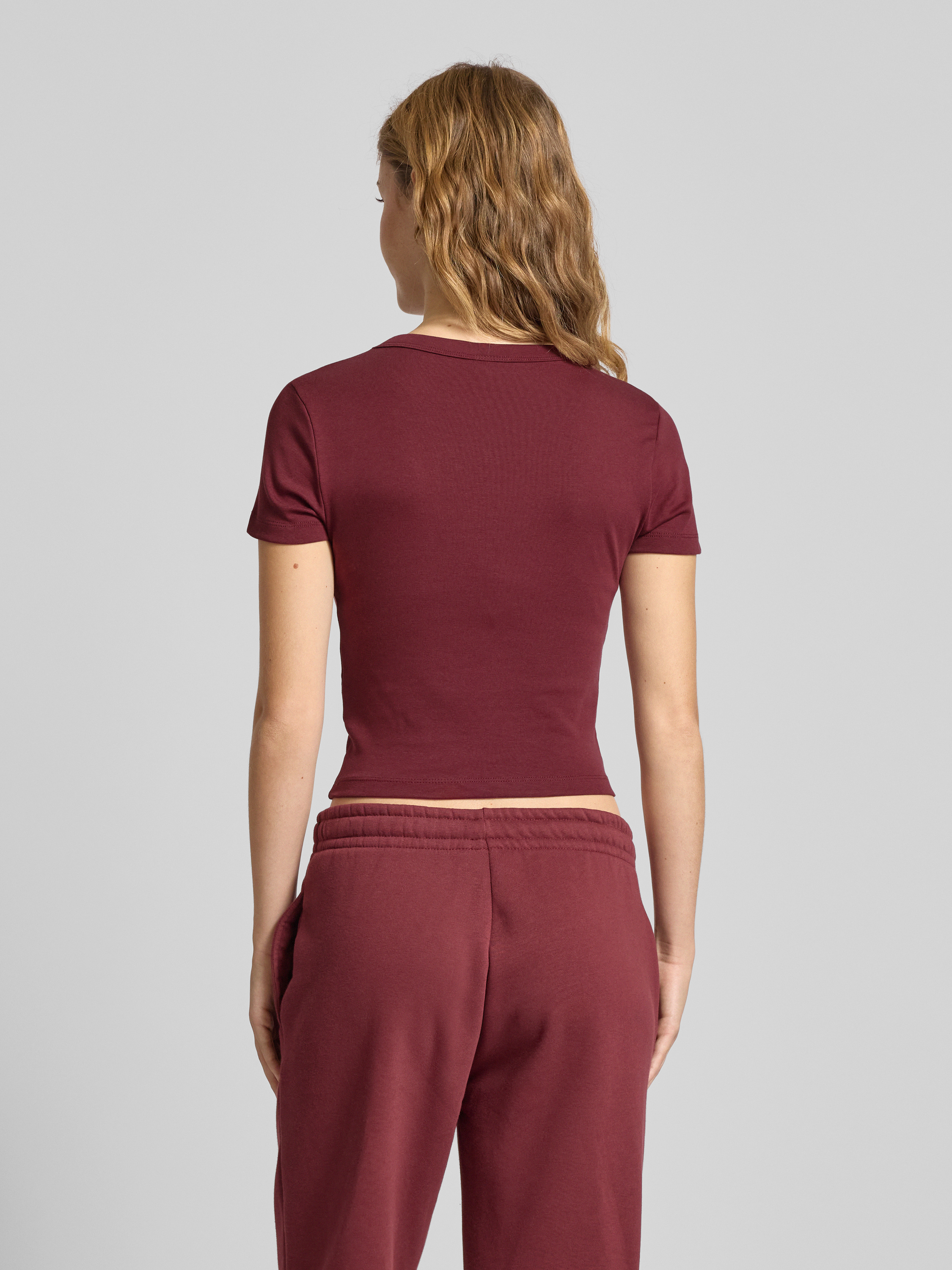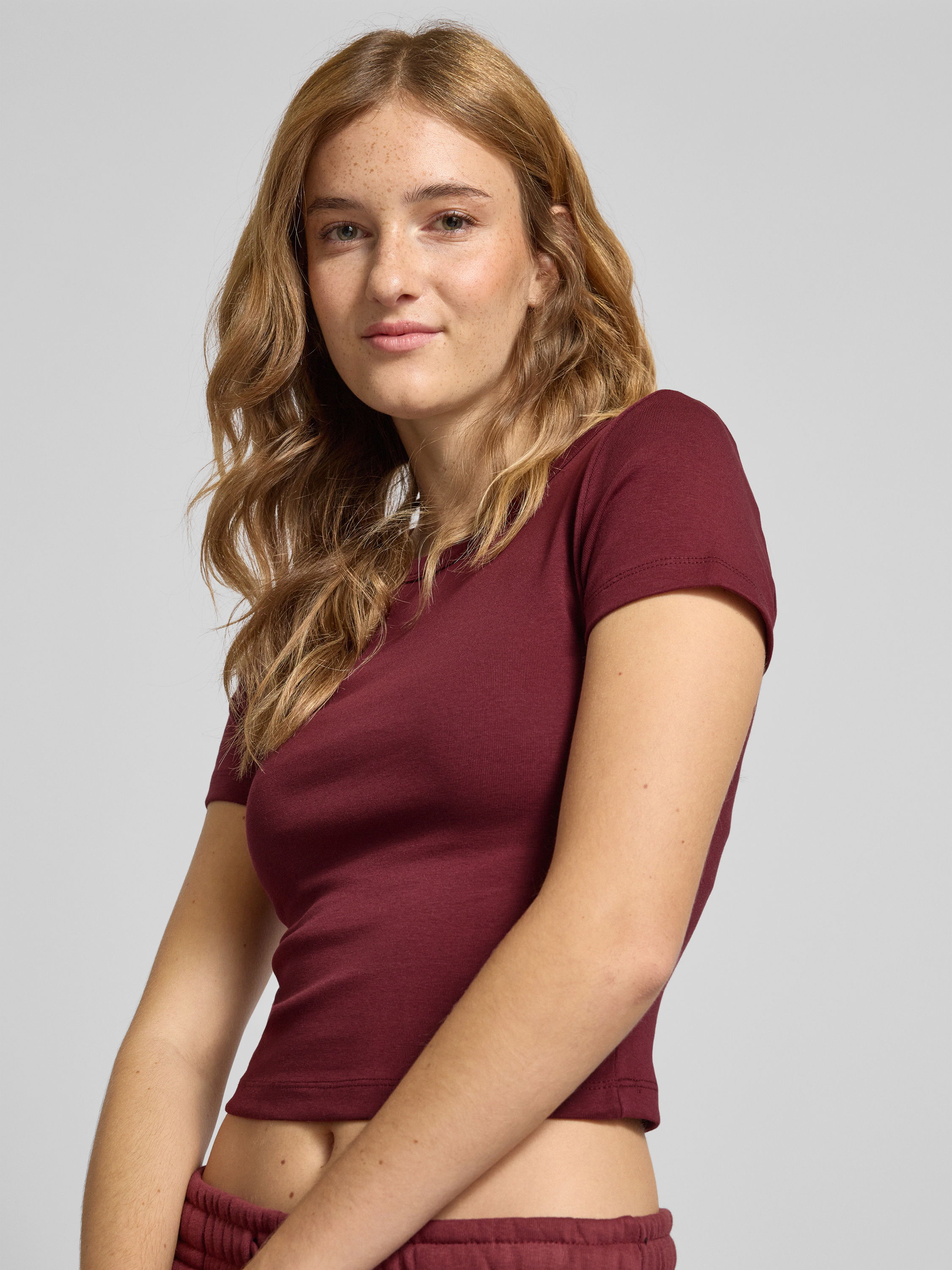T-shirt met geribde ronde hals in bordeaux