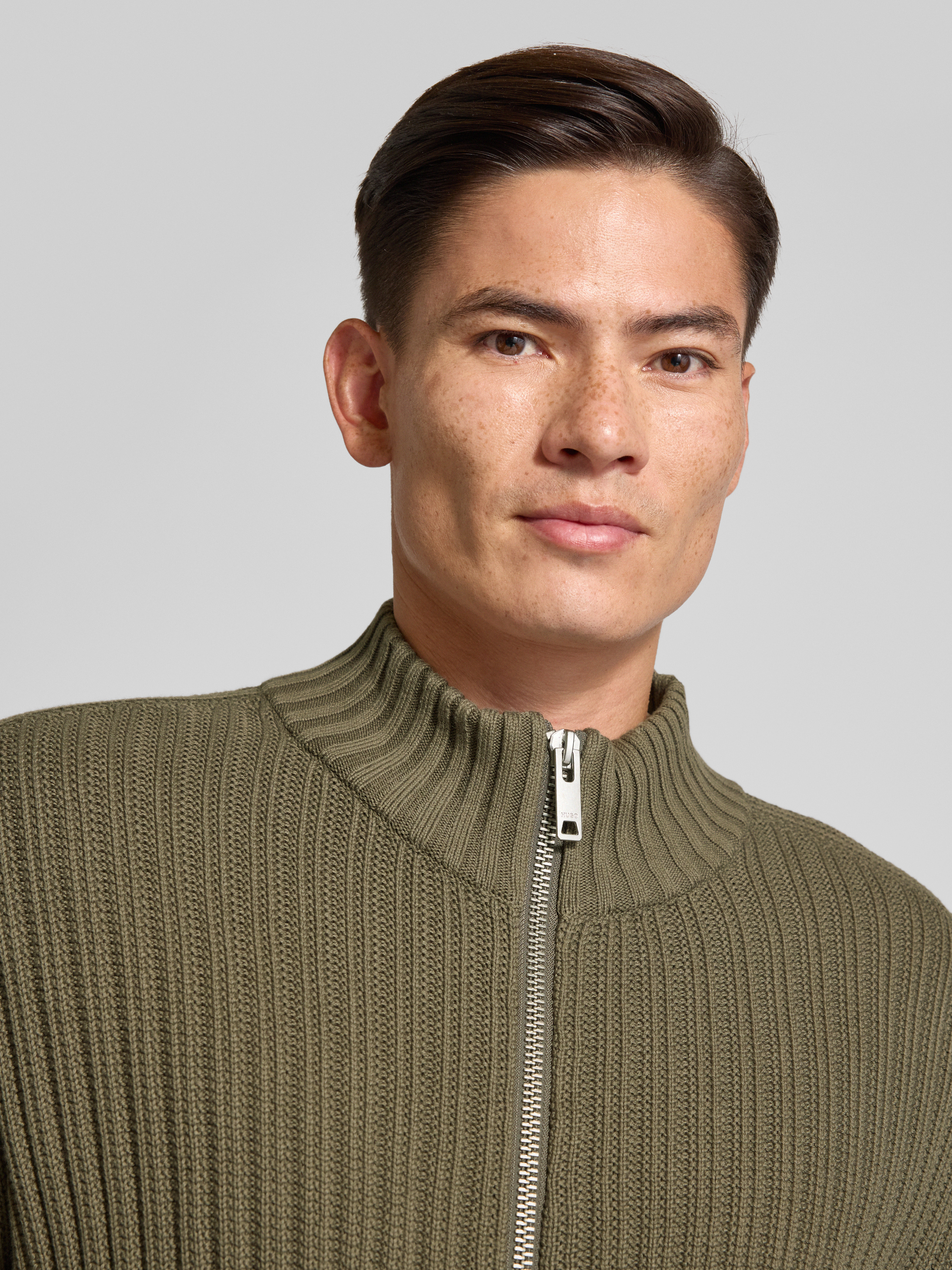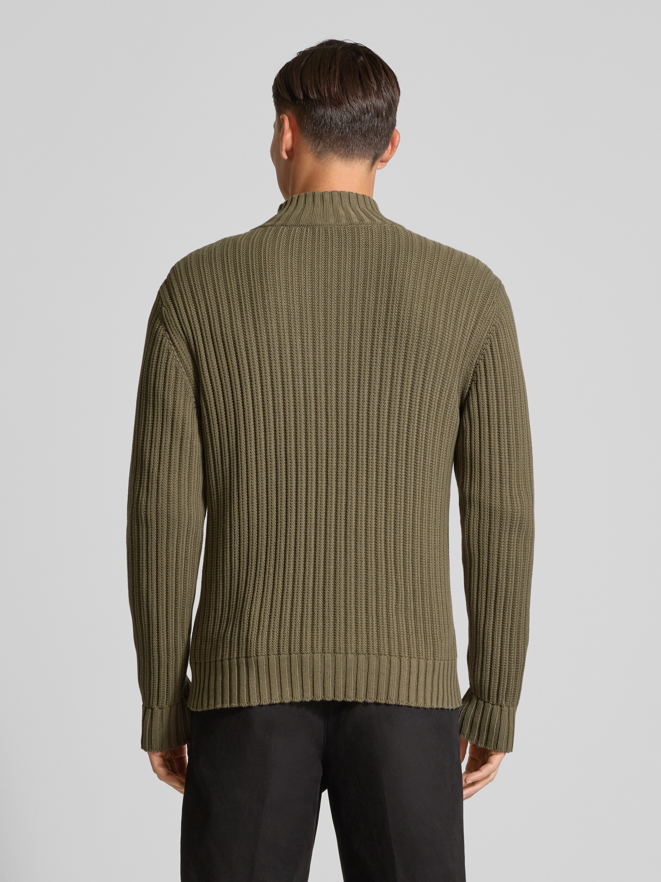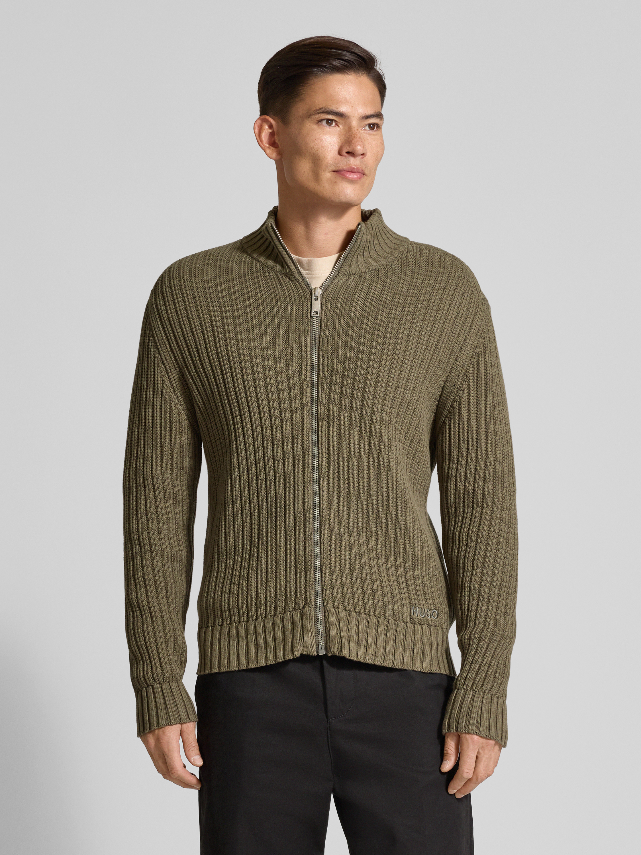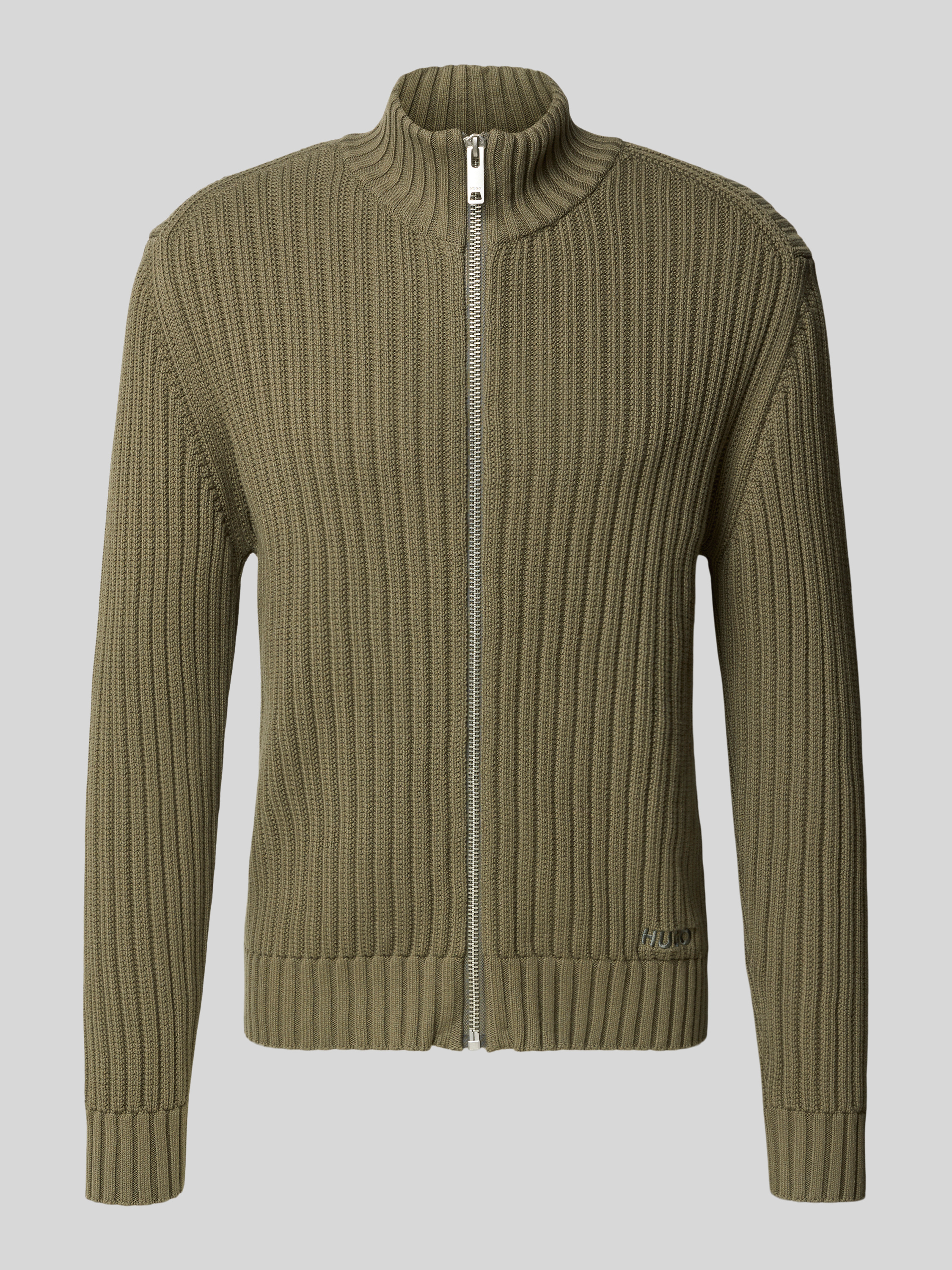 Regular fit gebreid jack van geribd katoen, model 'SRITON' in olijfgroen