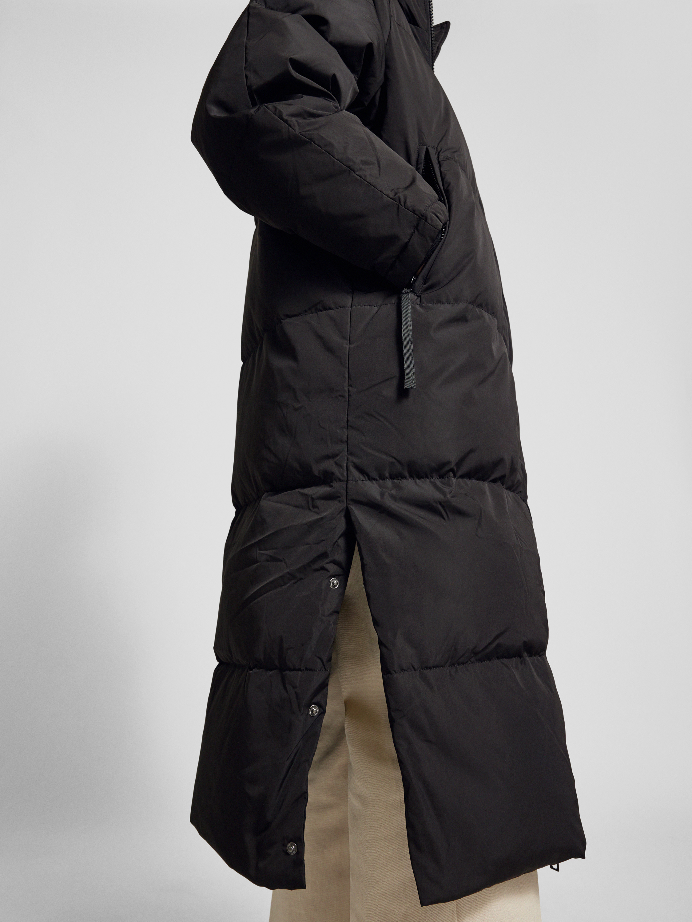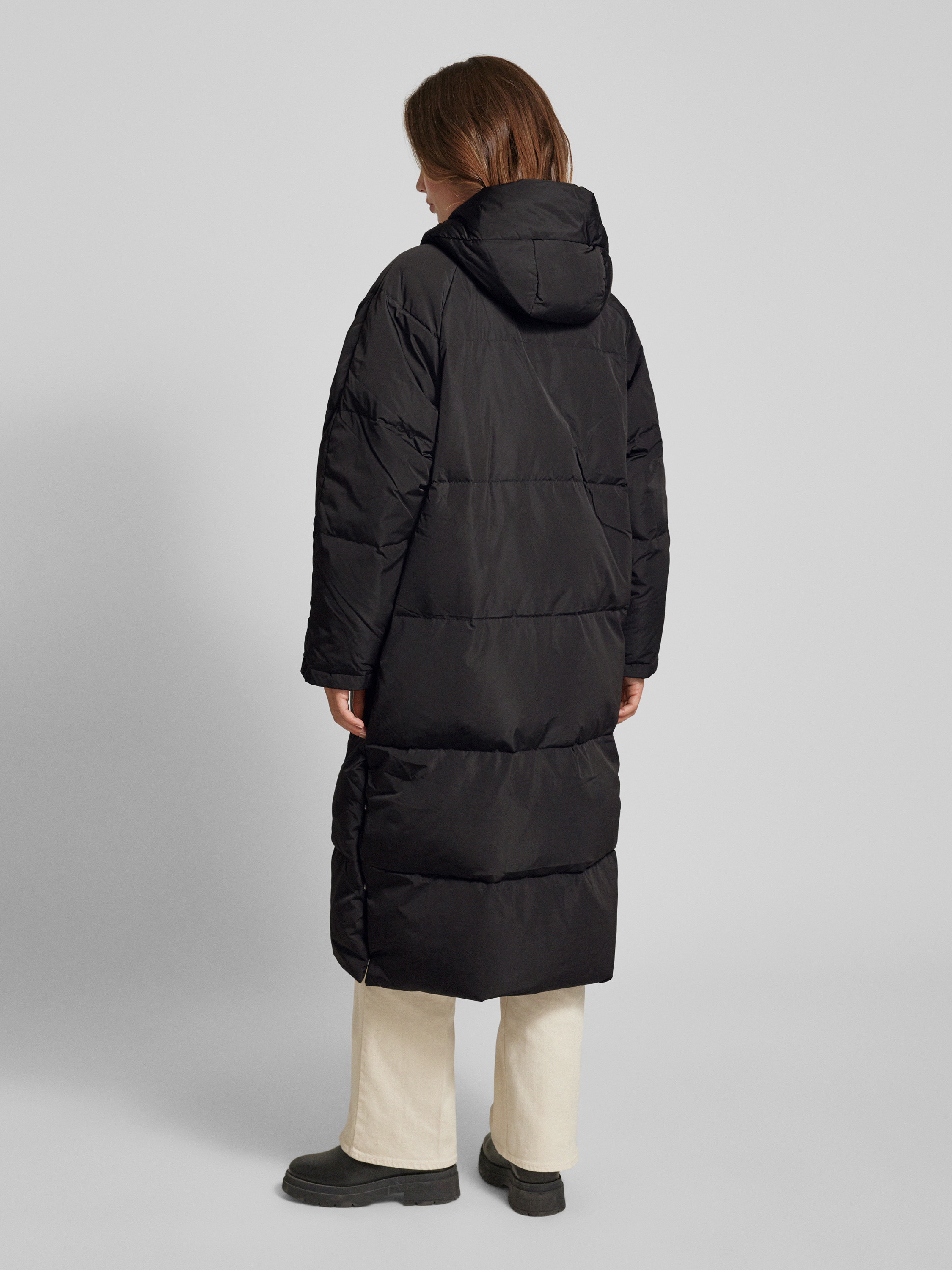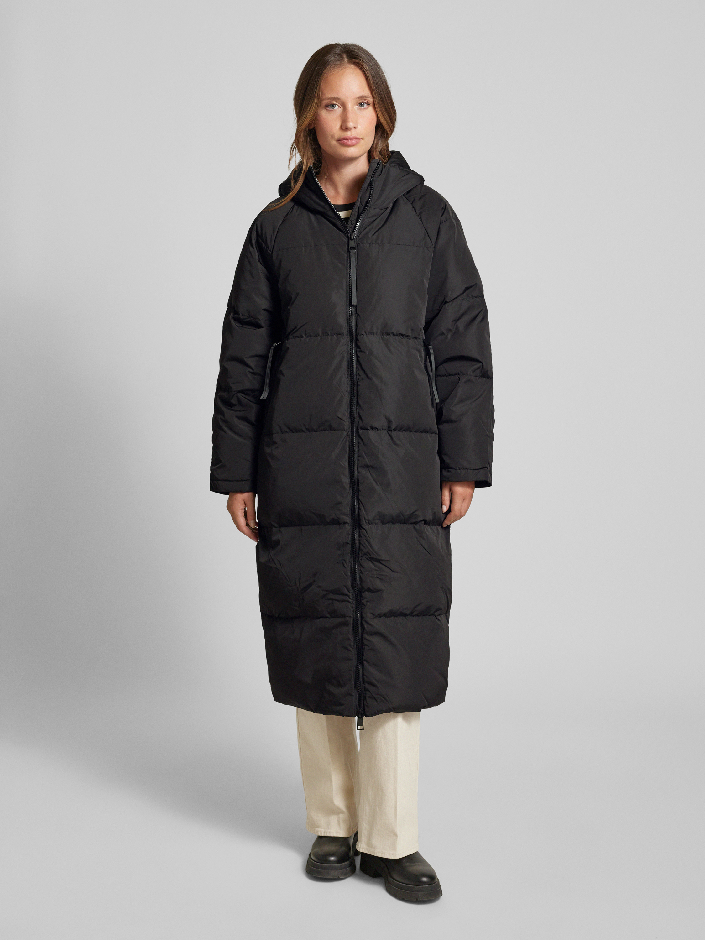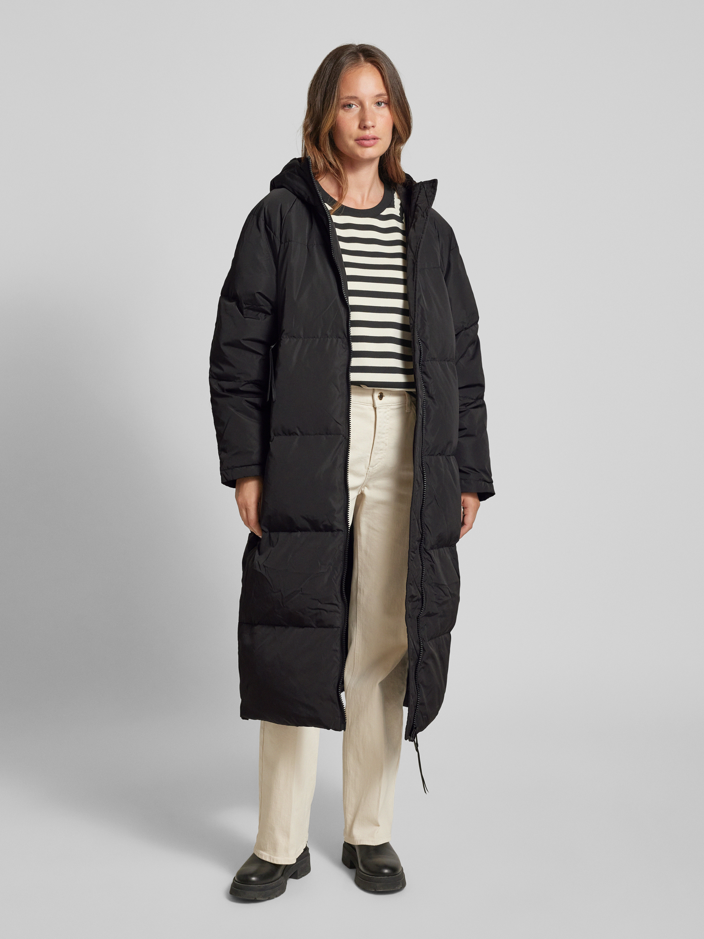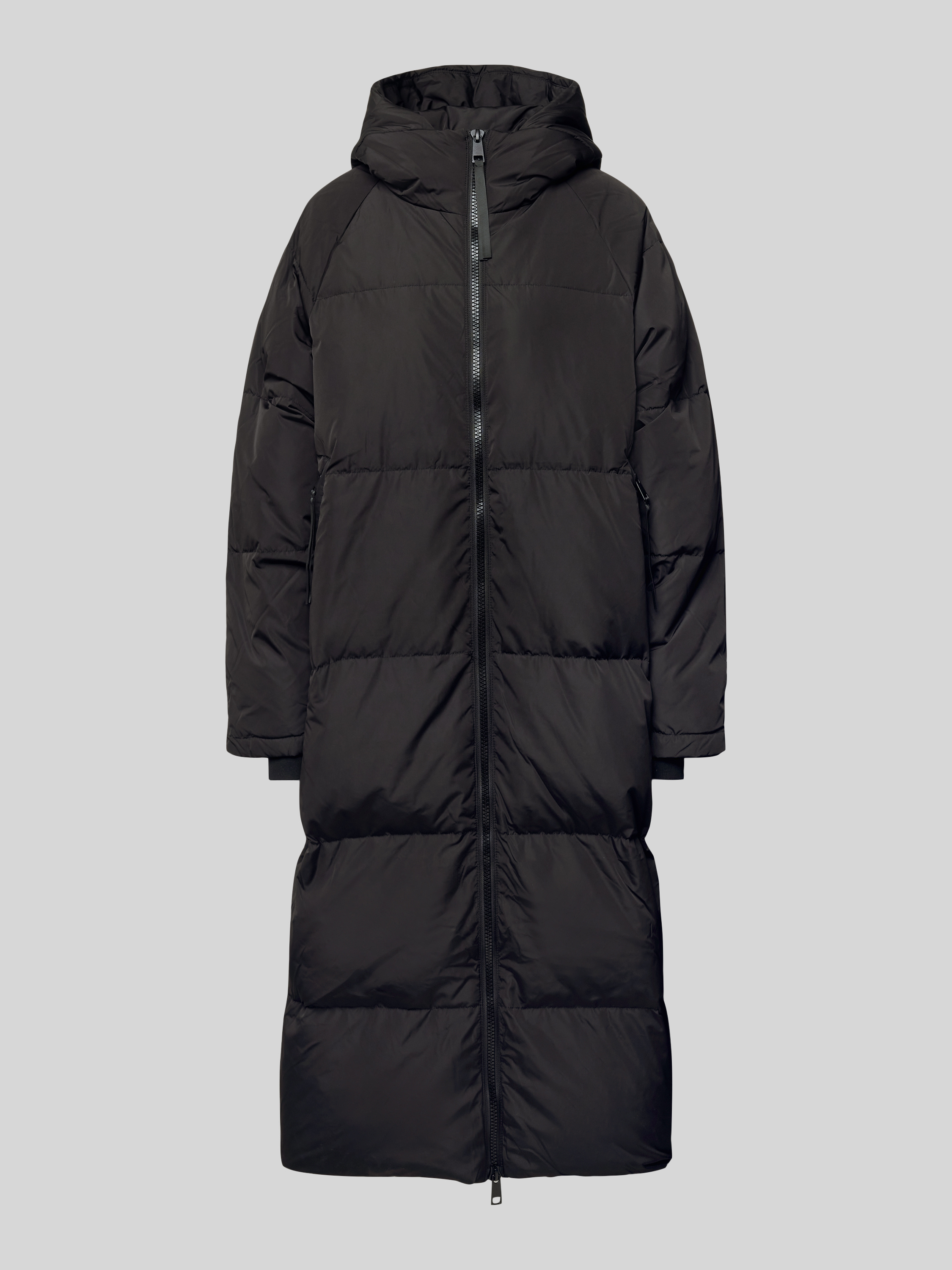 Lange donsjas met capuchon, model 'BUNALA' in zwart
