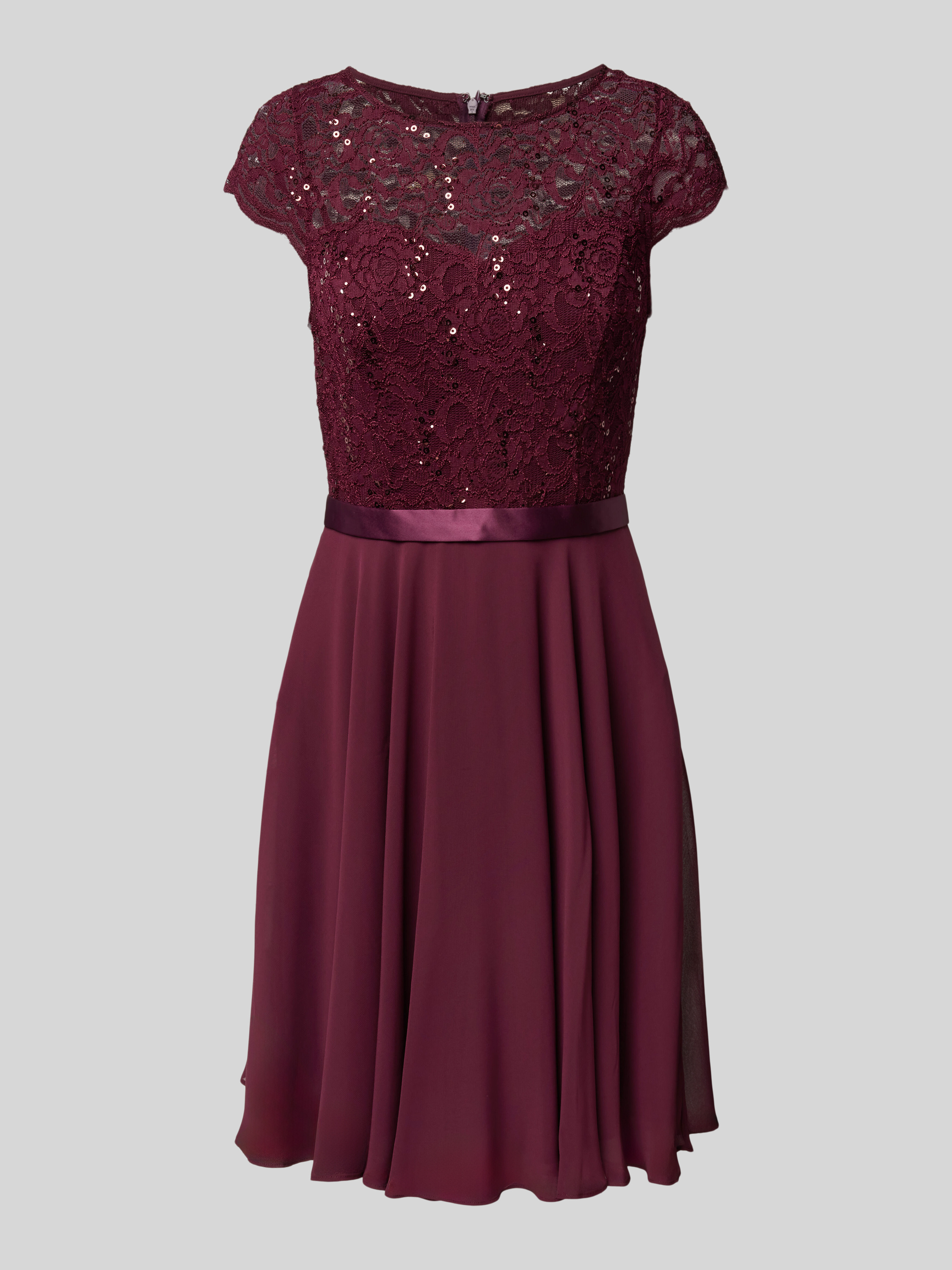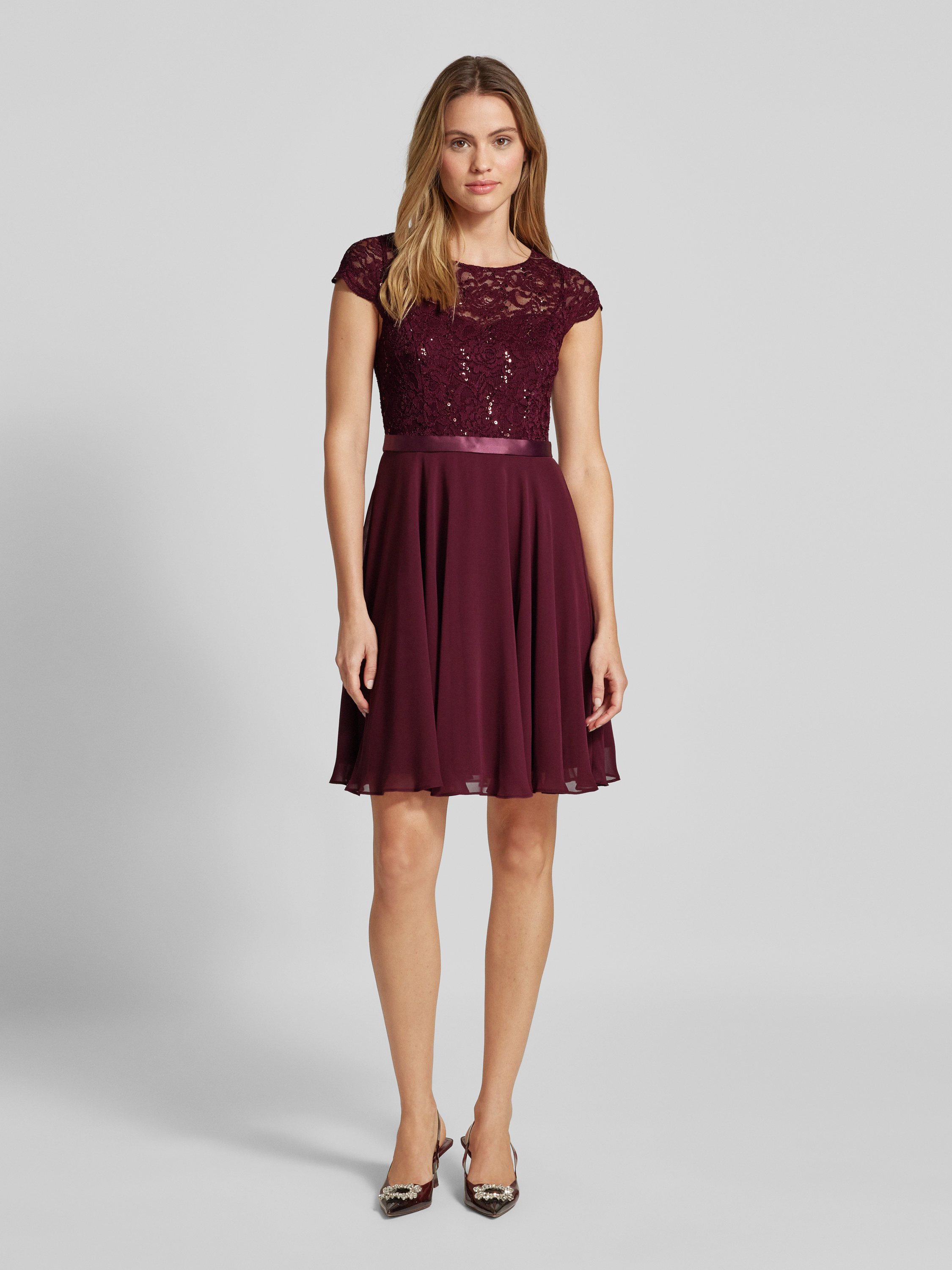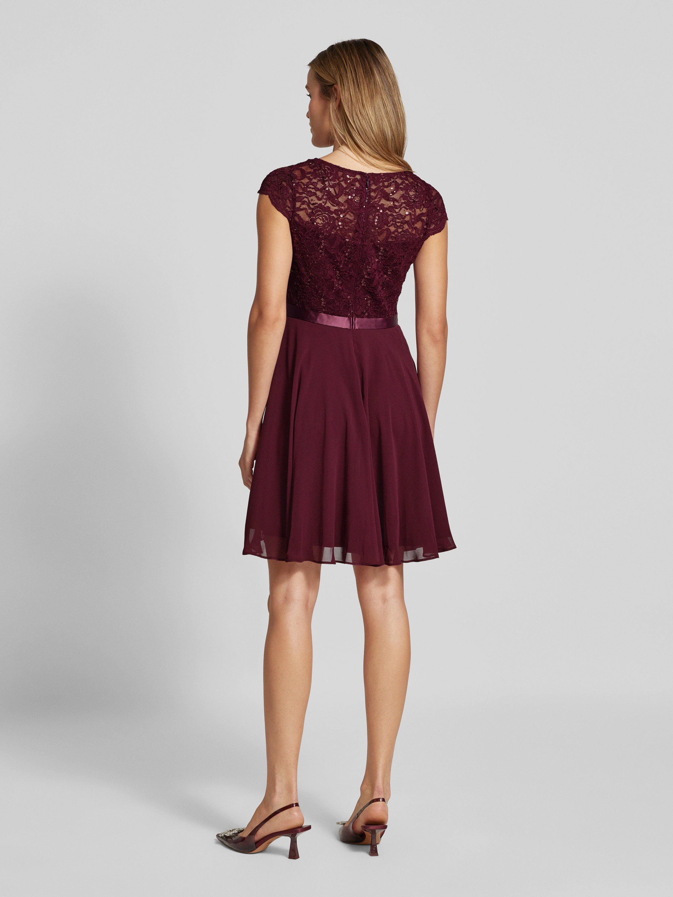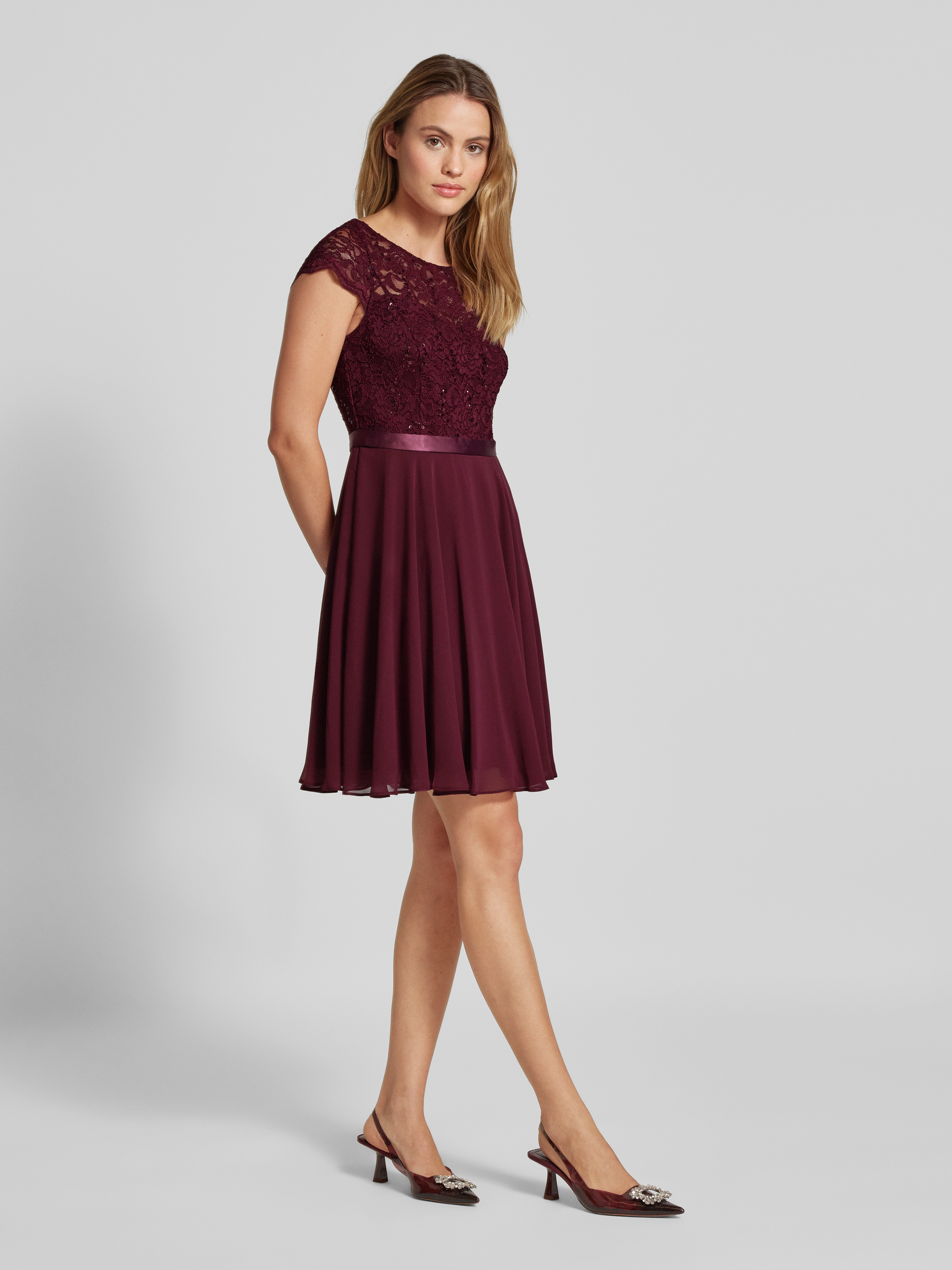 Cocktailjurk met gehaakt kant in bordeaux