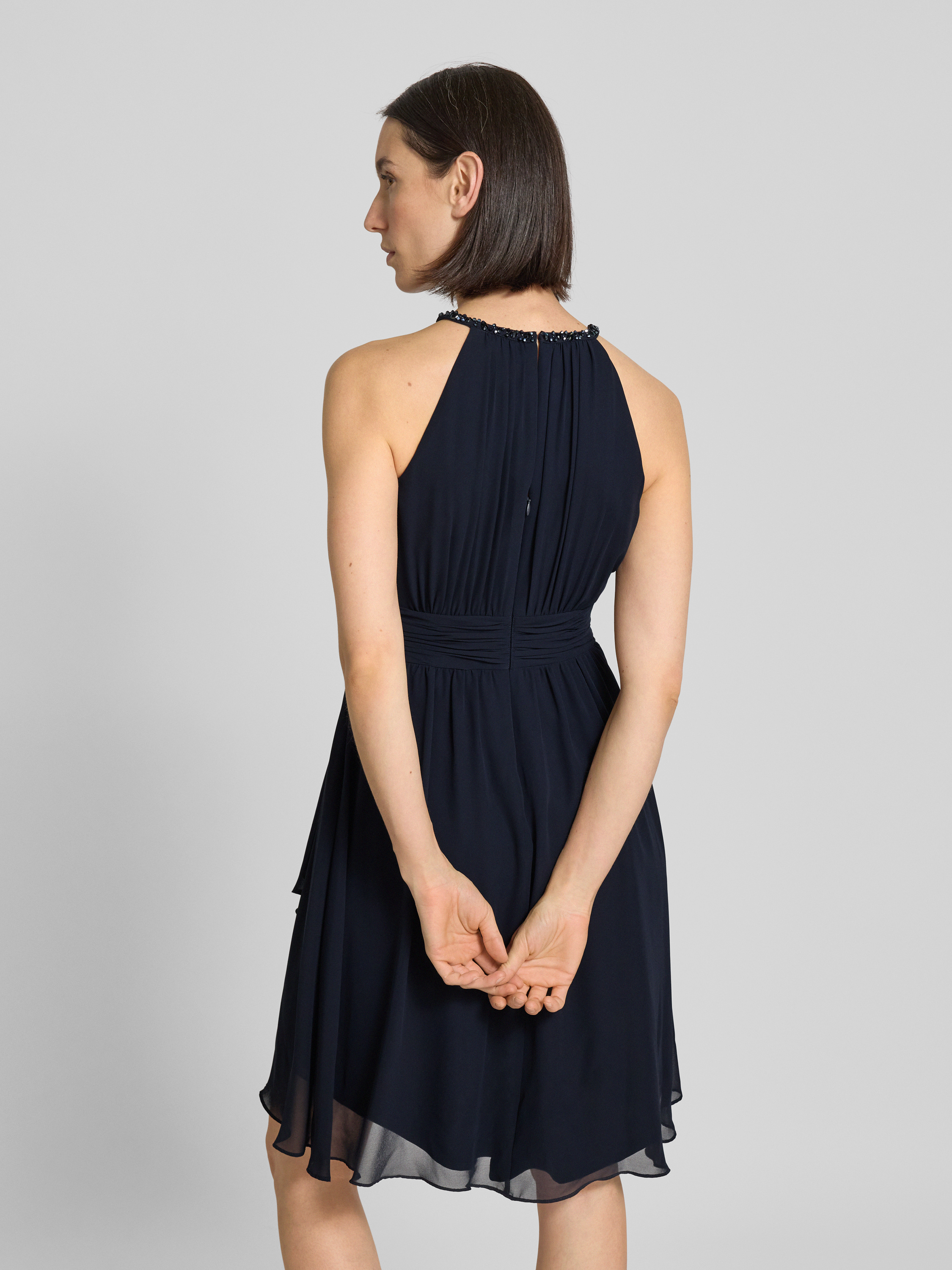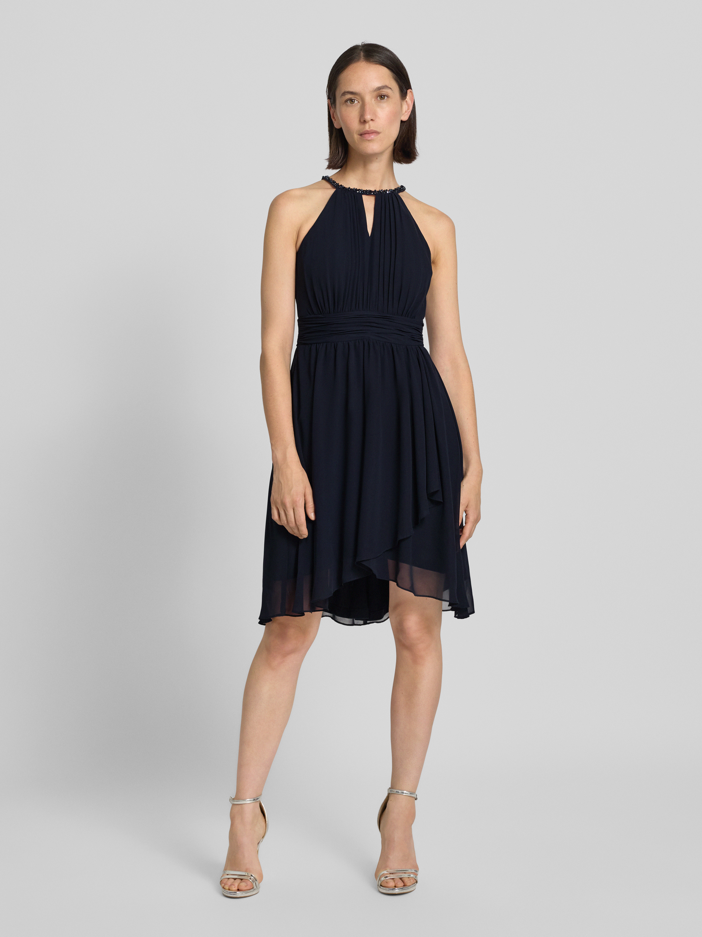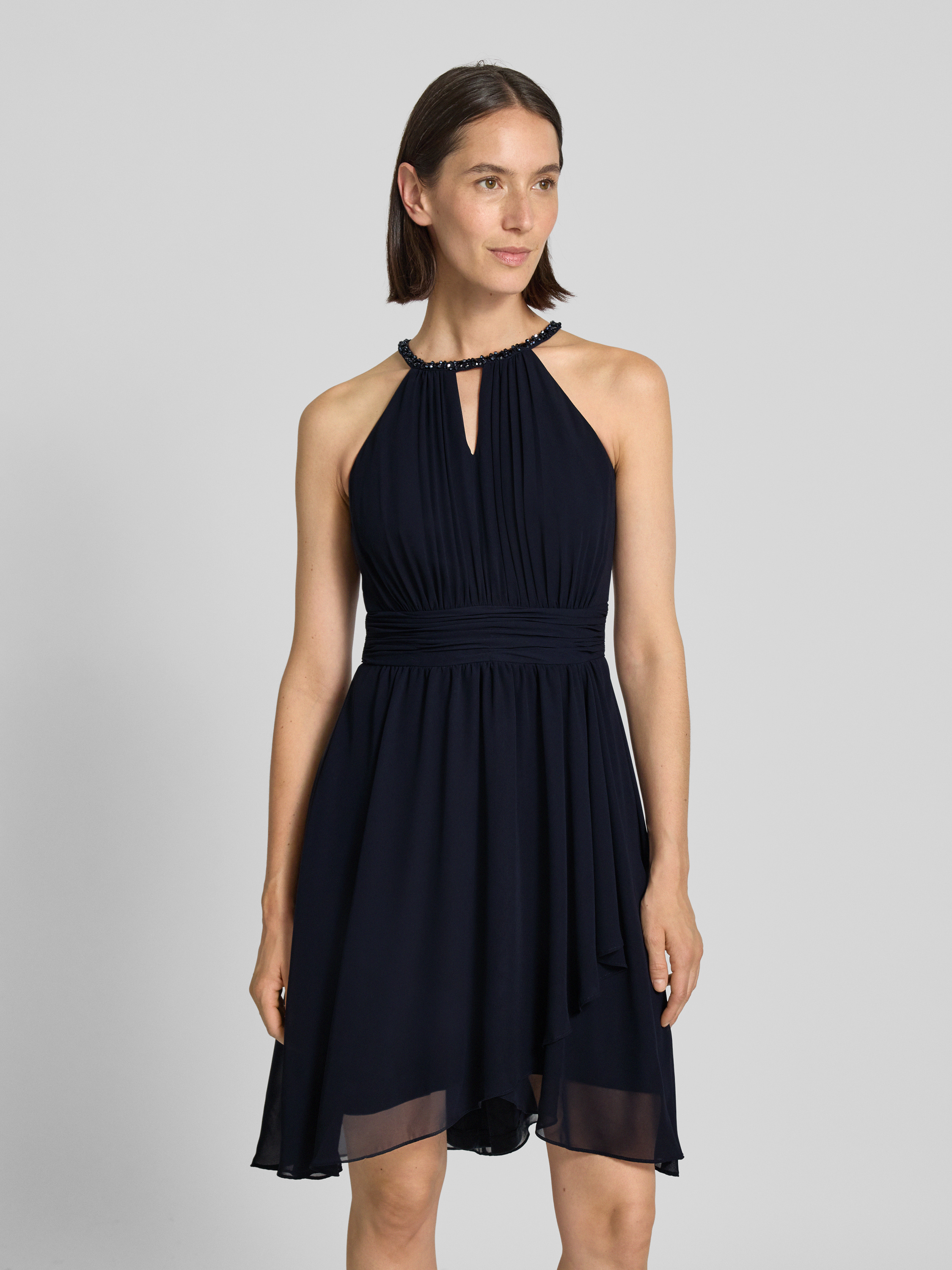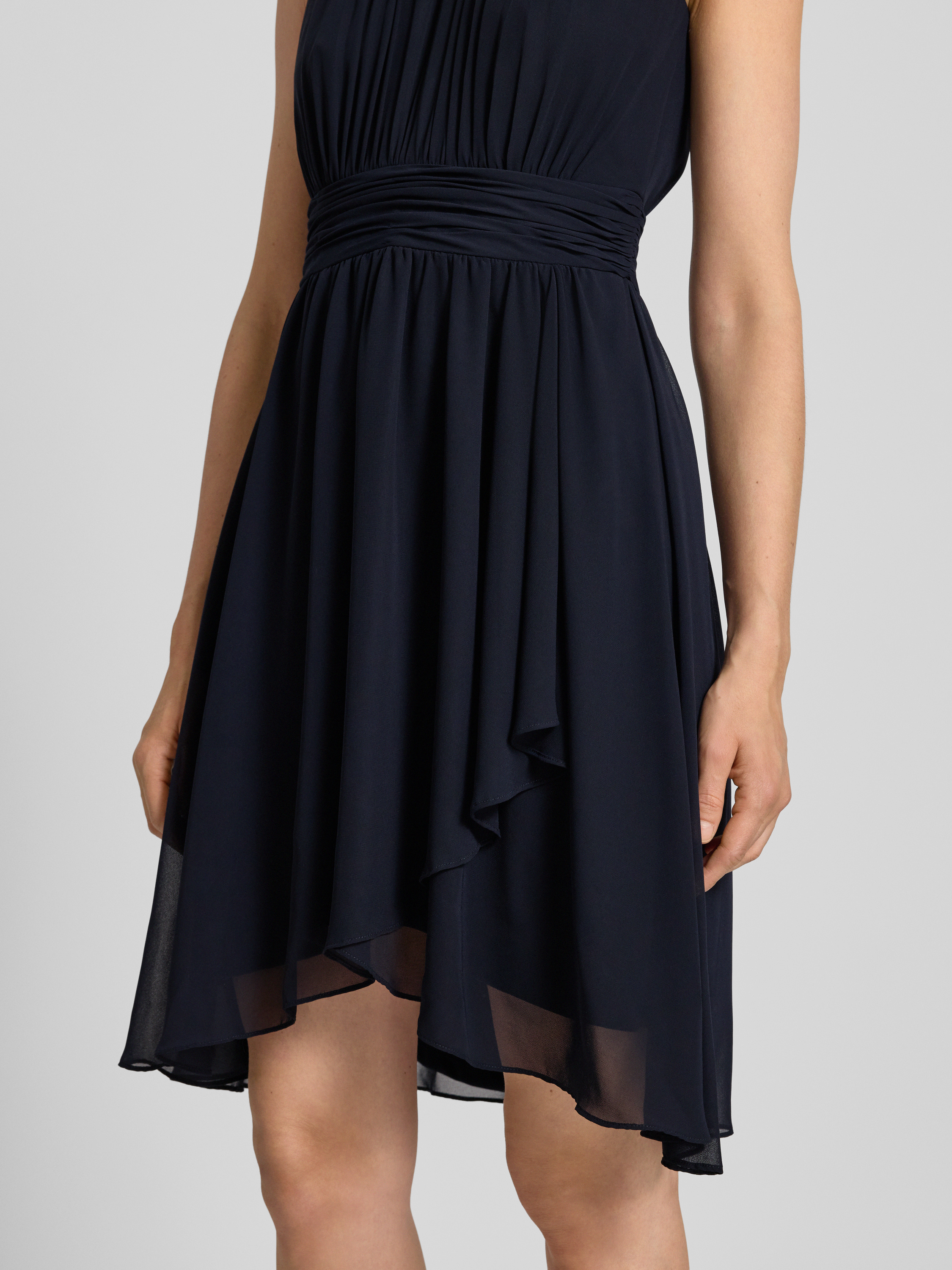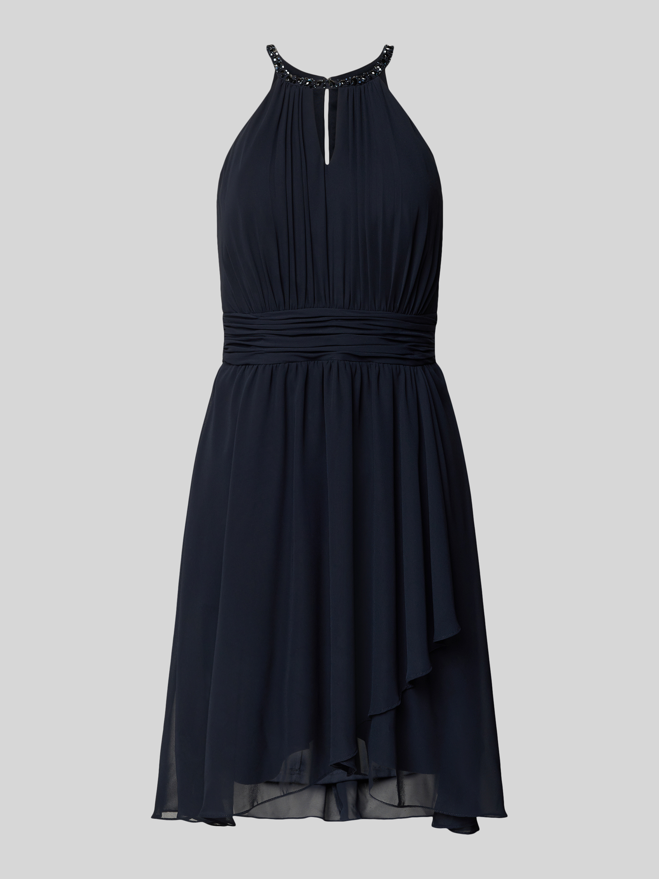Knielange cocktailjurk met druppelvormige hals in marineblauw gemêleerd