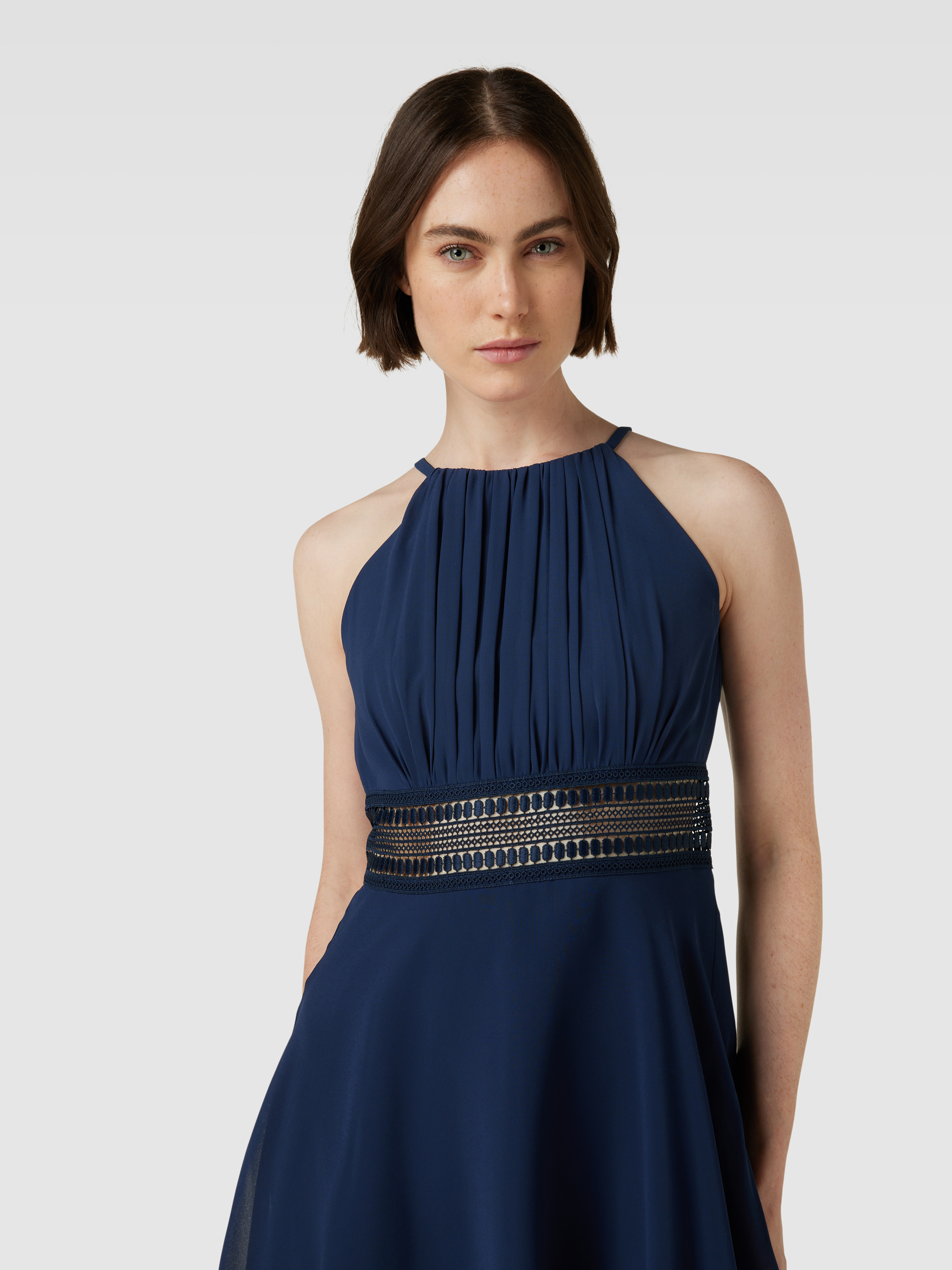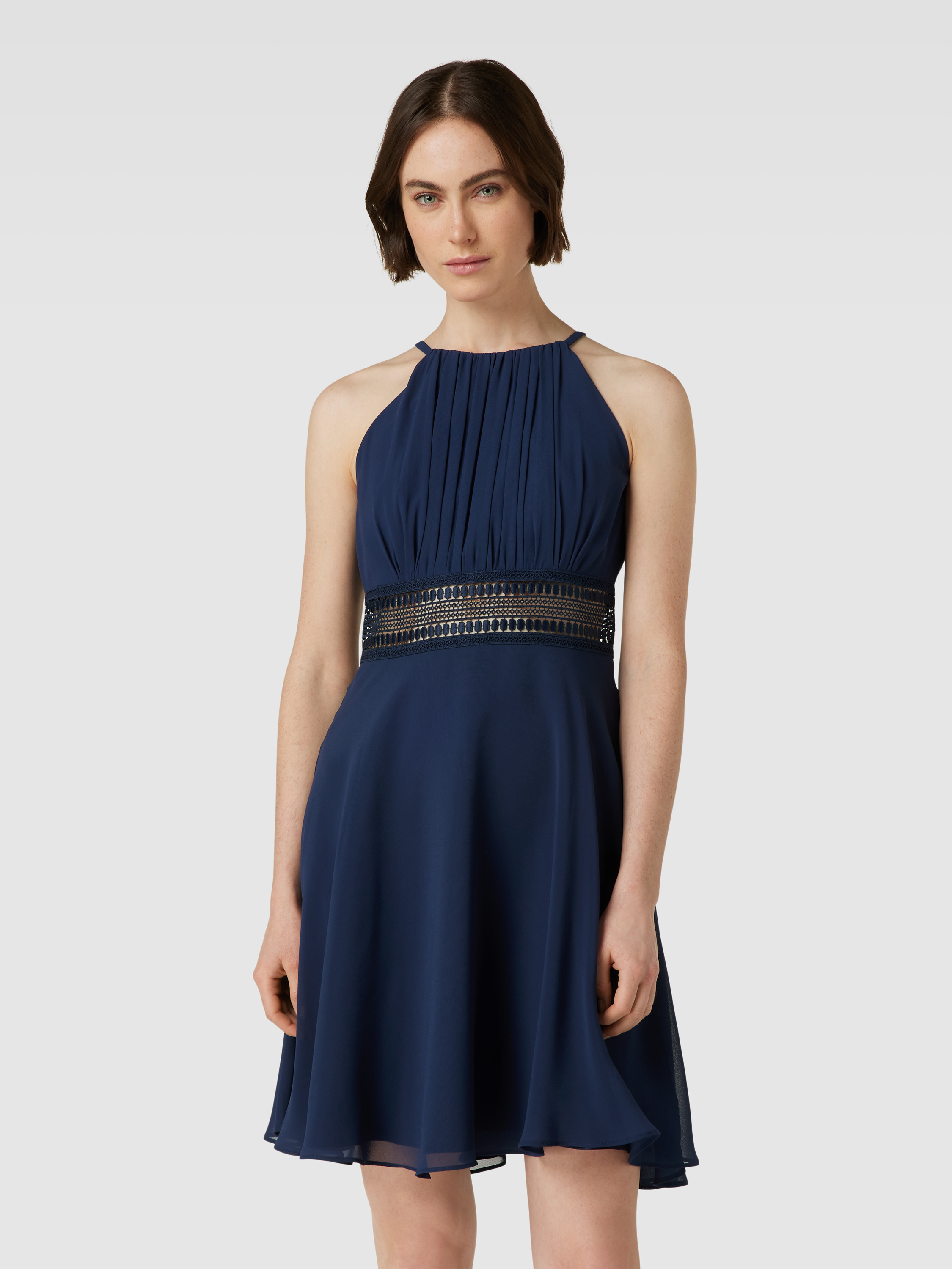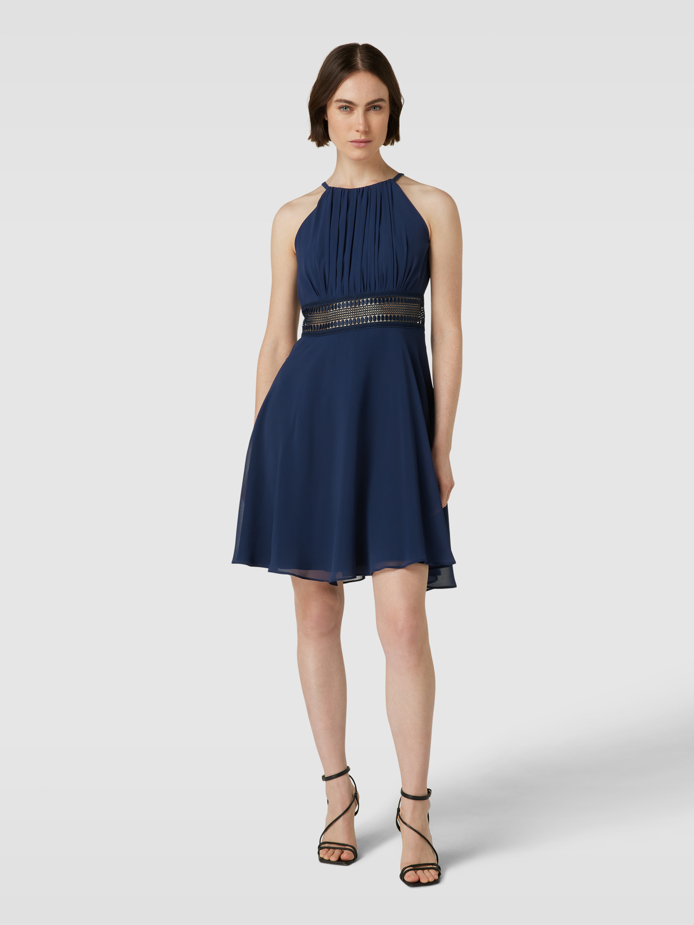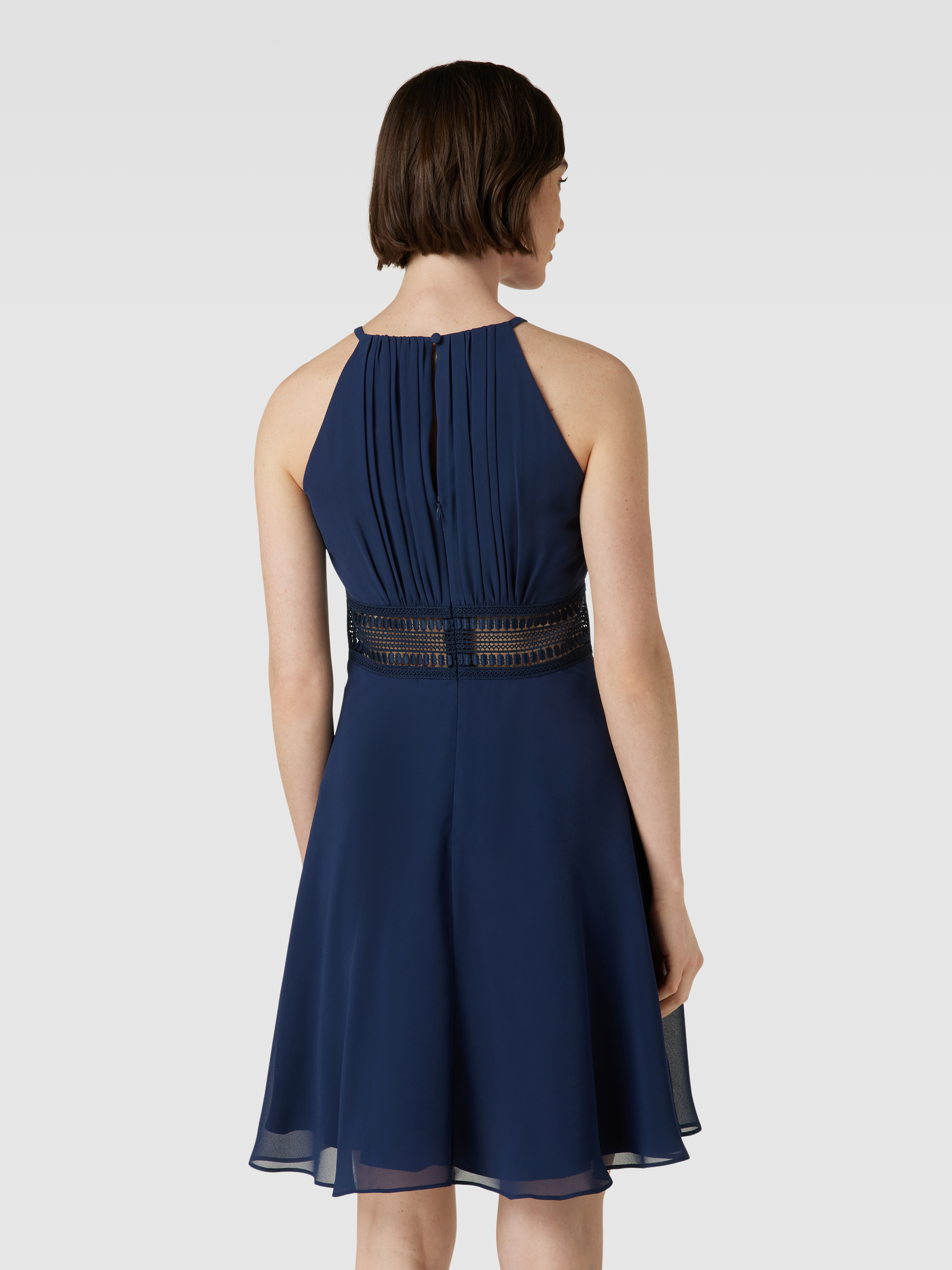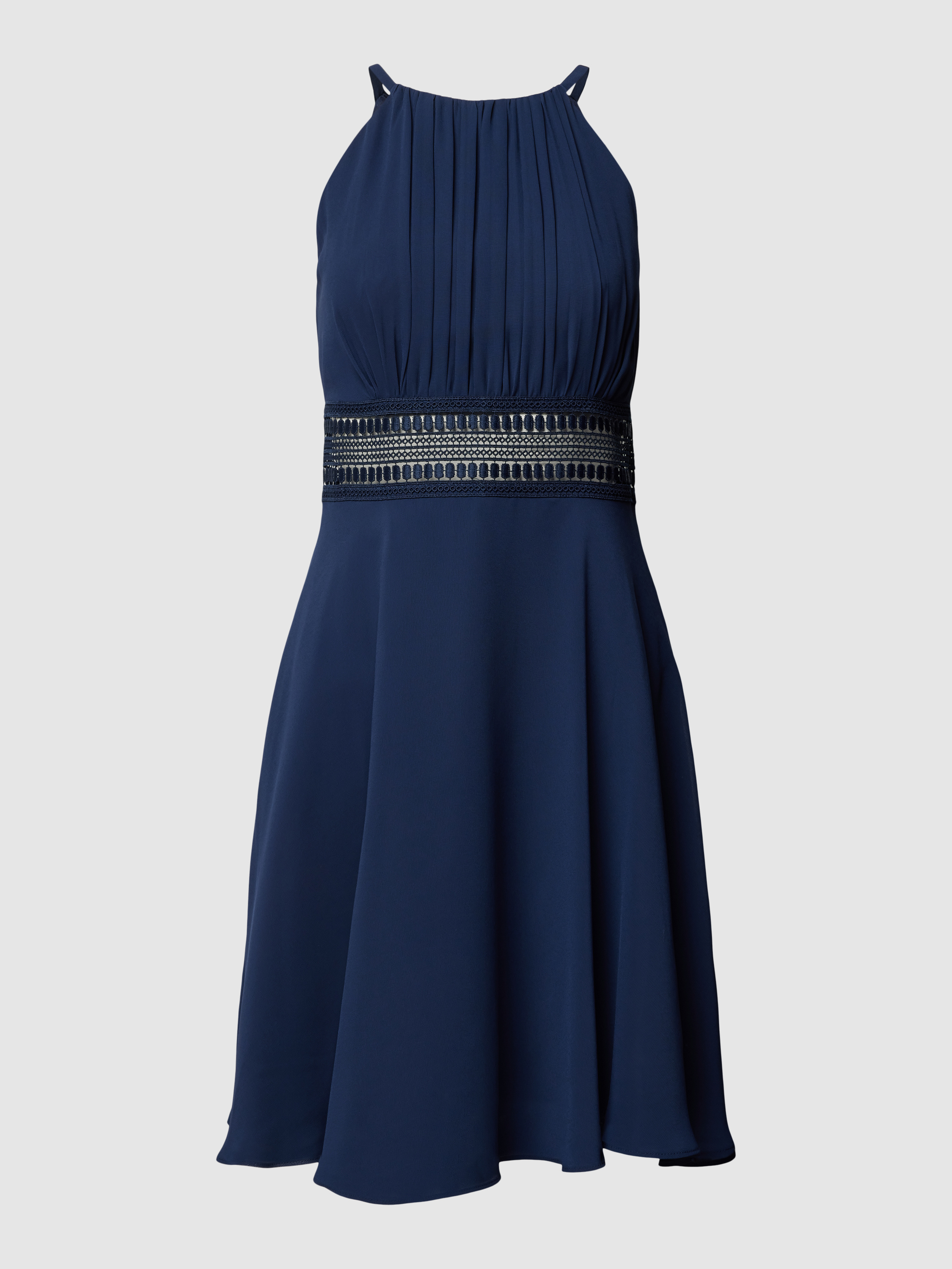 Knielange cocktailjurk met spaghettibandjes in marineblauw
