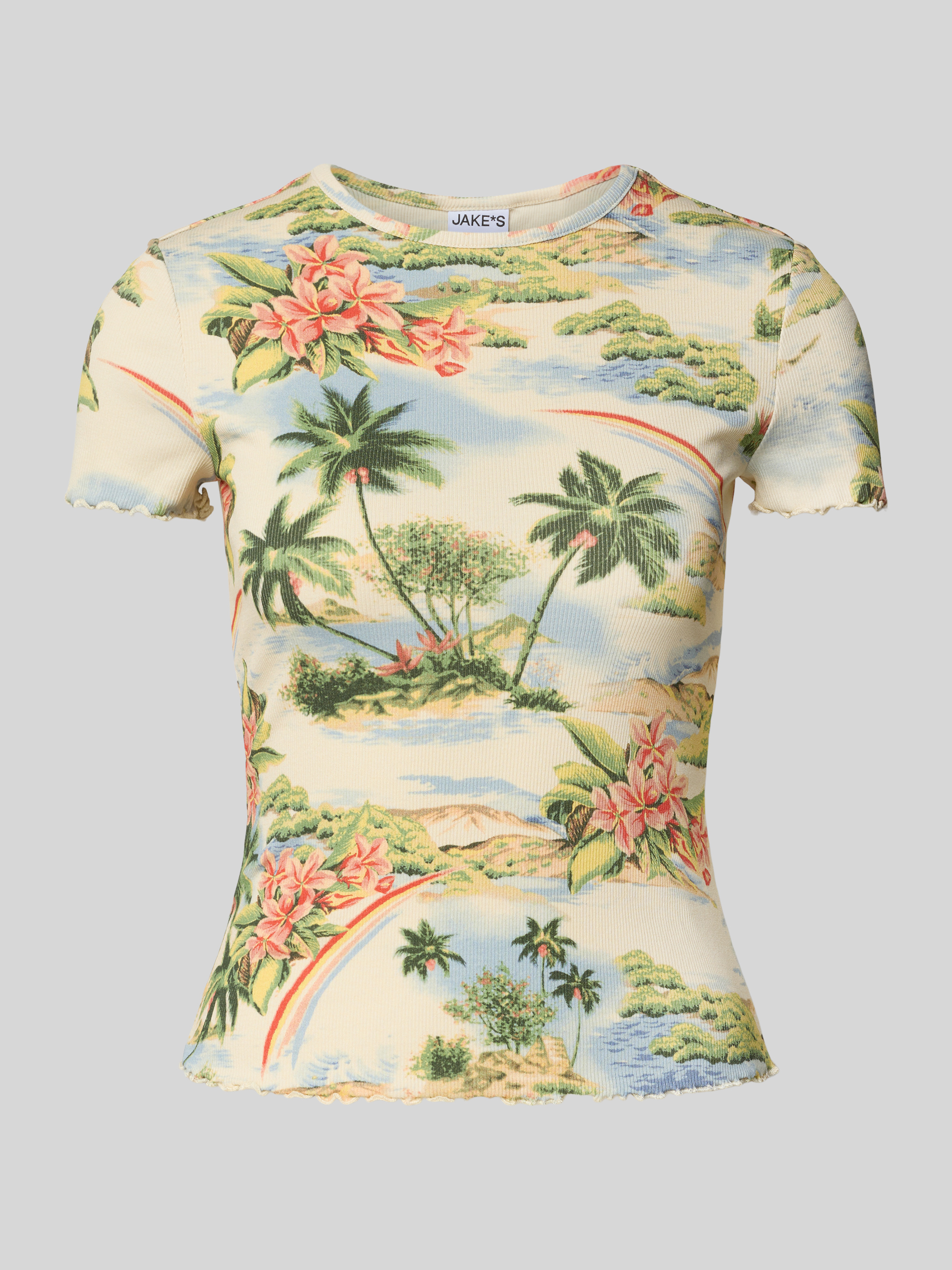 Jake*s CasualT-shirt in riblook met golvende zoom in ecru