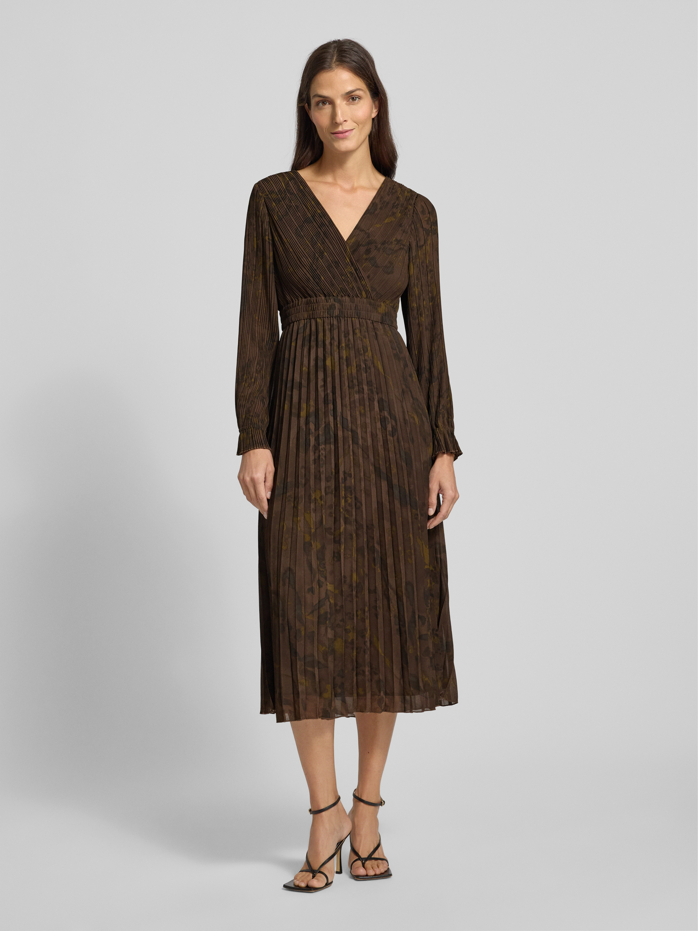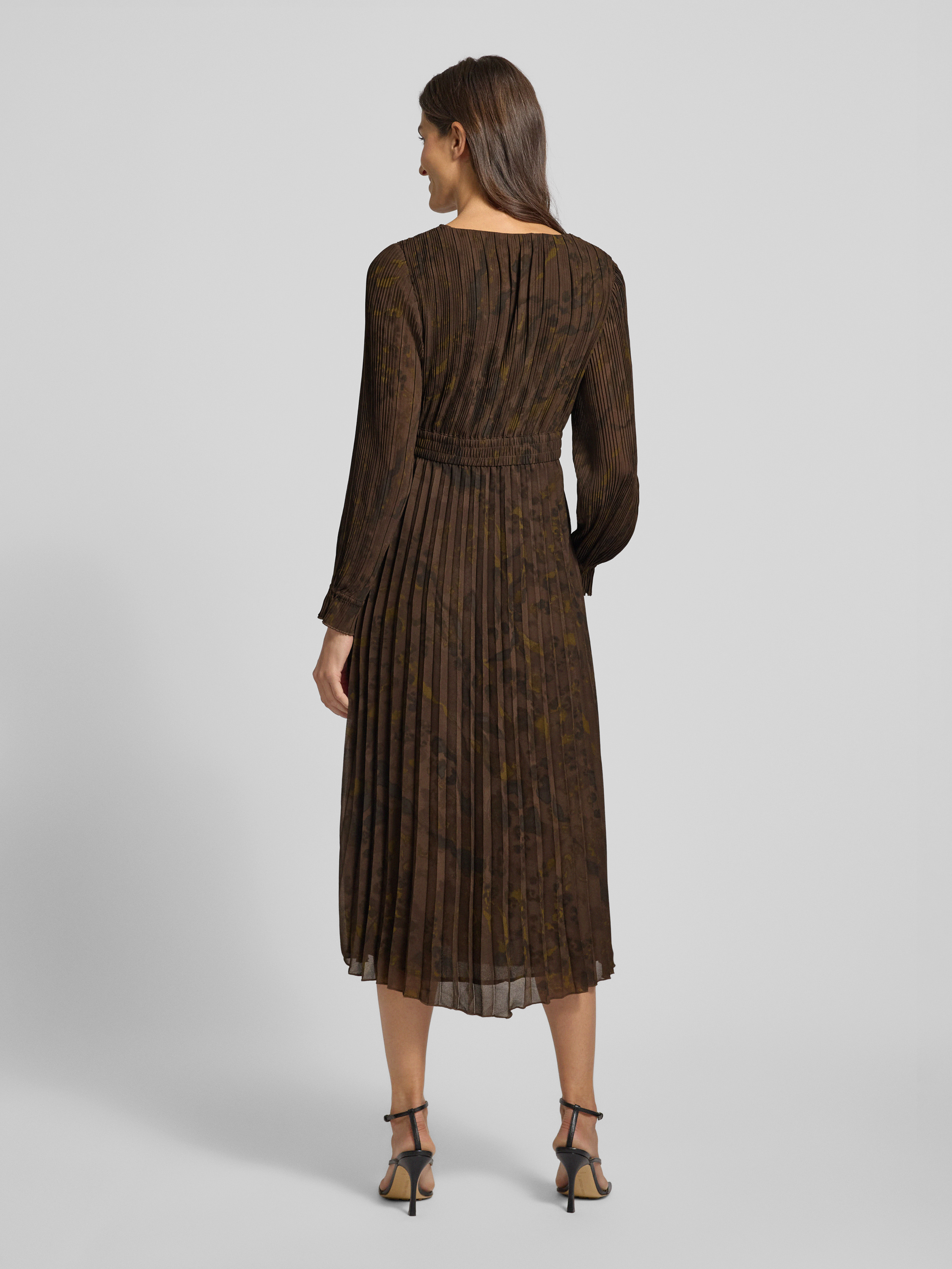 Midi-jurk met plissévouwen en V-hals in donkerbruin