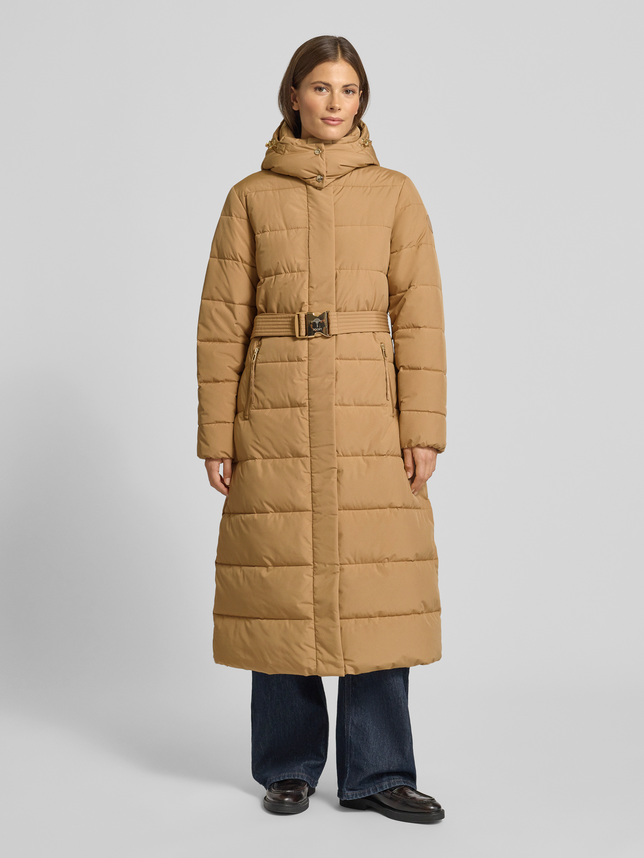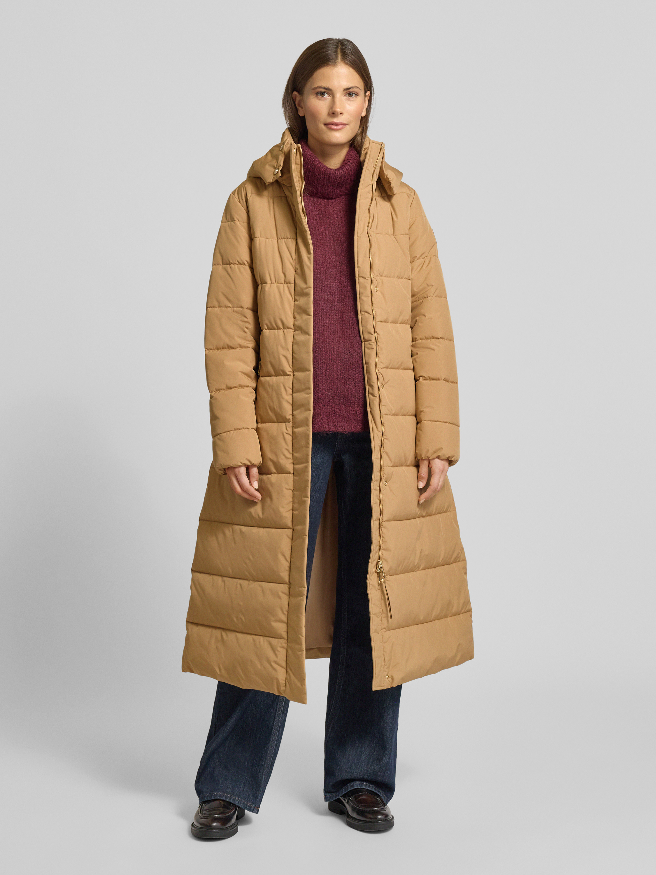 Gewatteerde lange jas met capuchon, model 'Cassandra' in camel