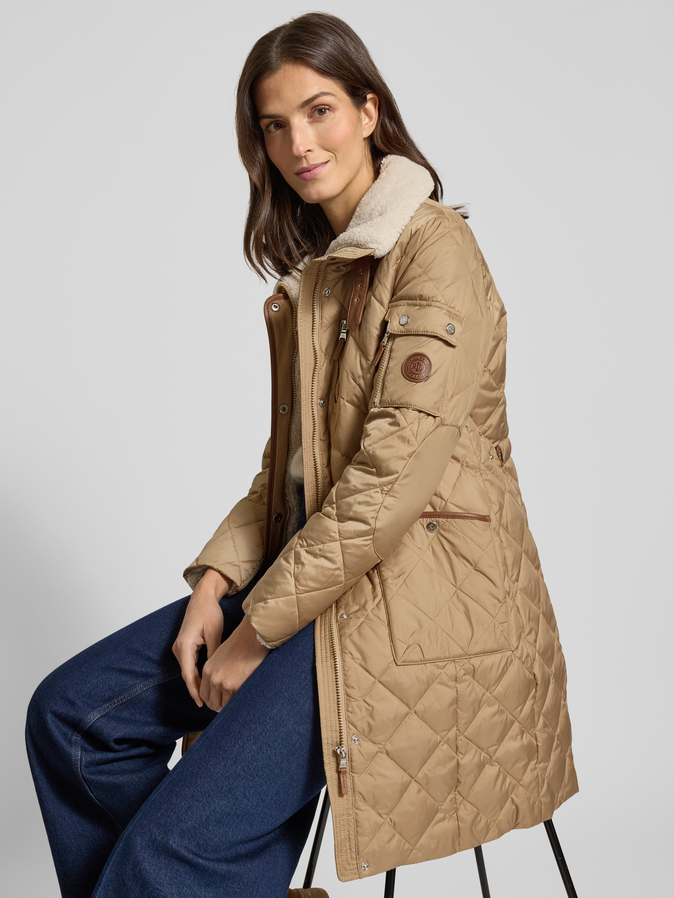 Lauren Ralph LaurenGewatteerde lange jas met opstaande kraag en ritssluiting in beige