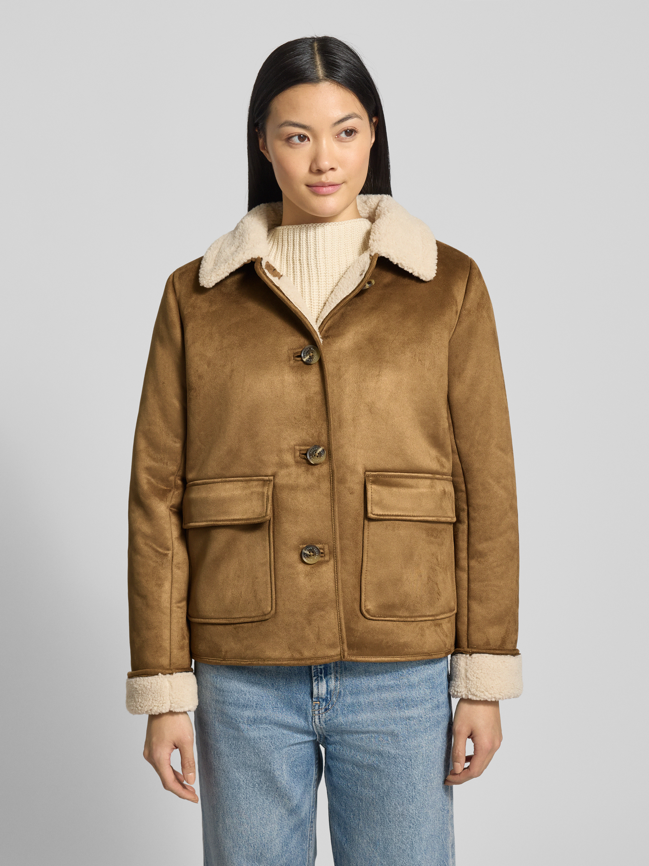 Jack met voering van teddybont en klepzakken in camel