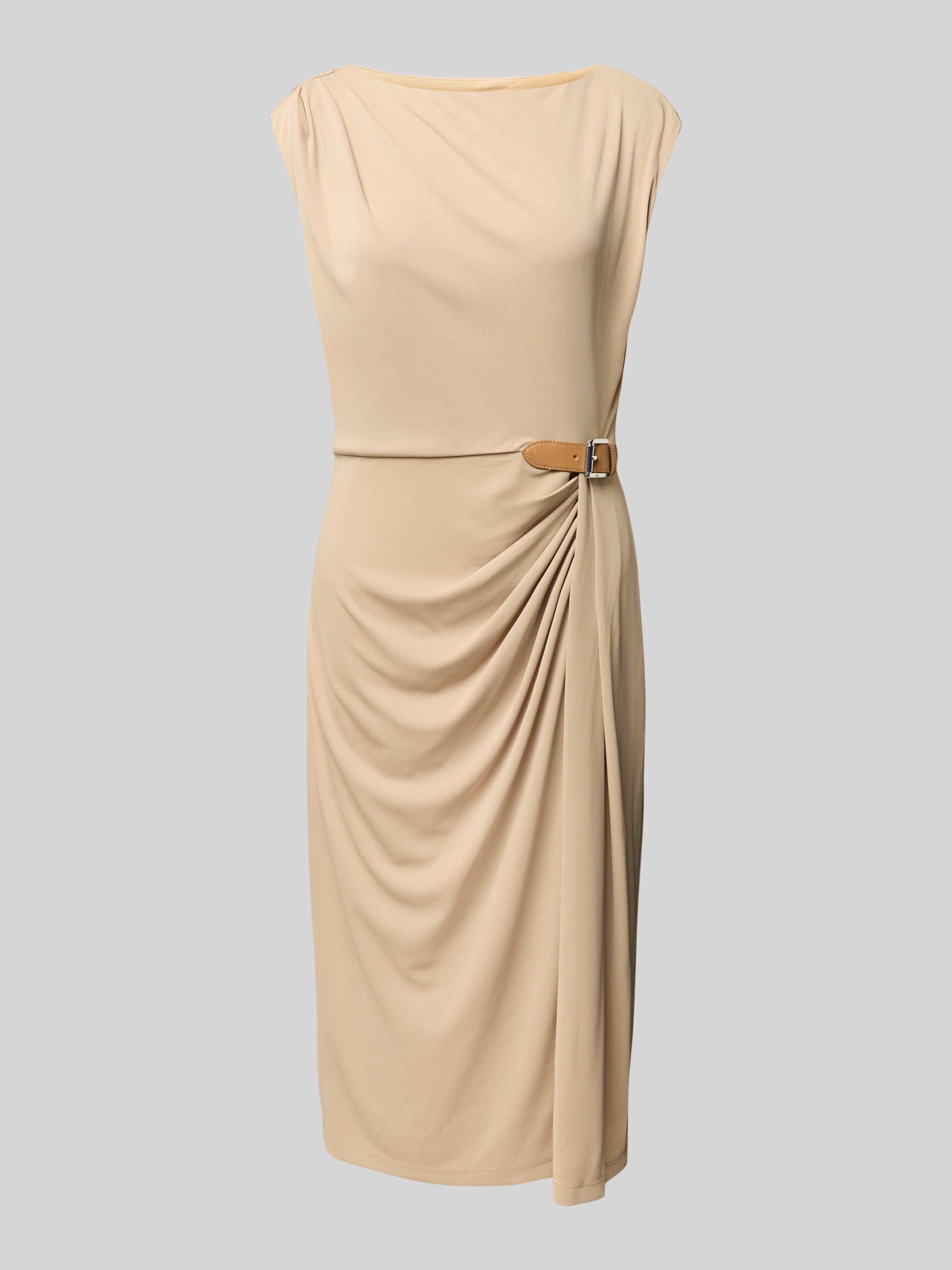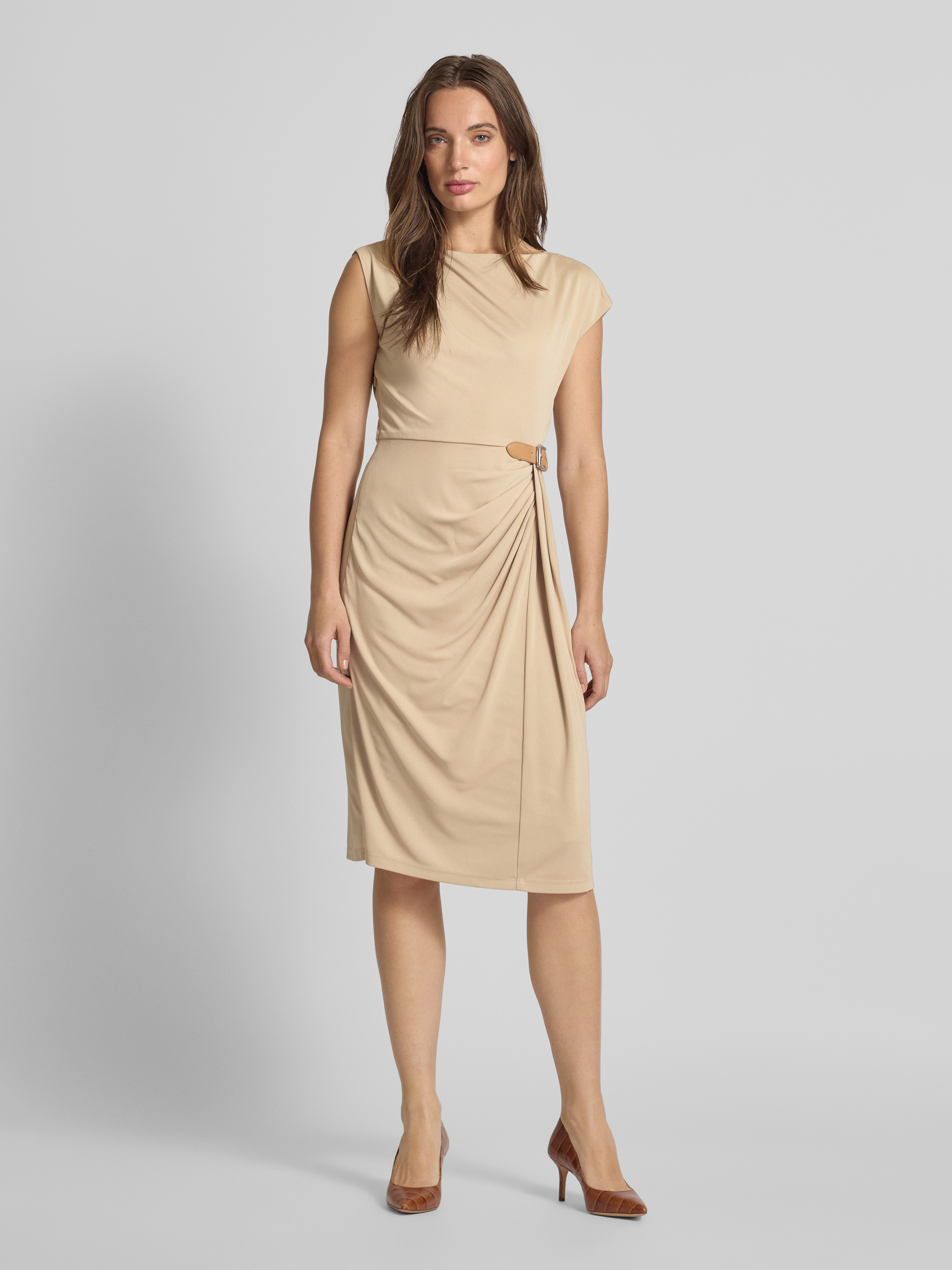 Knielange jurk met plooien, model 'BRECKA' in zand