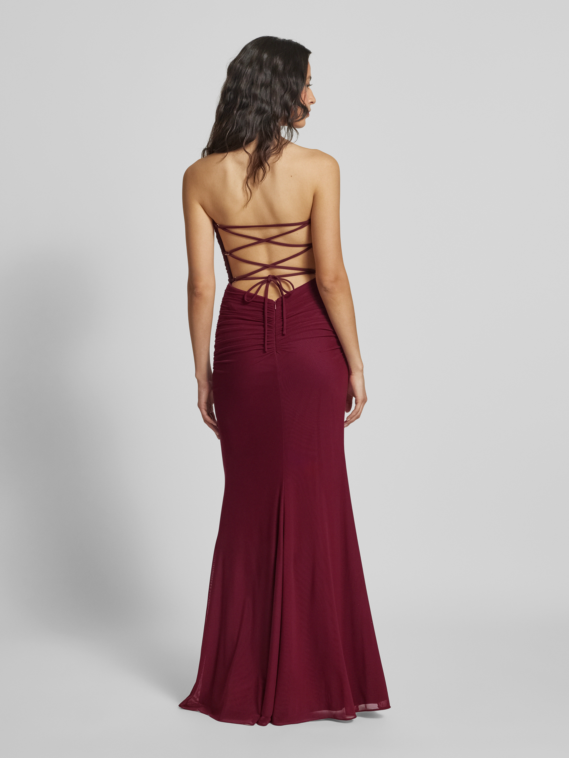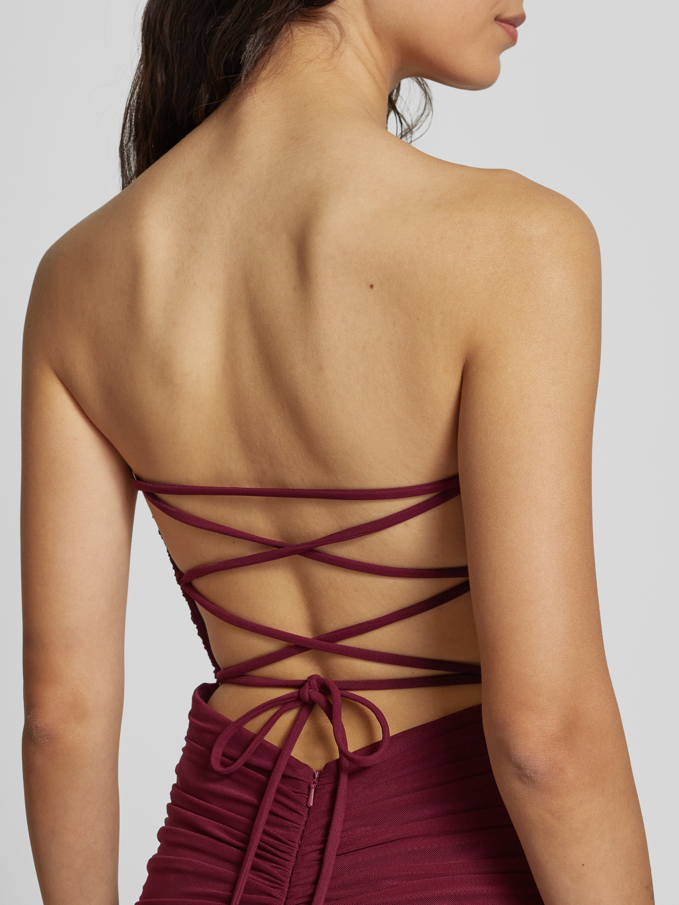Avondjurk met vetersluiting aan de achterkant en plooien in bordeaux