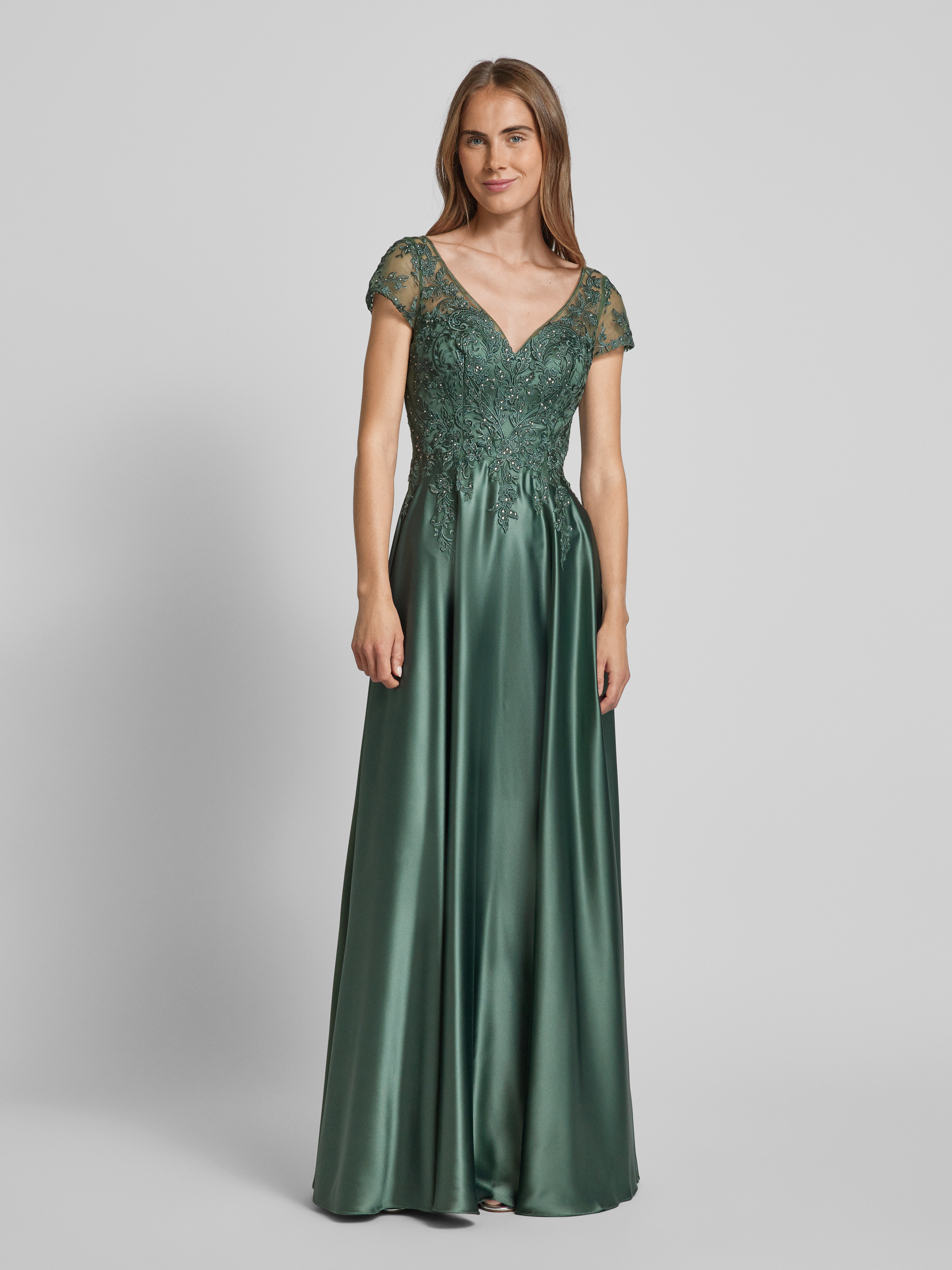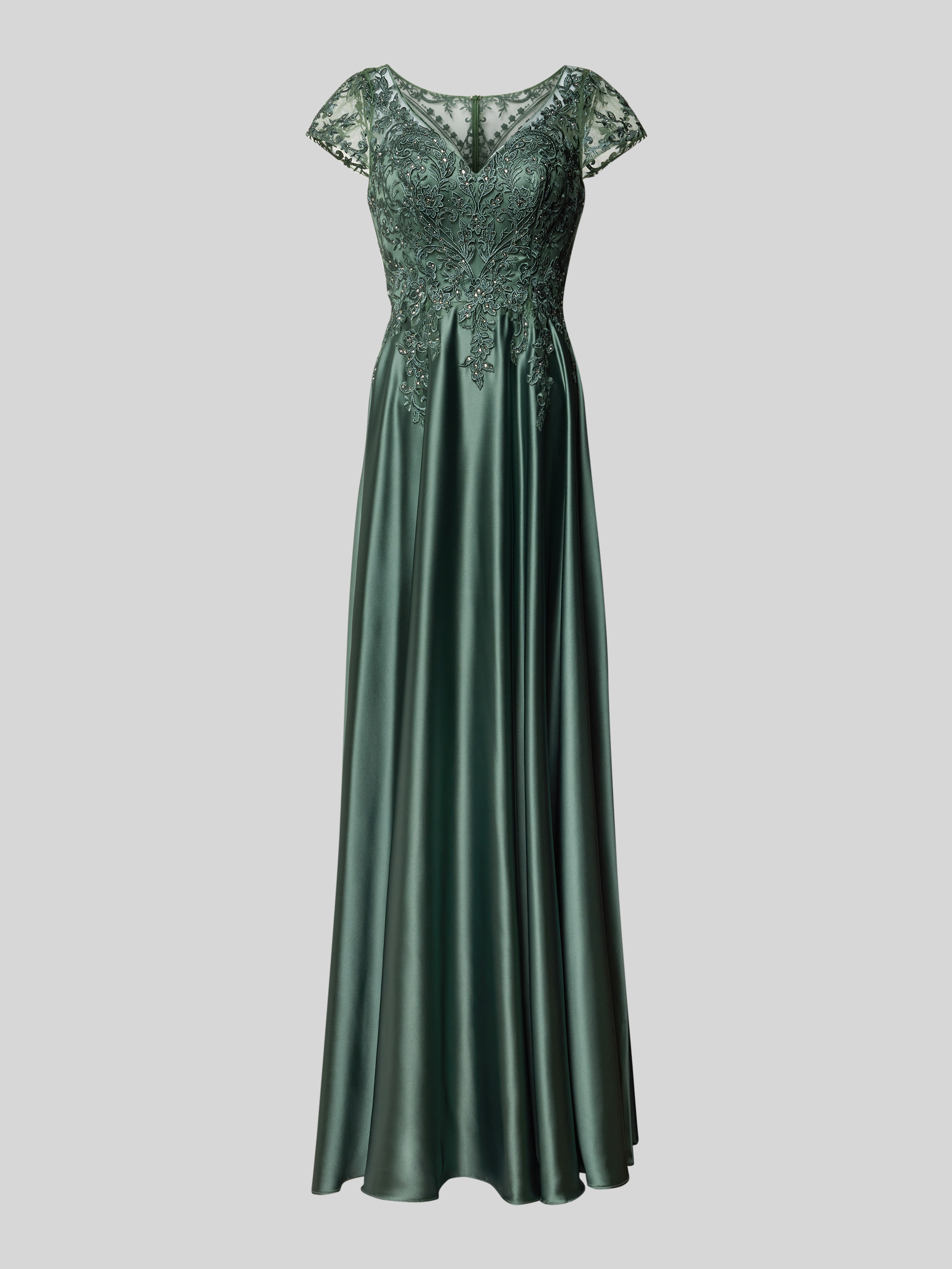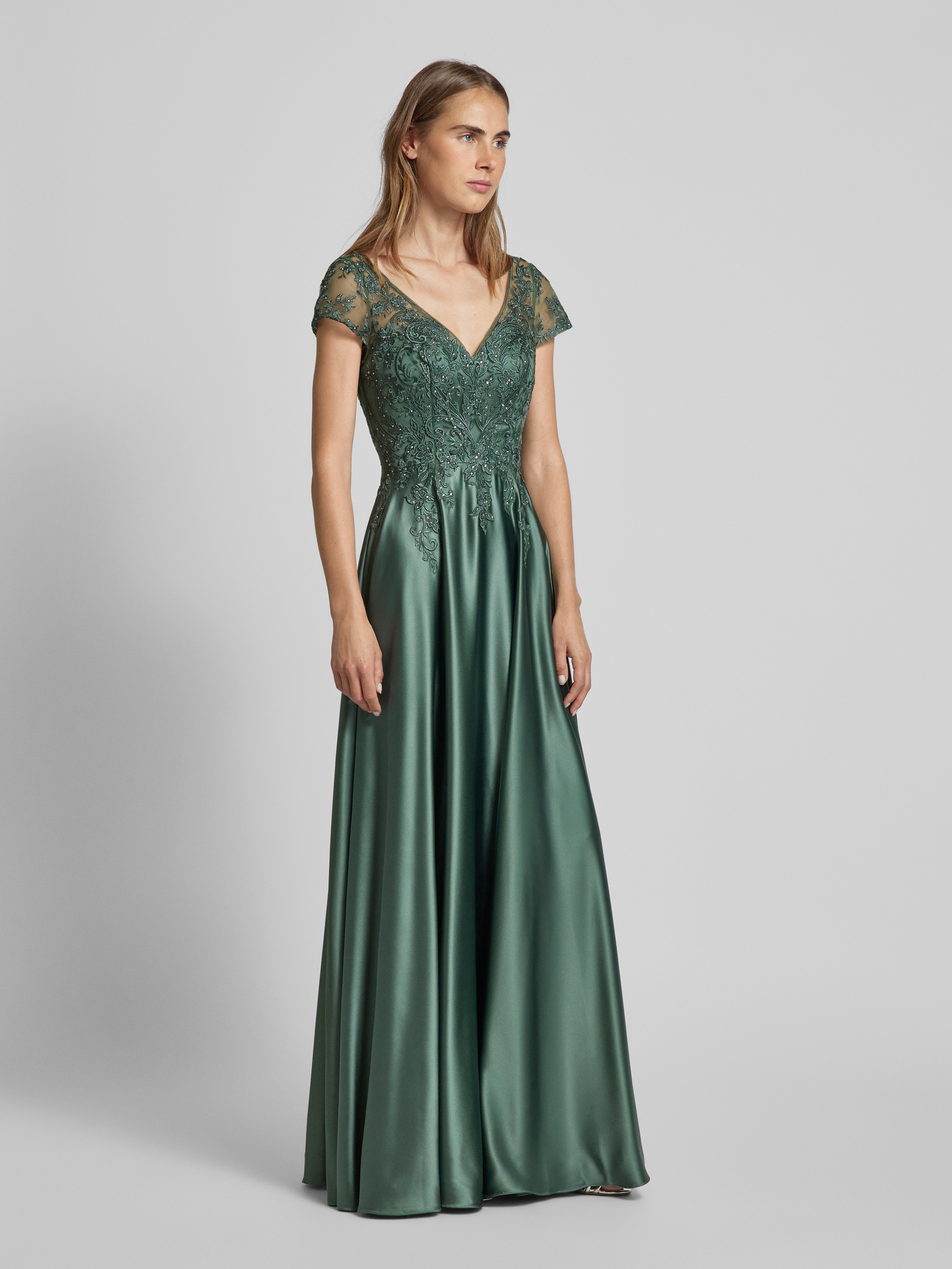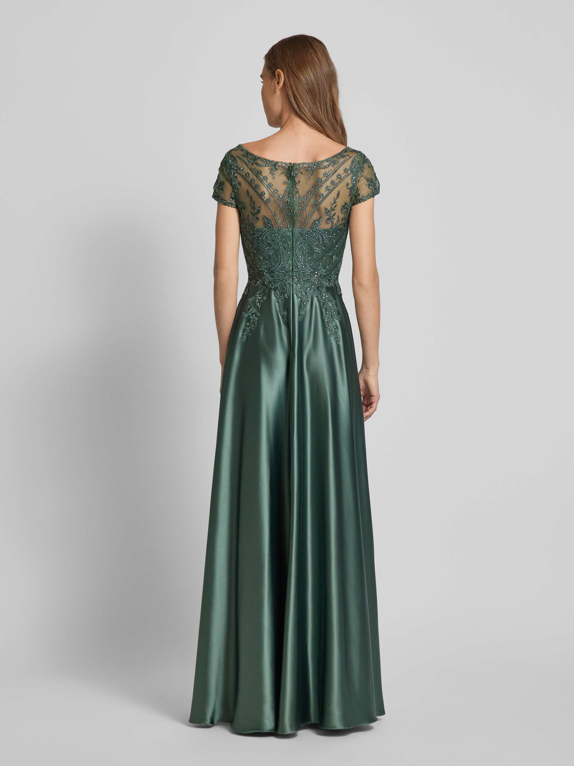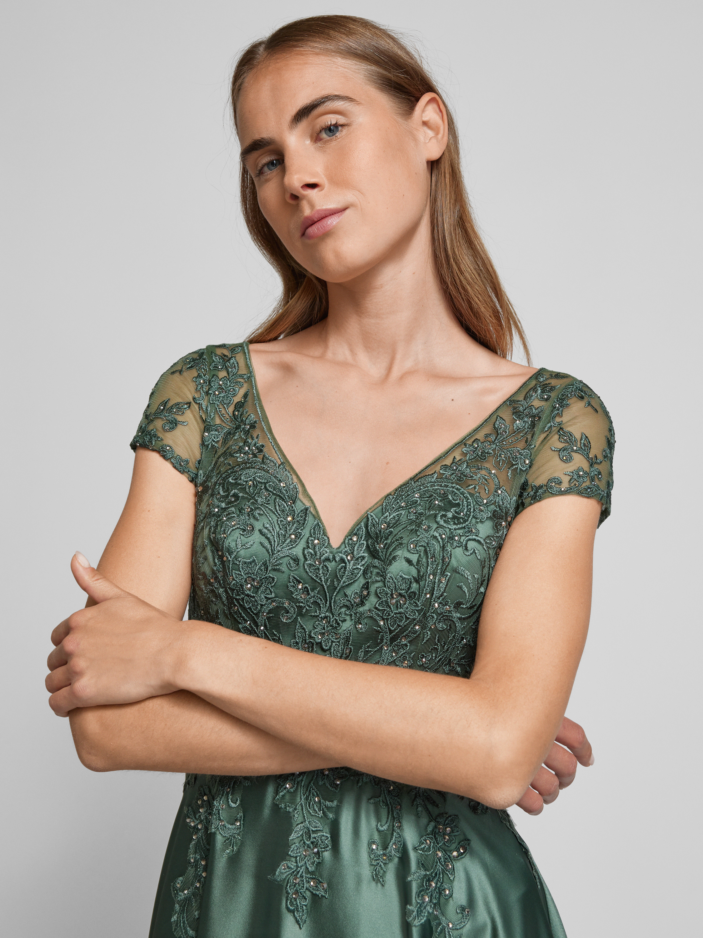 Getailleerde avondjurk met kant en siersteentjes in donkergroen