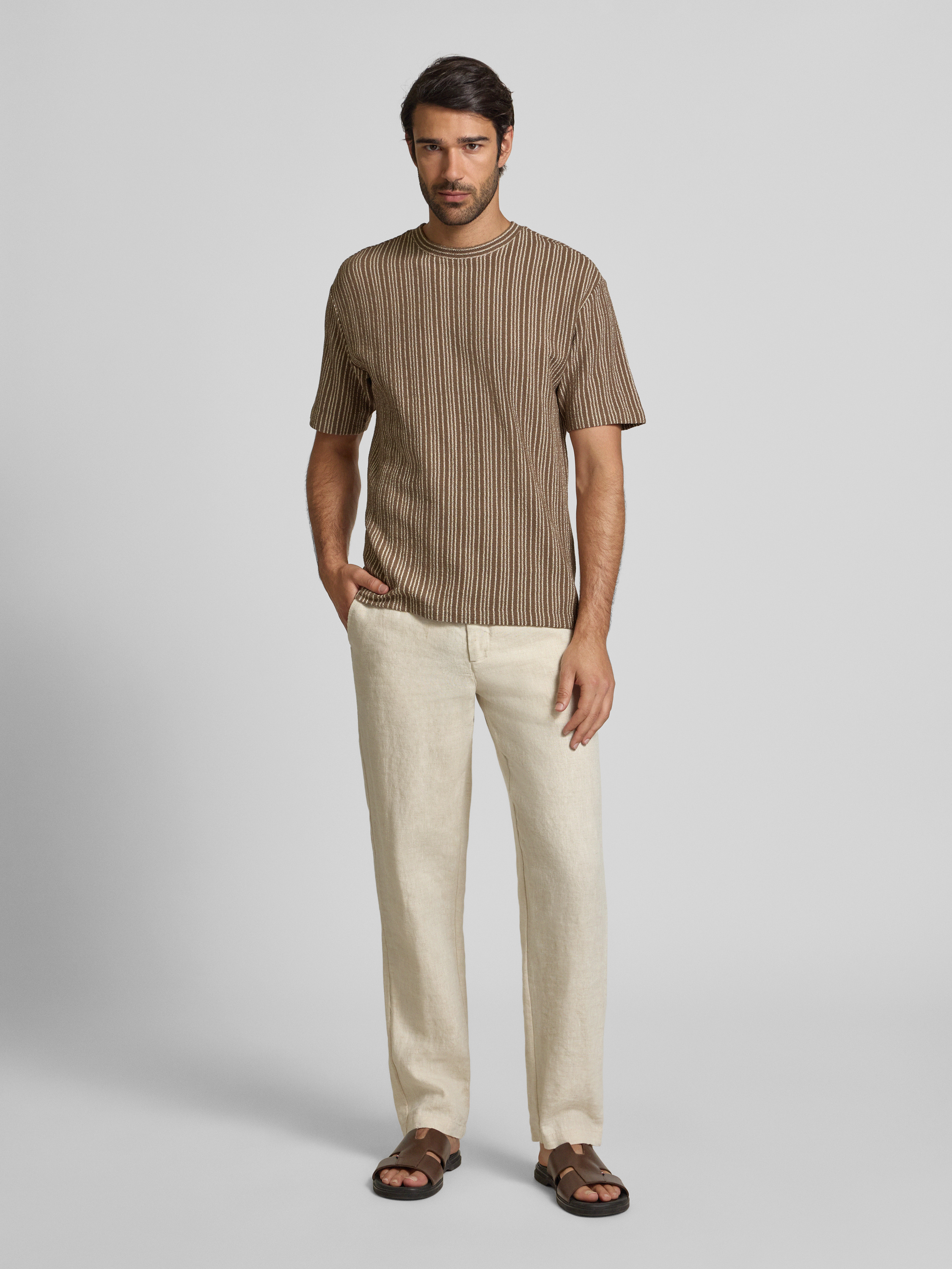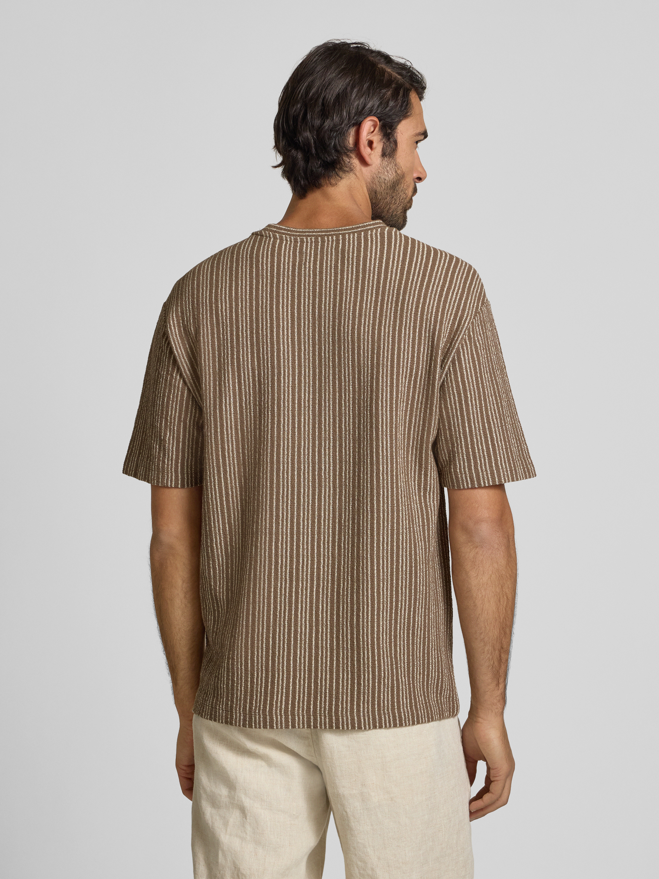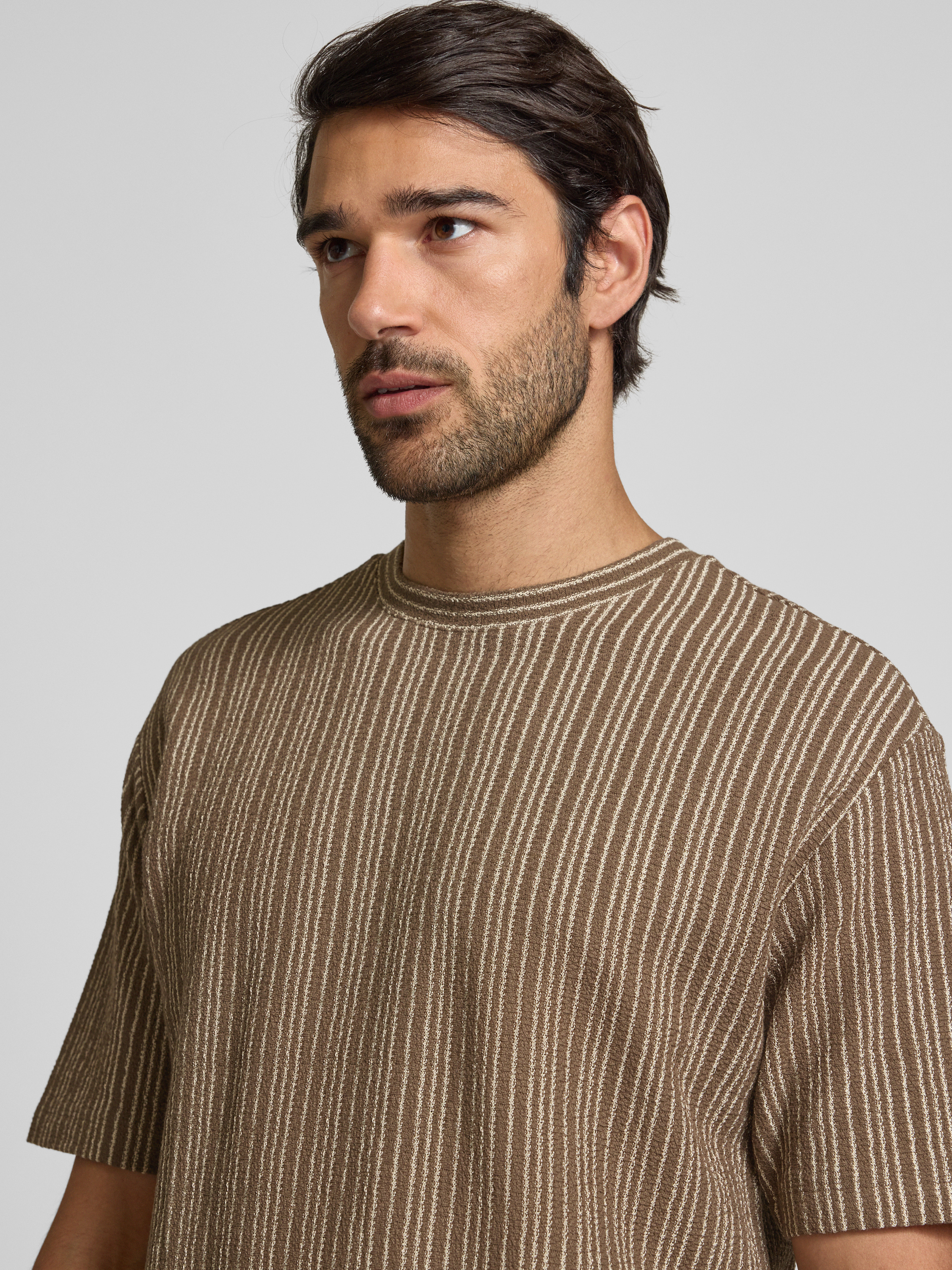 T-shirt met geribde ronde hals in middenbruin