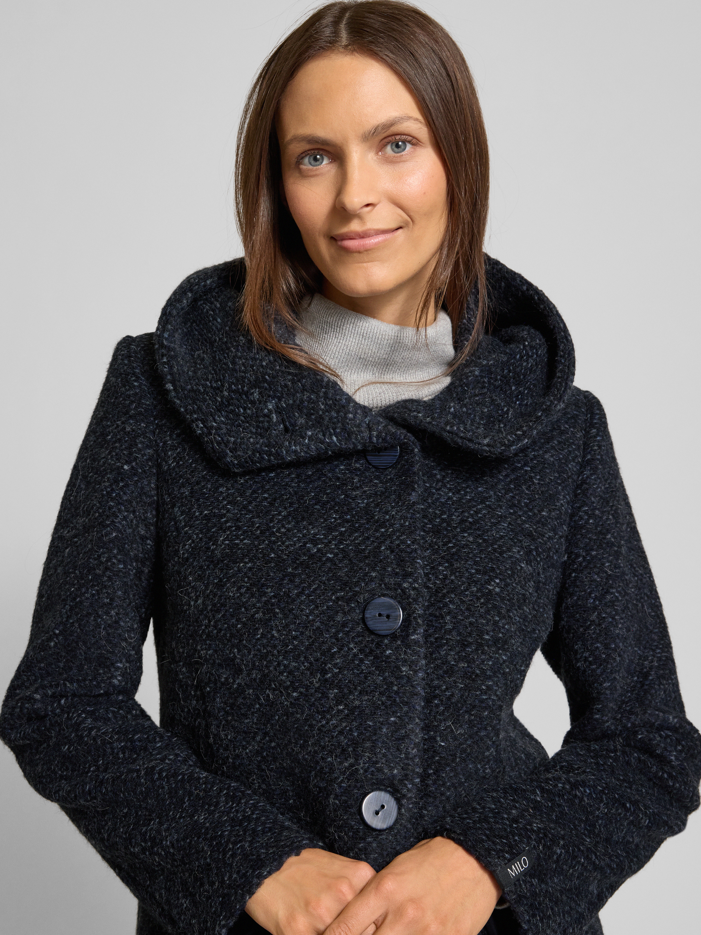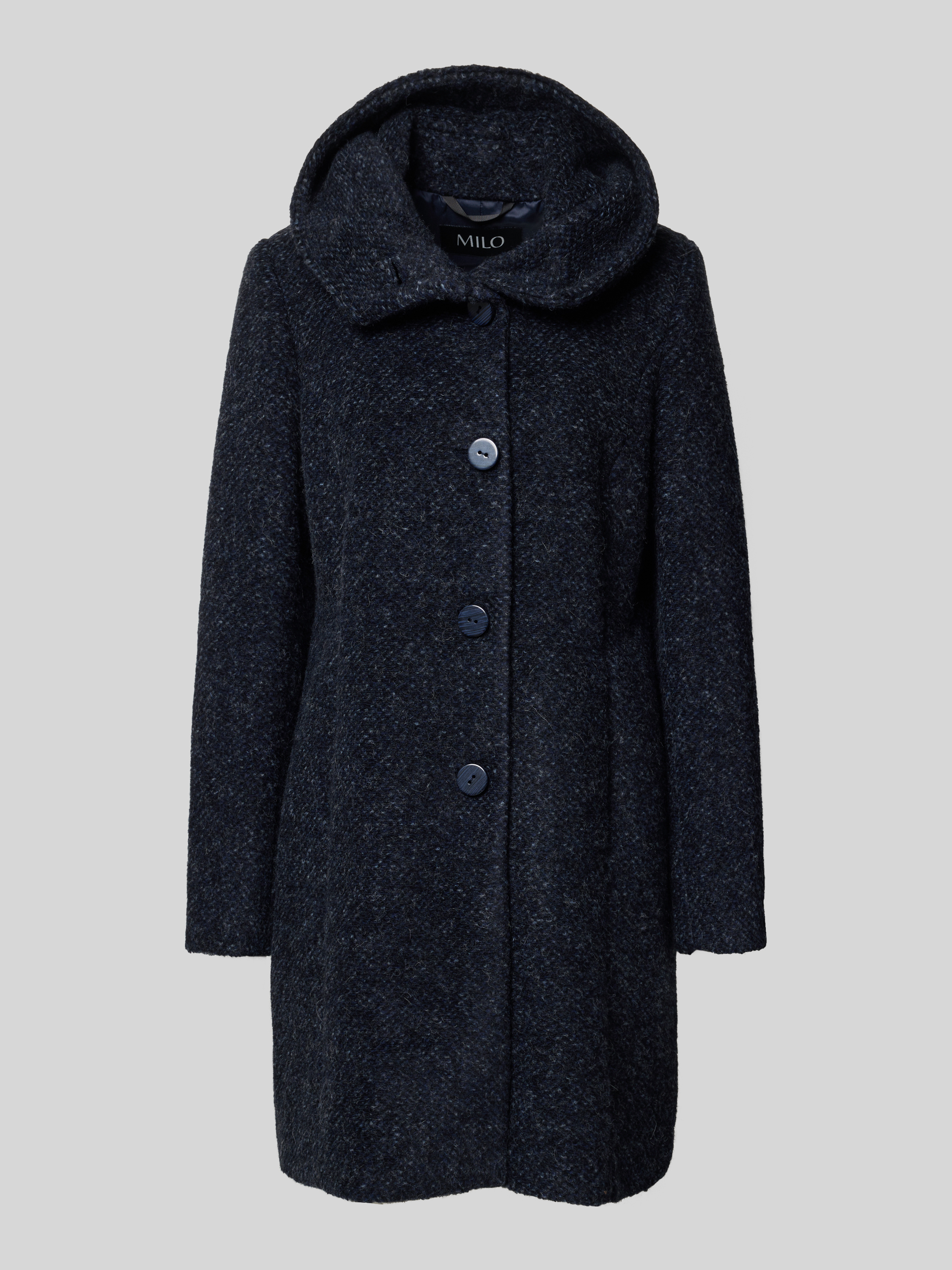 Lange jas met capuchon en knoopsluiting, model 'STELLA' in marineblauw