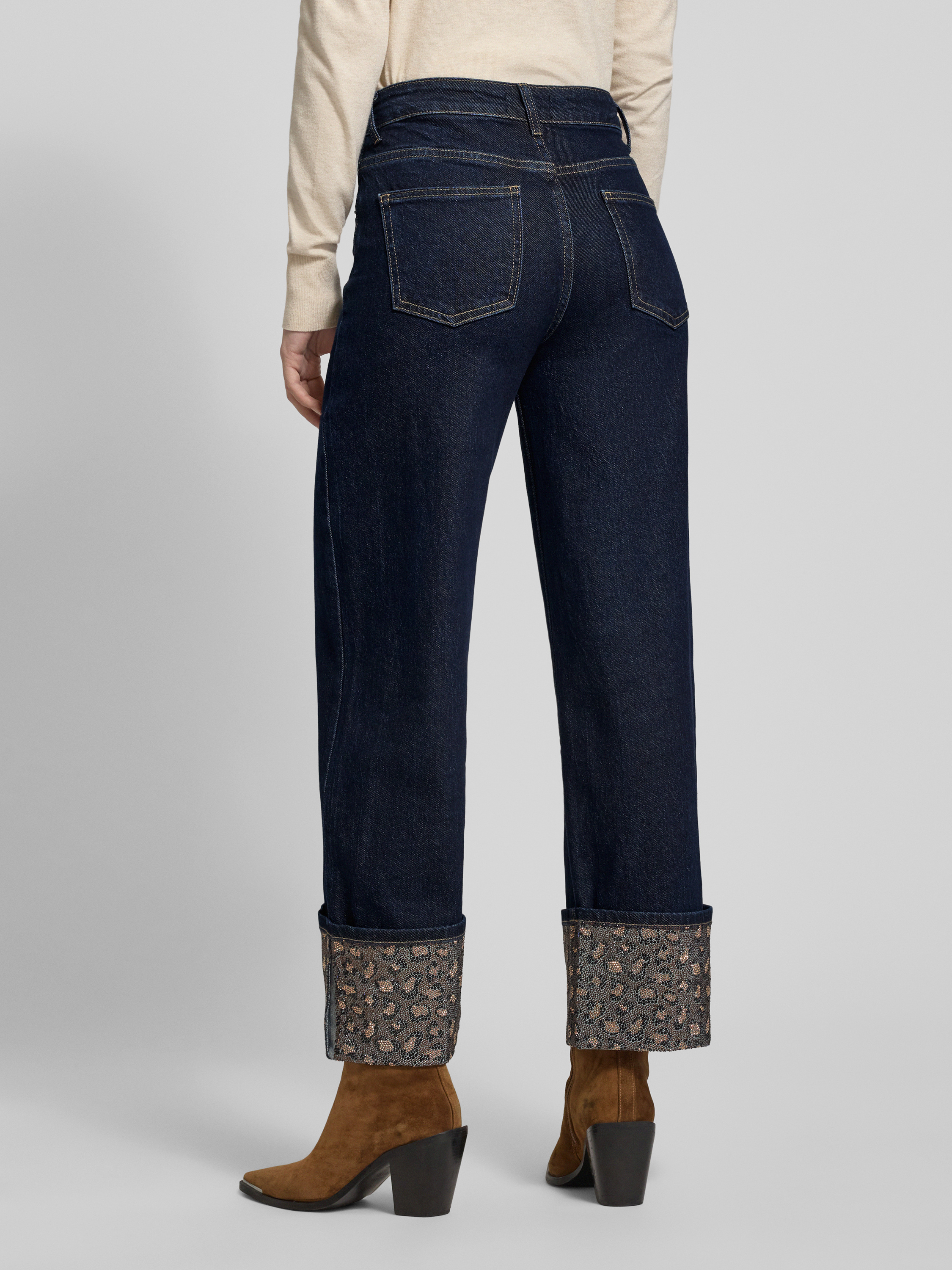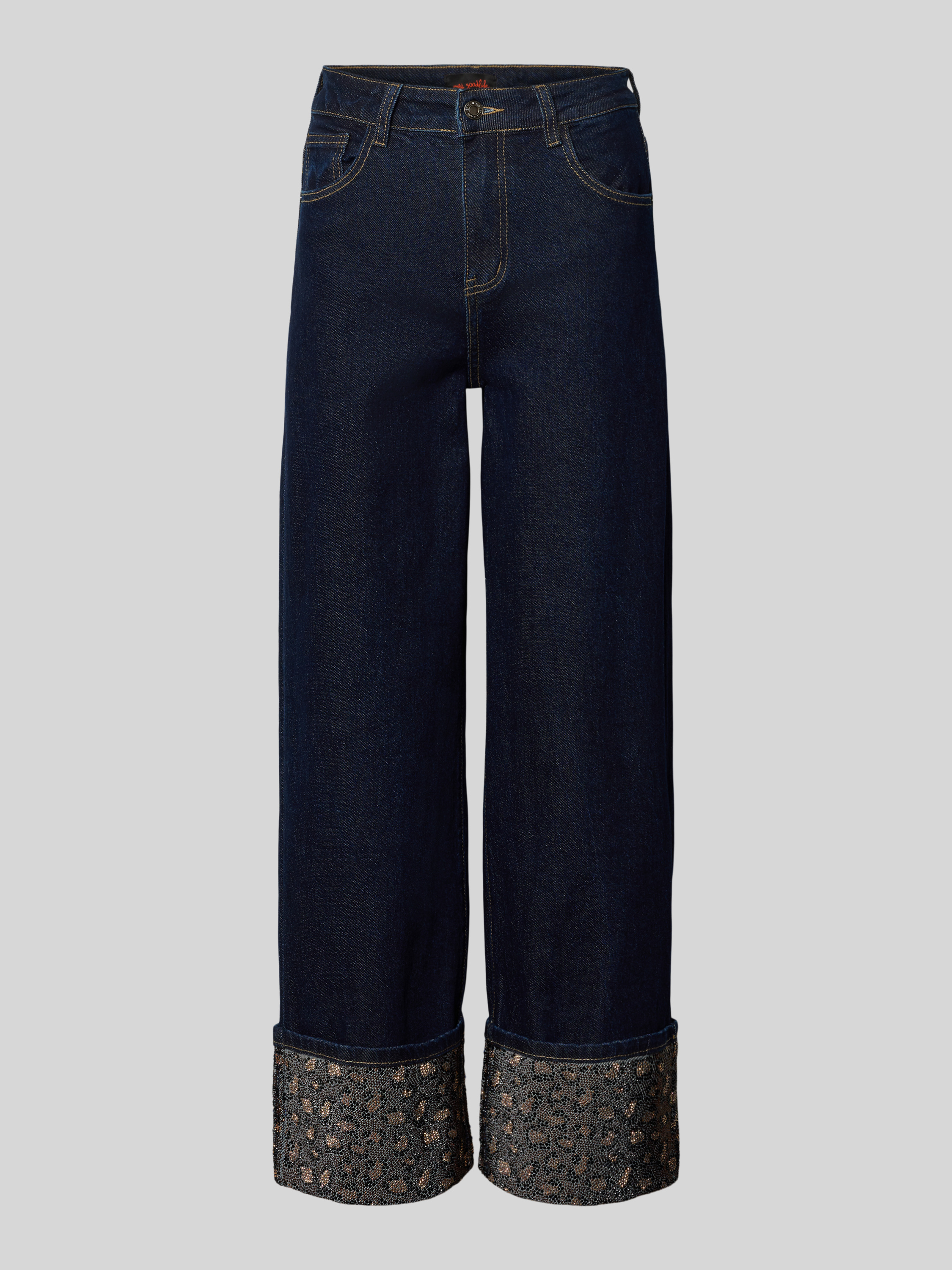 Straight fit jeans met omslag en siersteentjes in jeansblauw