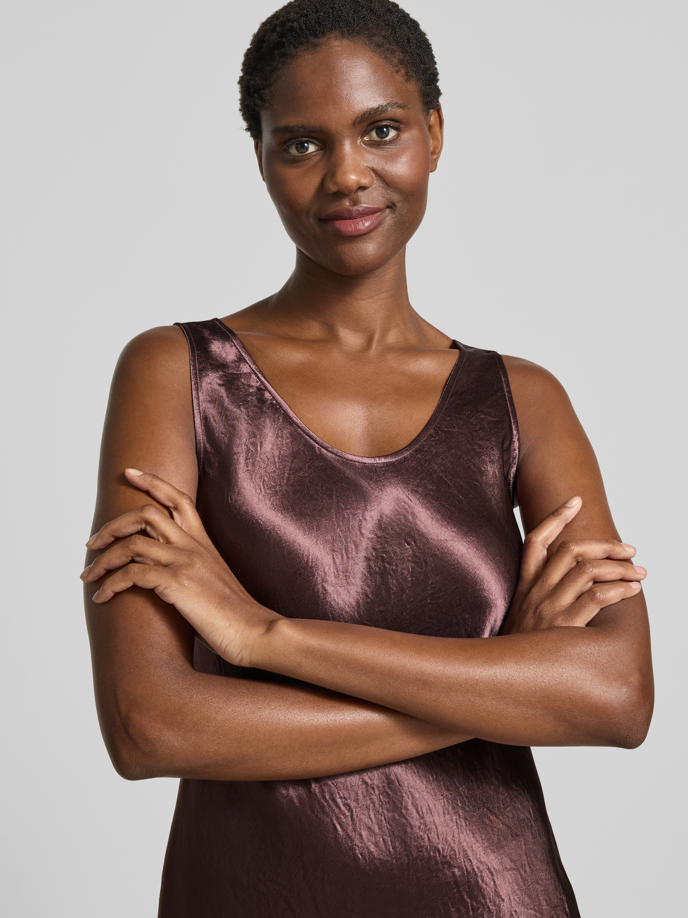 MMSoepele satijnen jurk met brede bandjes, model 'TALETE' in aubergine