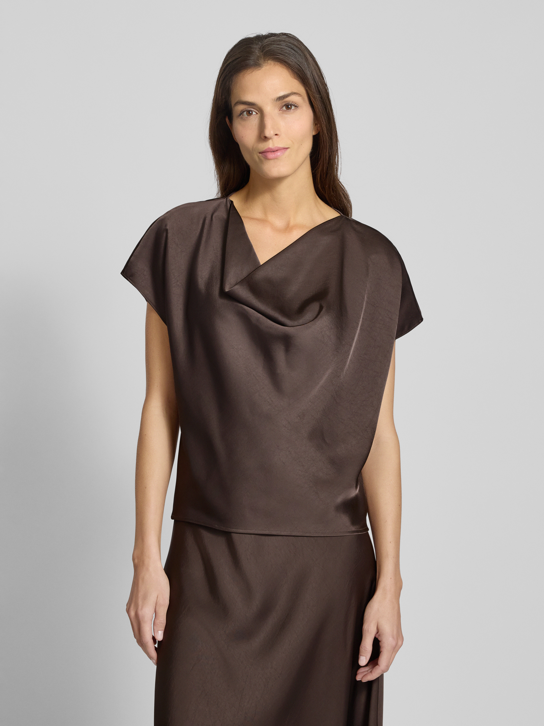 Blouseshirt-van satijn met cascadehals, model 'Annabeth' in donkerbruin
