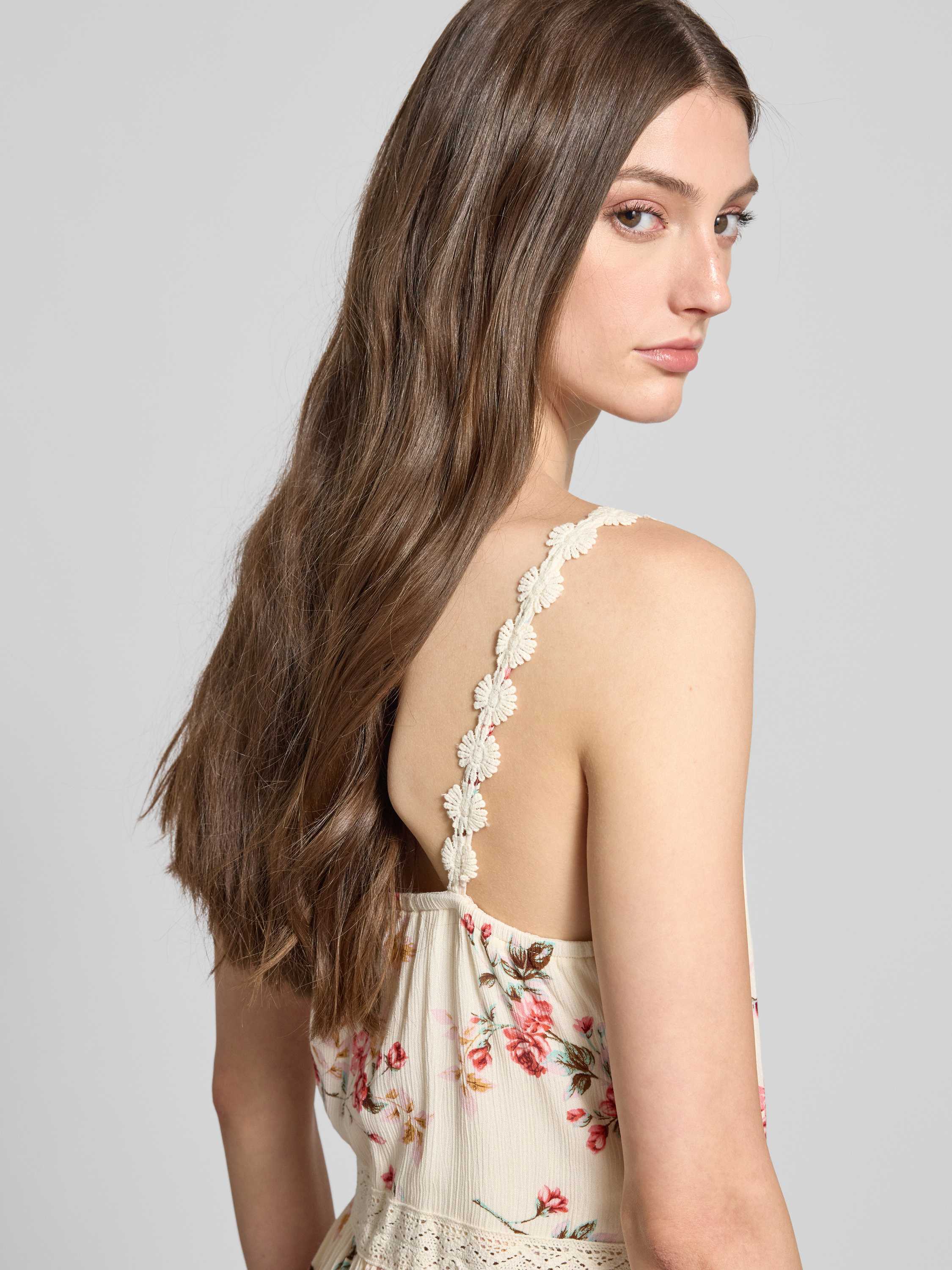 Model met bandjes: Spaghettibandjes met bloemenversiering