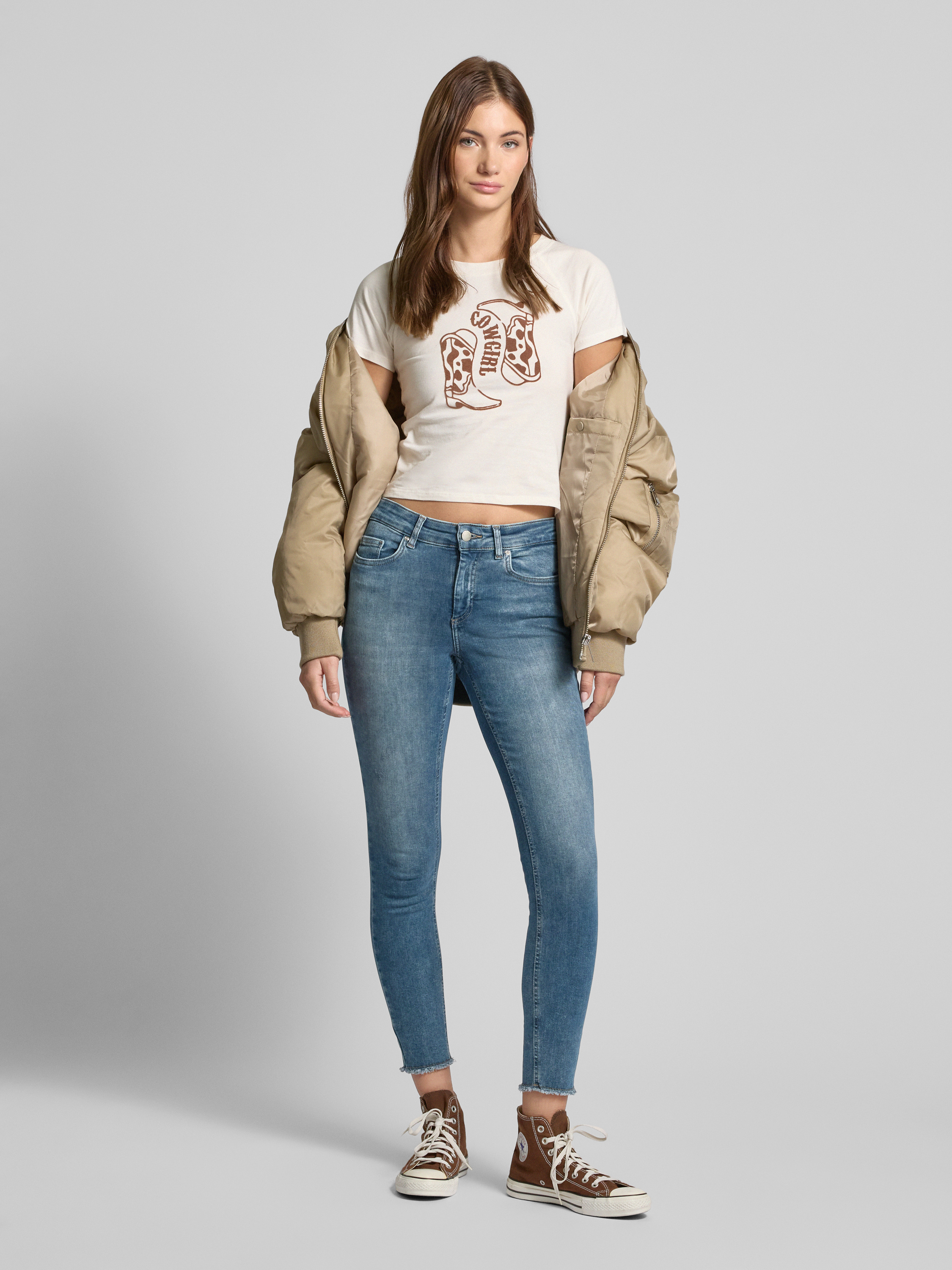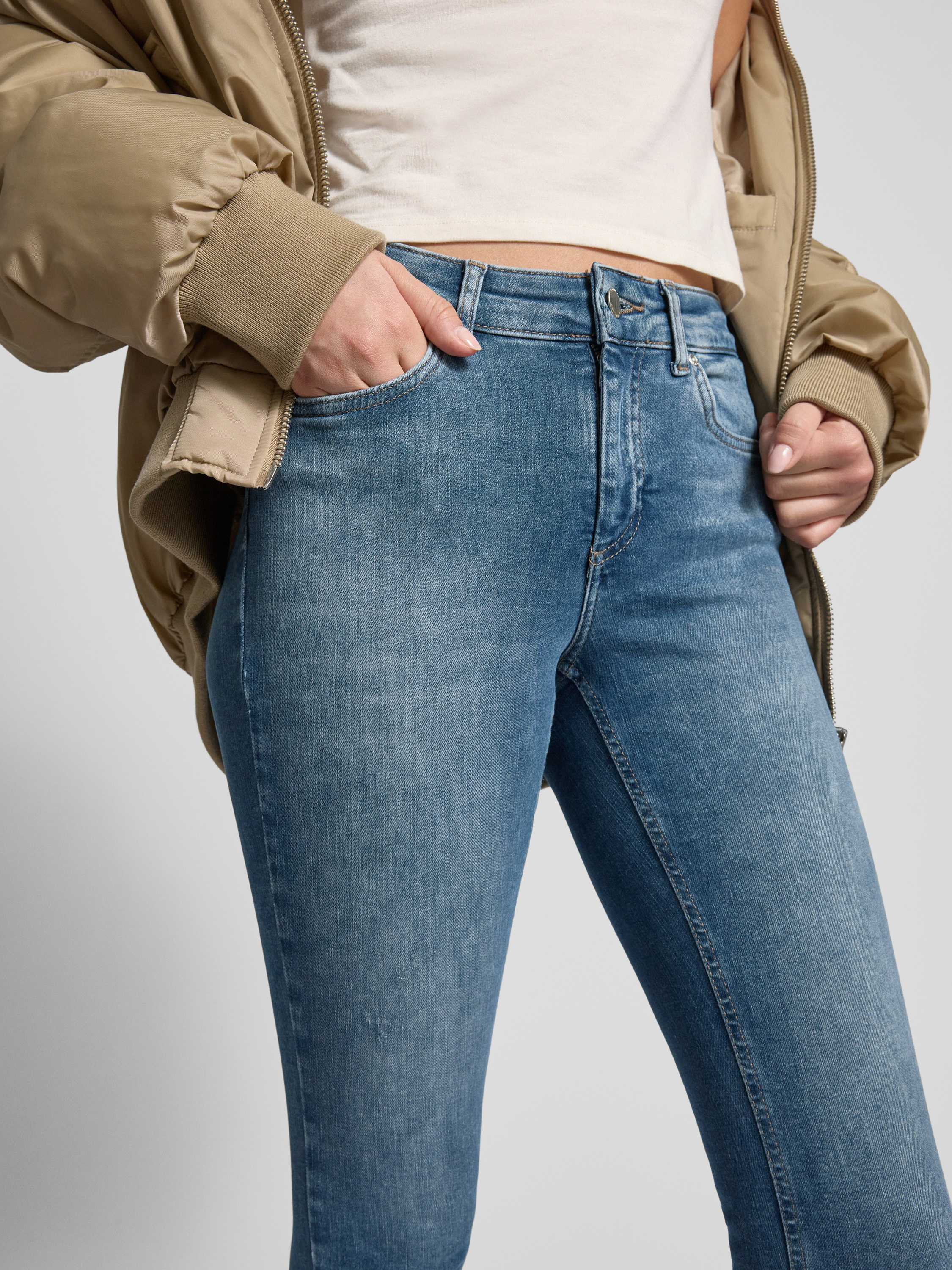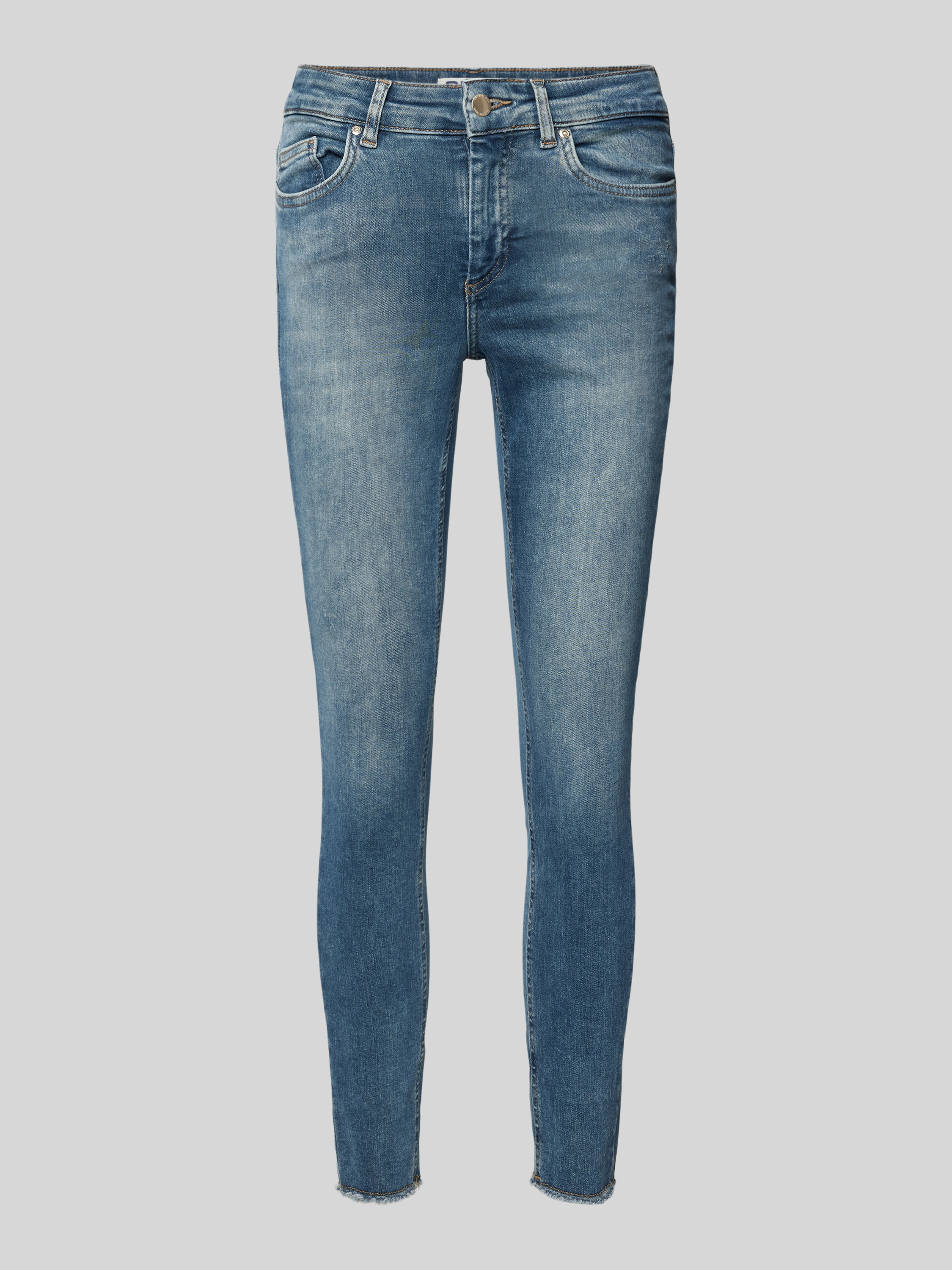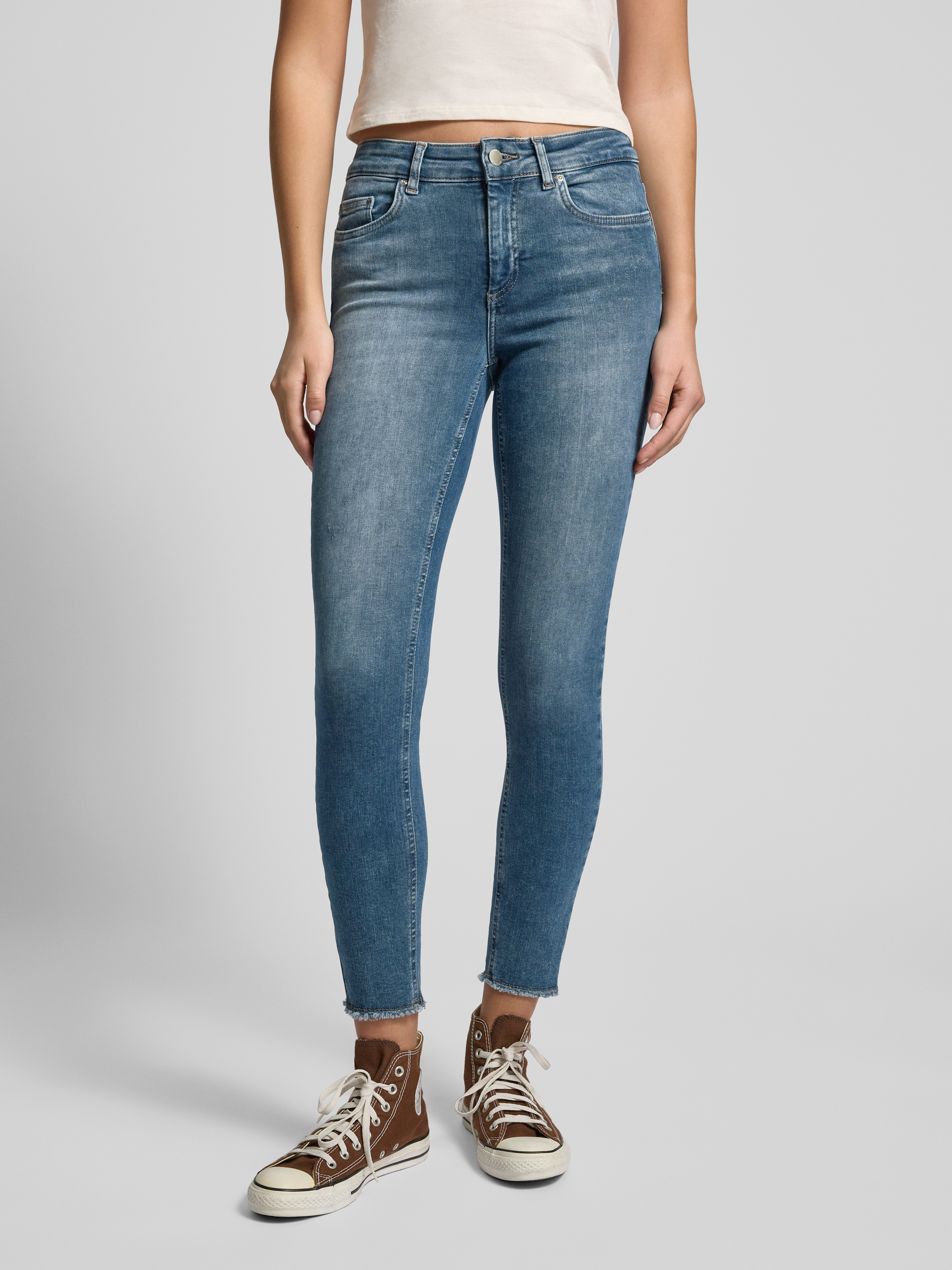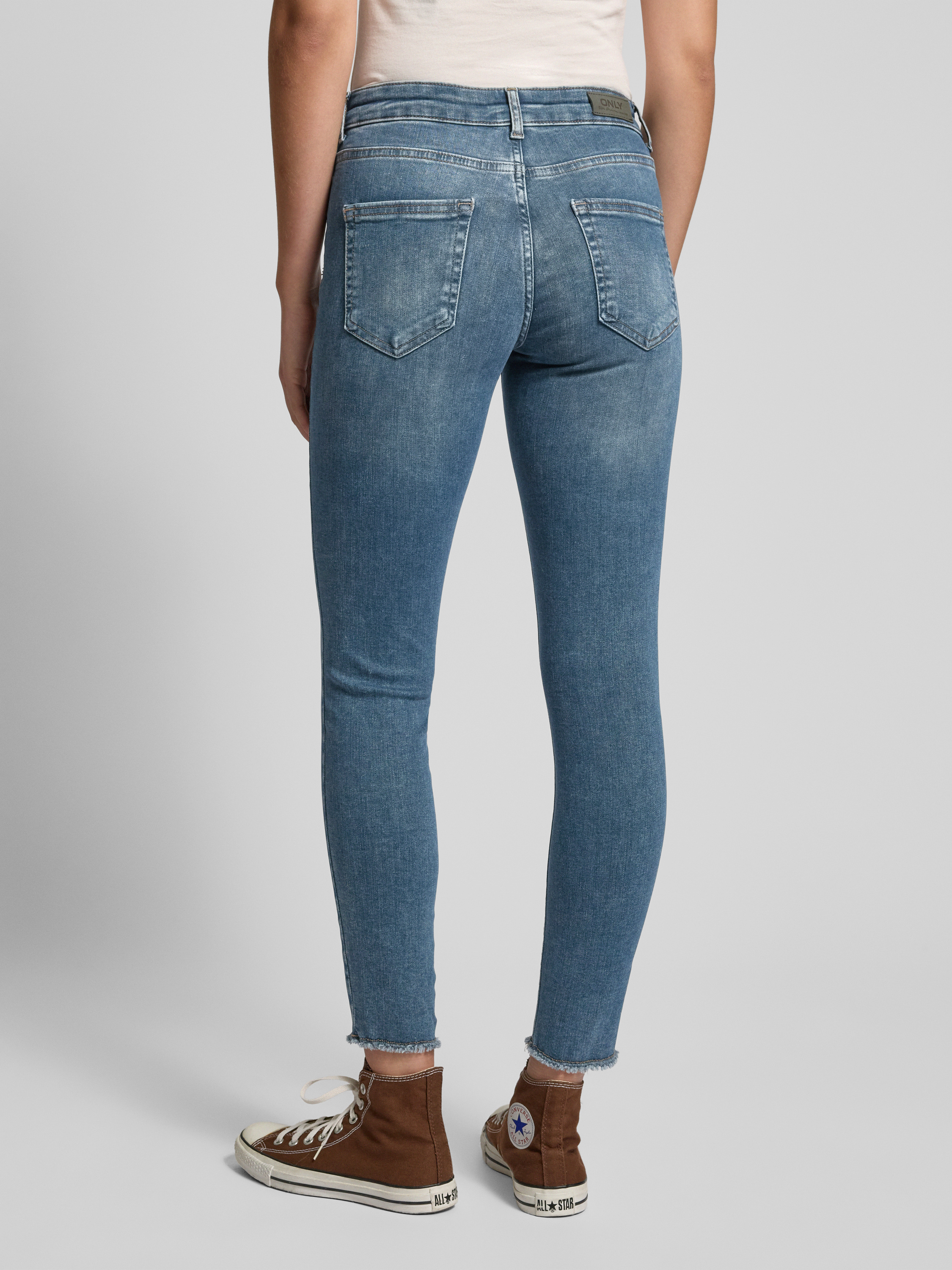 Skinny fit jeans van katoenmix met pijpen met franjes, model 'BLUSH' in jeansblauw