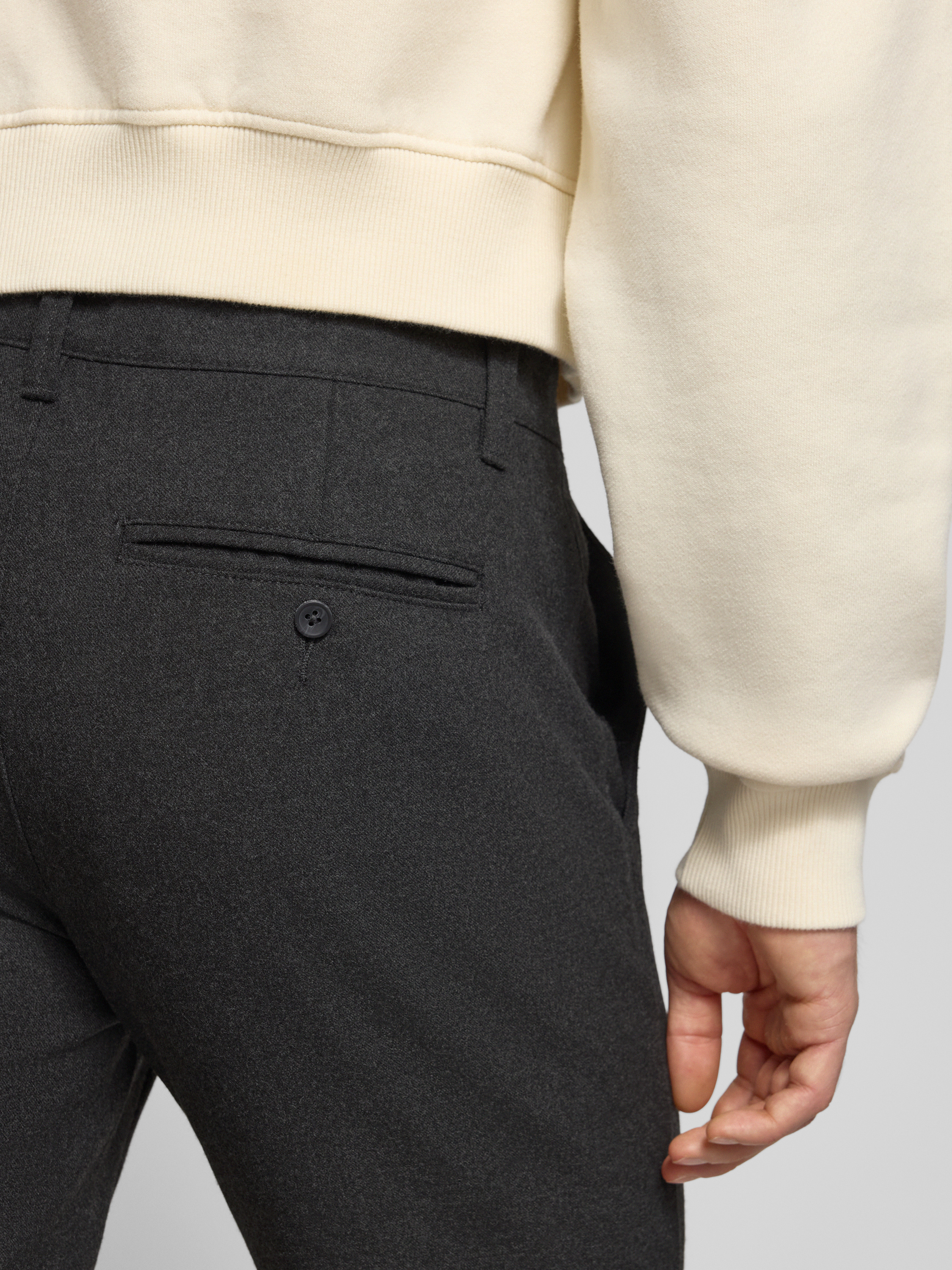Zakken: steekzakken opzij, achterzakken met knoop