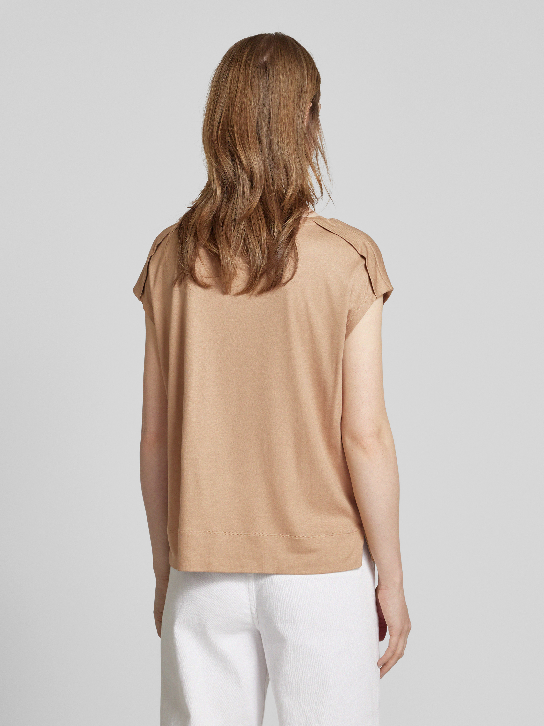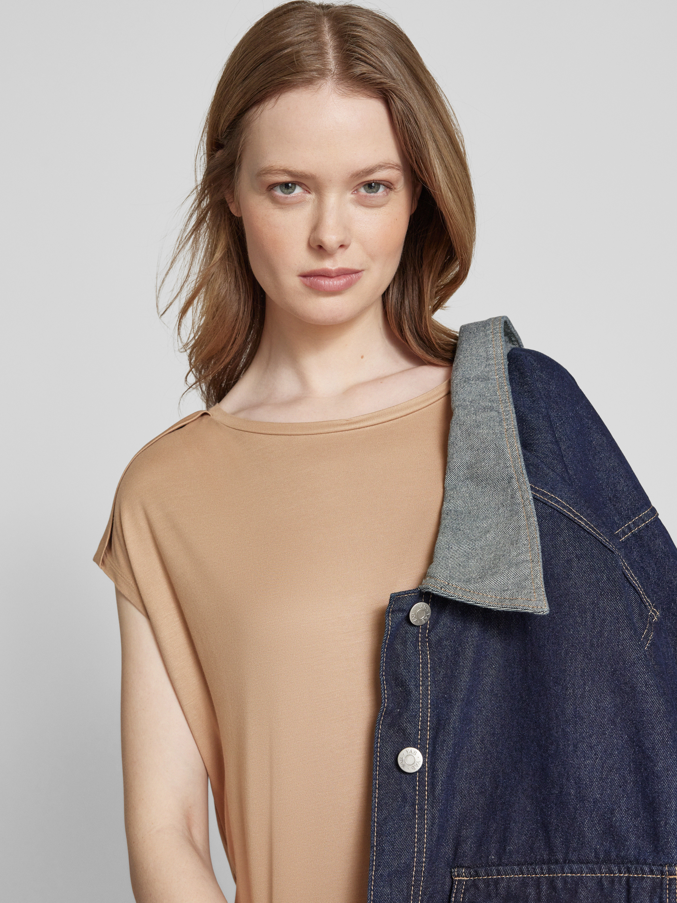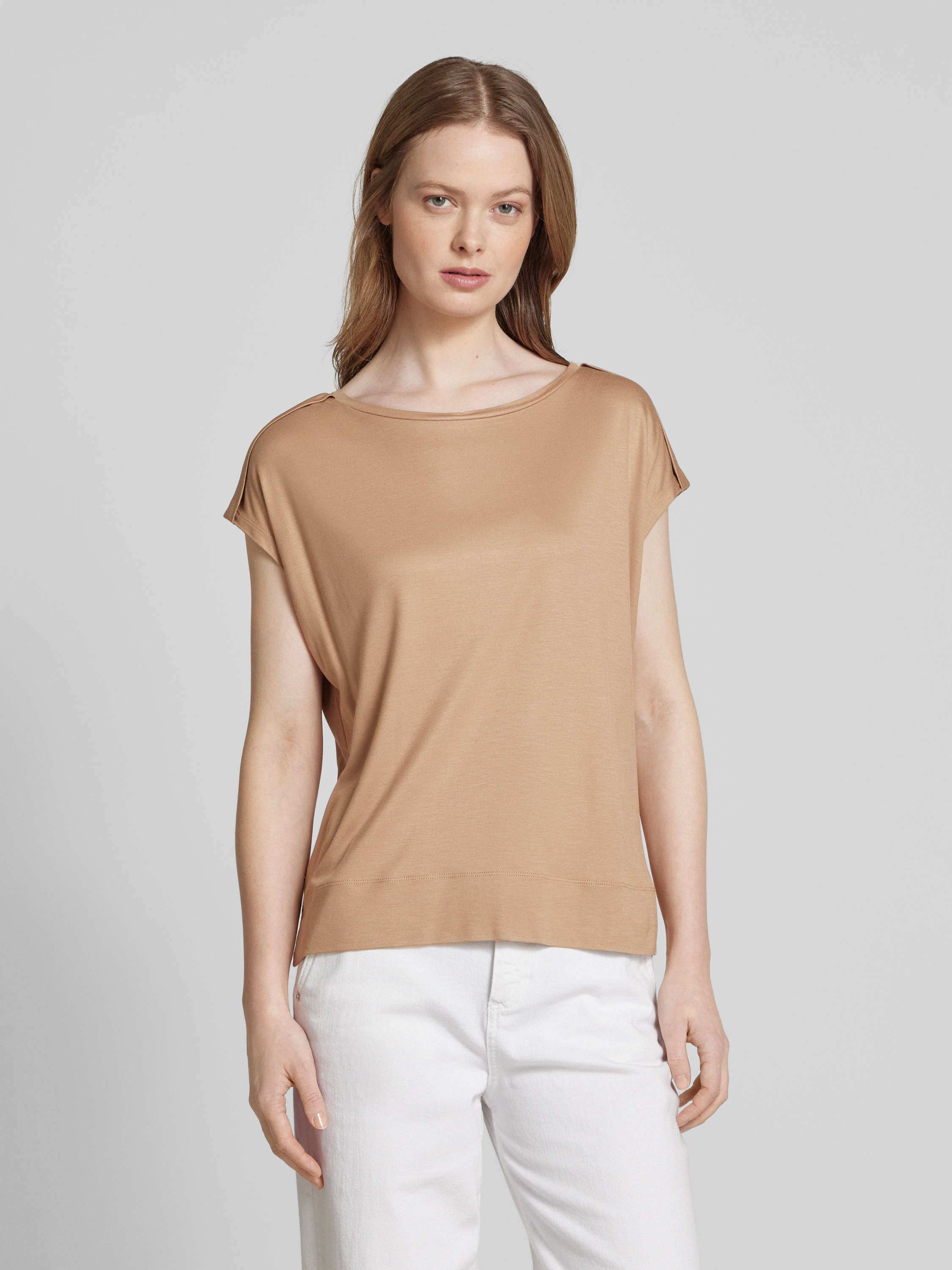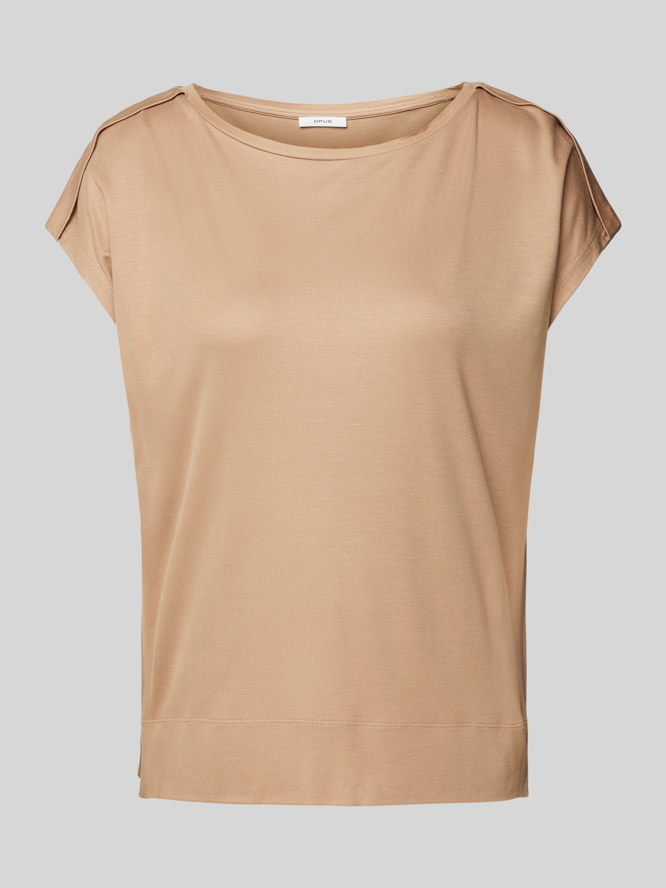 T-shirt met geribde ronde hals, model 'Sestern' in lichtbruin