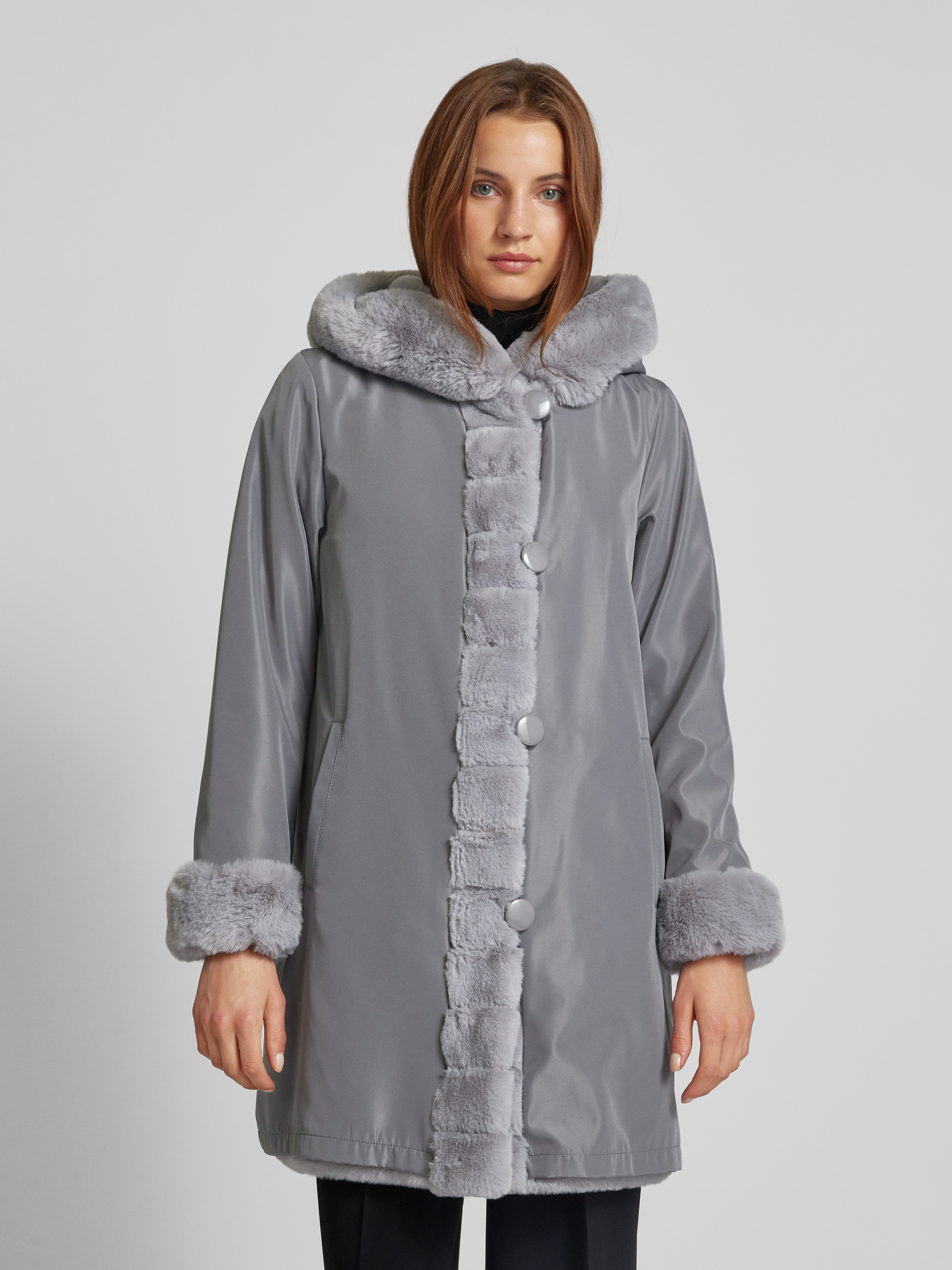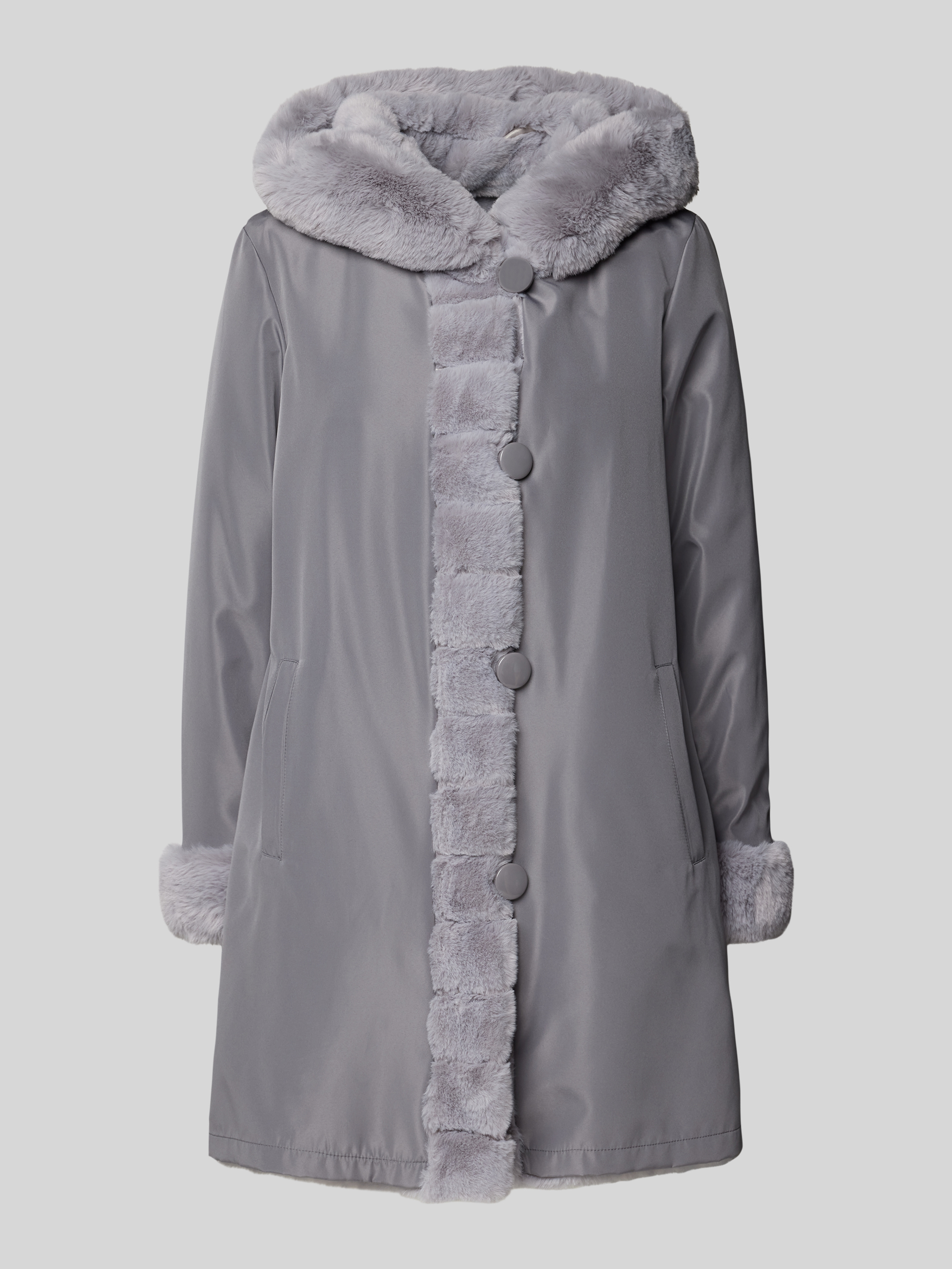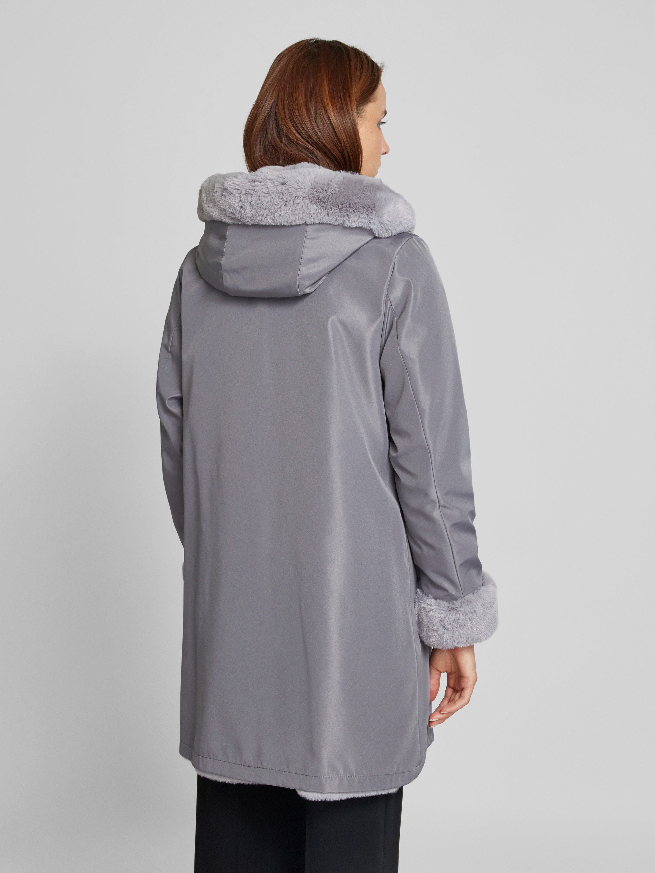 Keerbare lange jas met imitatiebont in middengrijs