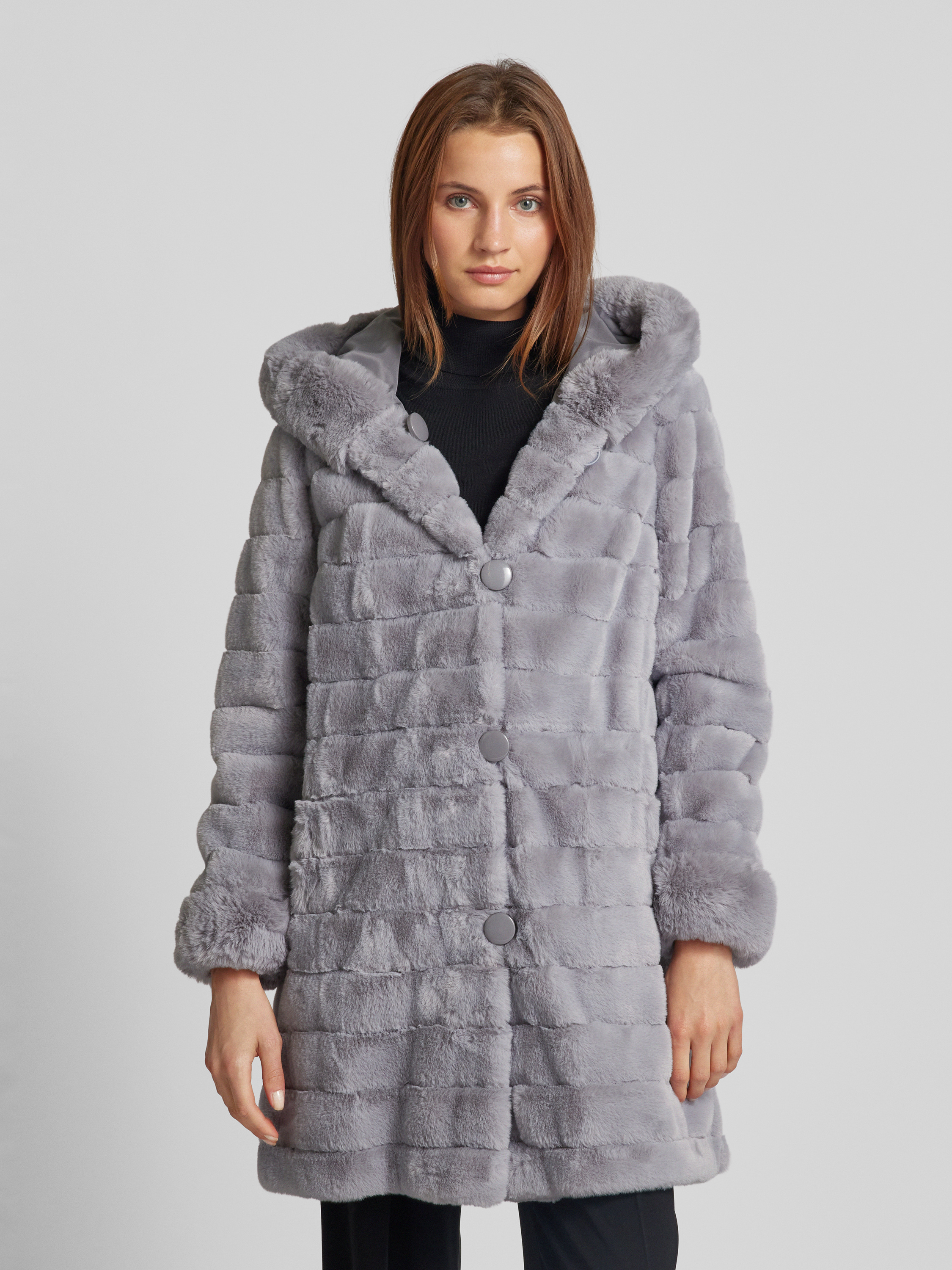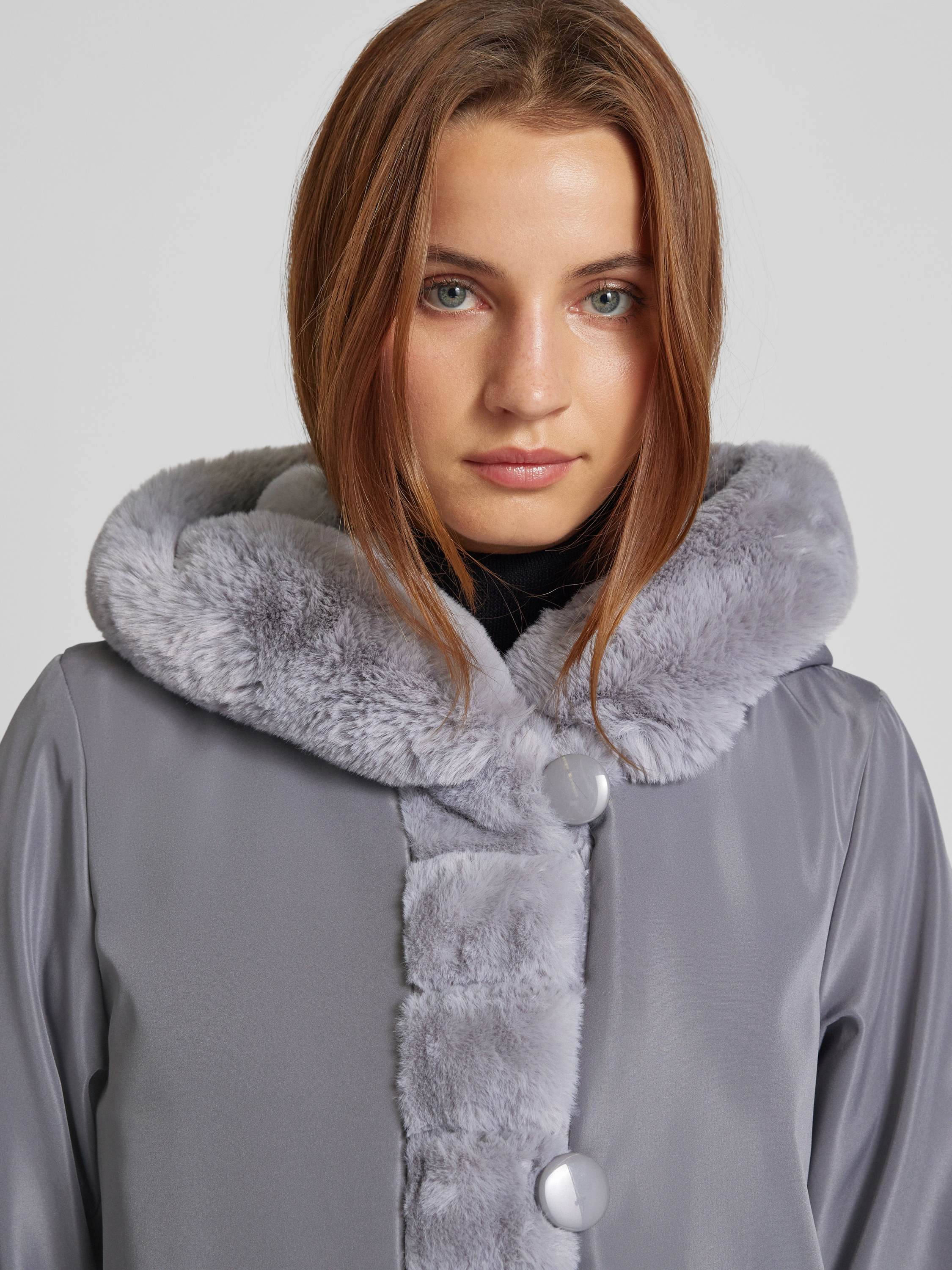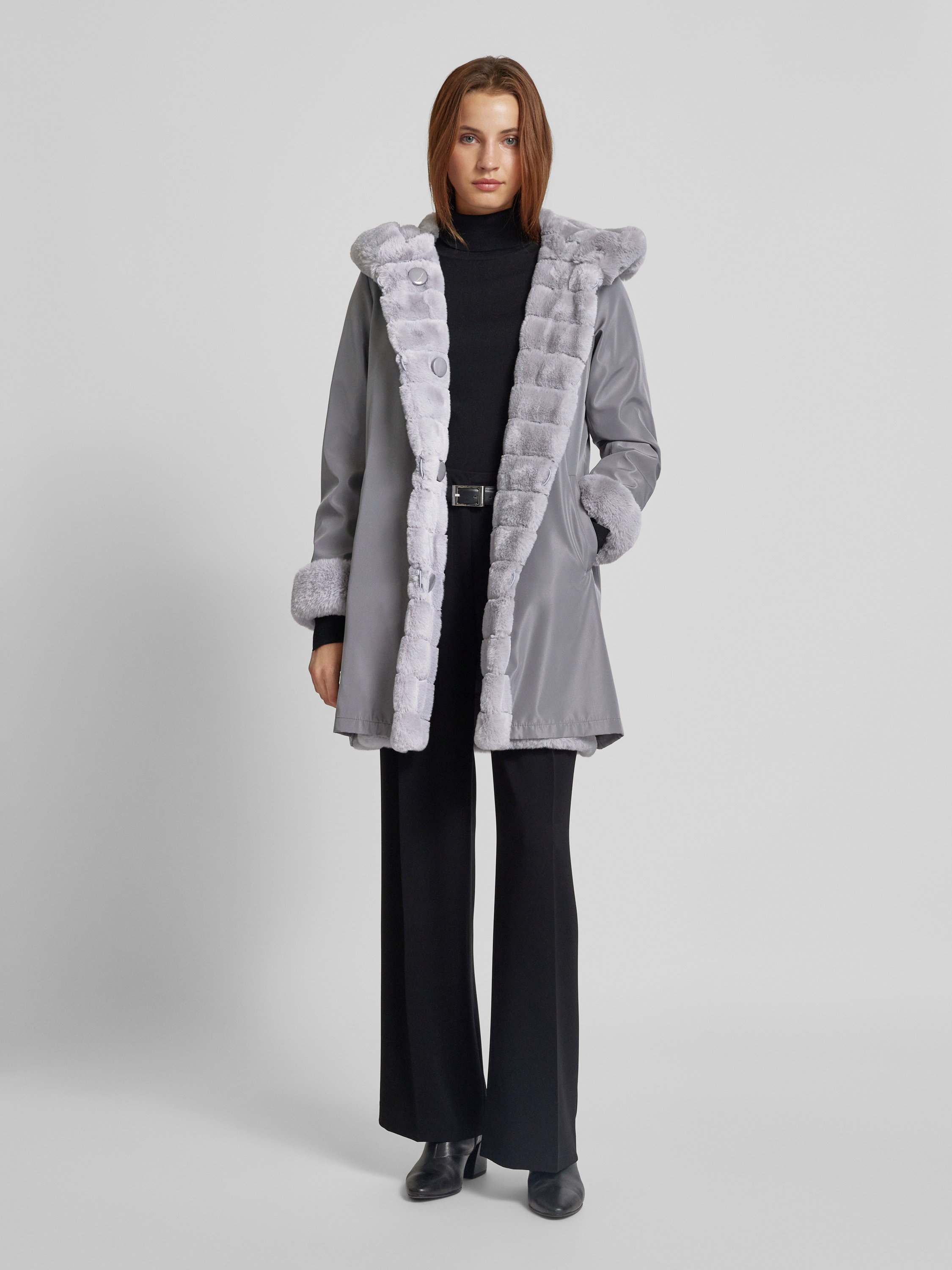 Keerbare lange jas met imitatiebont in middengrijs