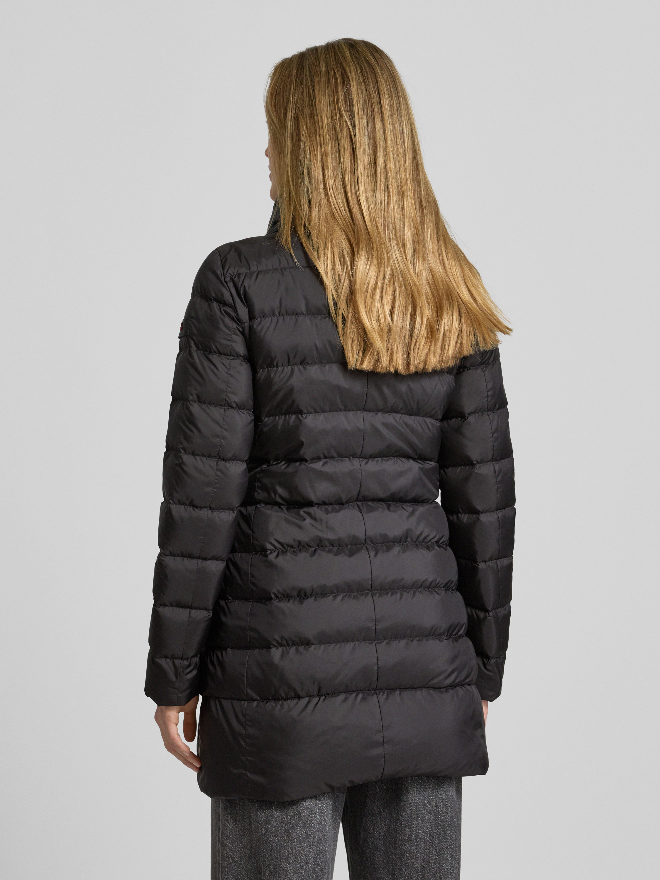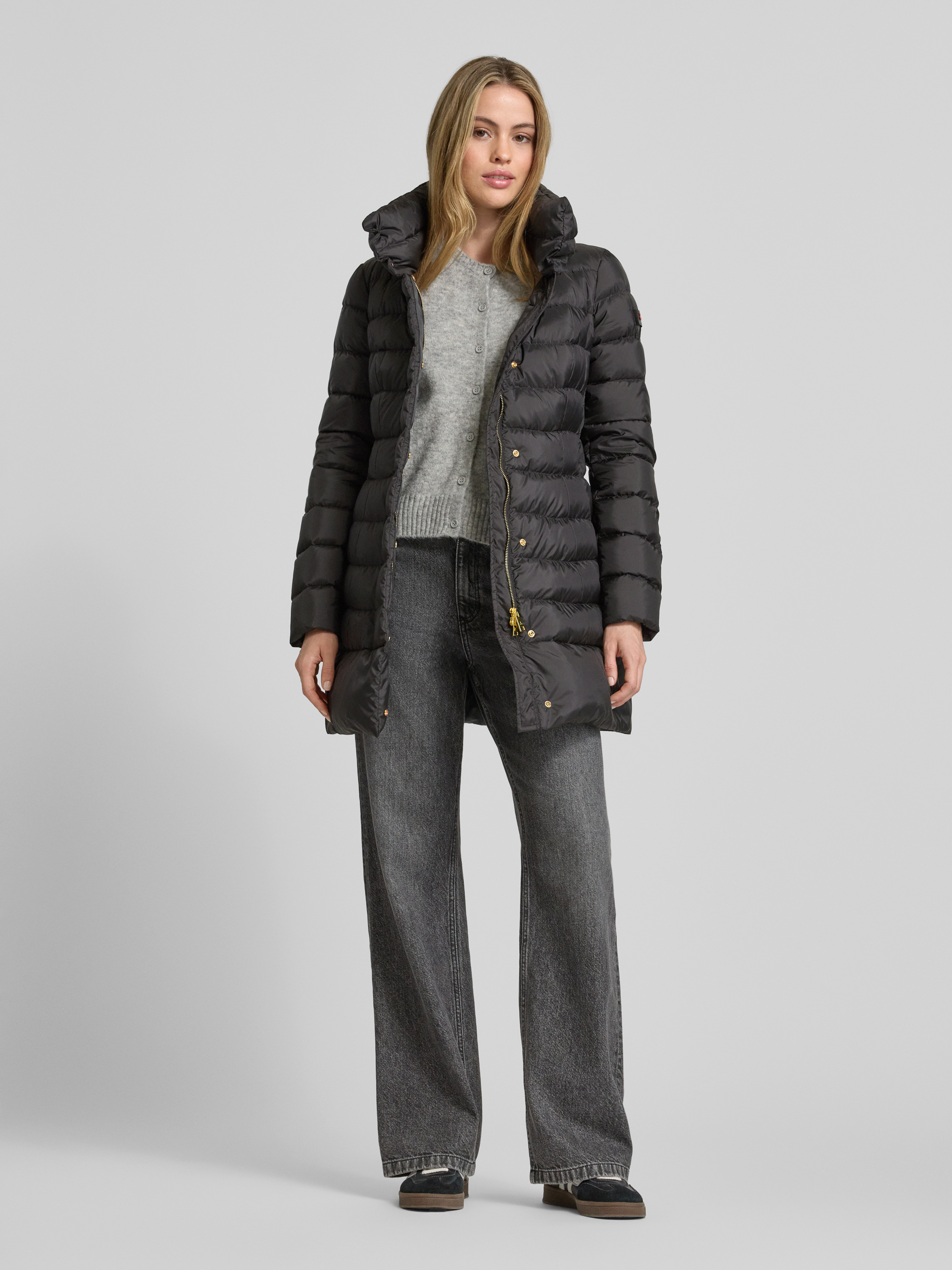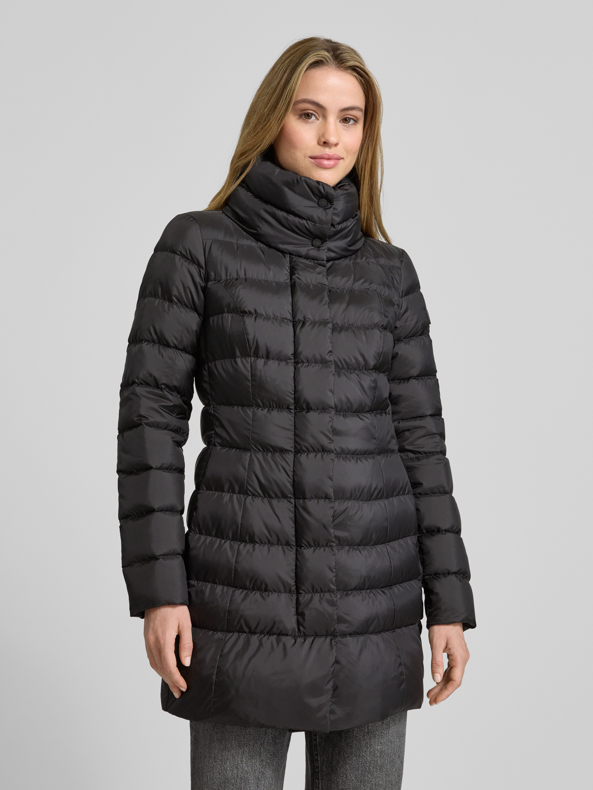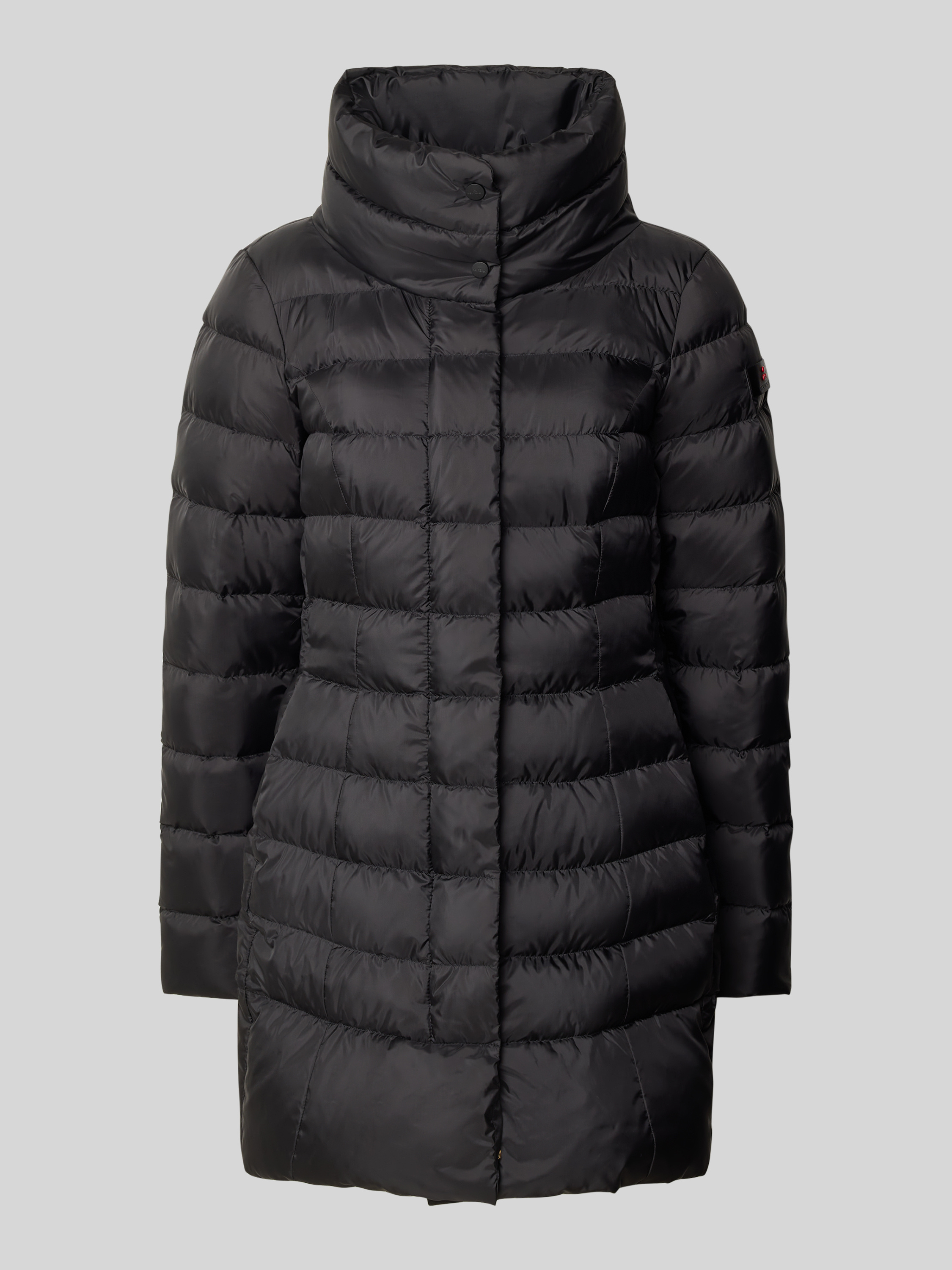 PeutereyGewatteerde lange jas met opstaande kraag, model 'SOBCHAK' in zwart