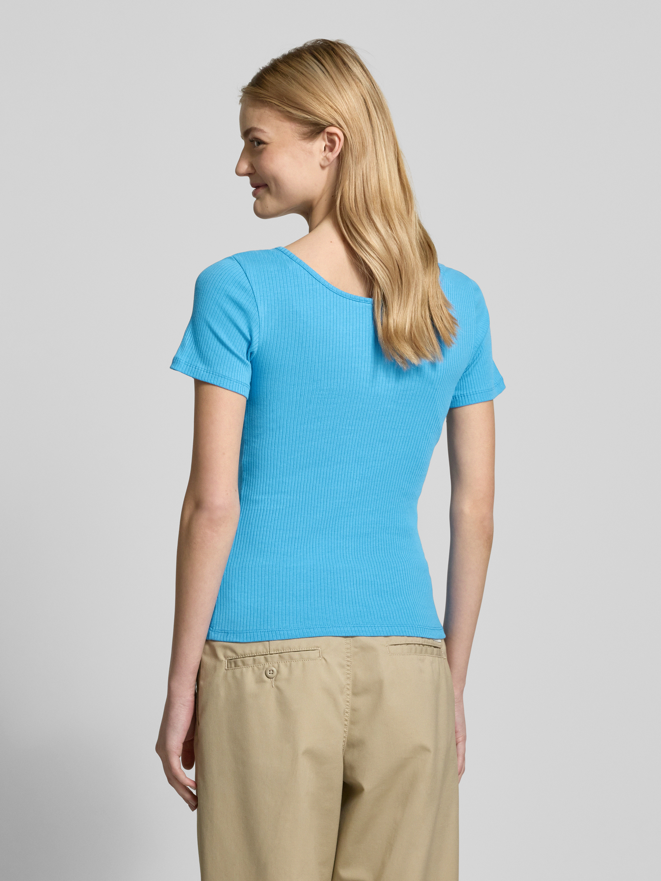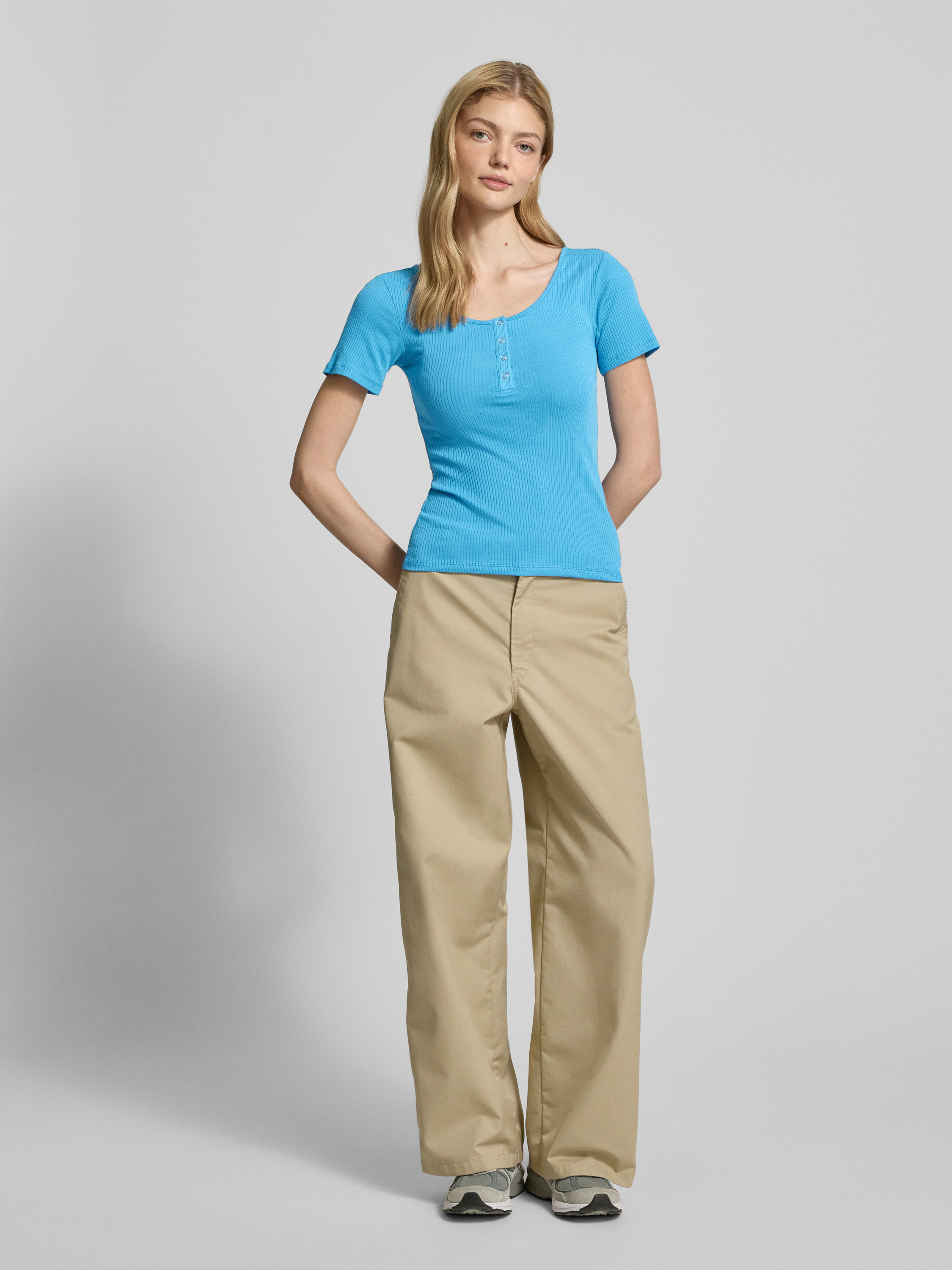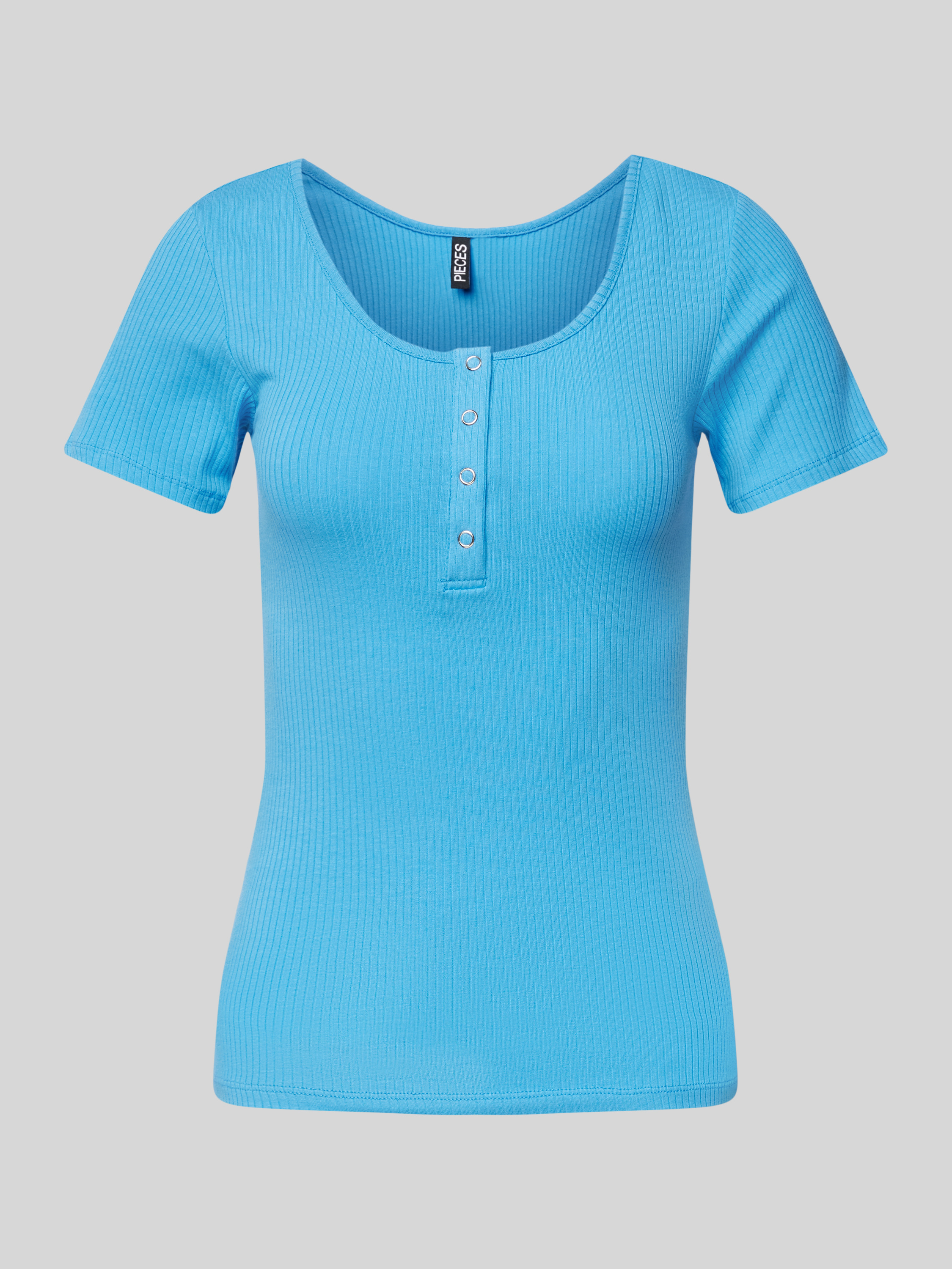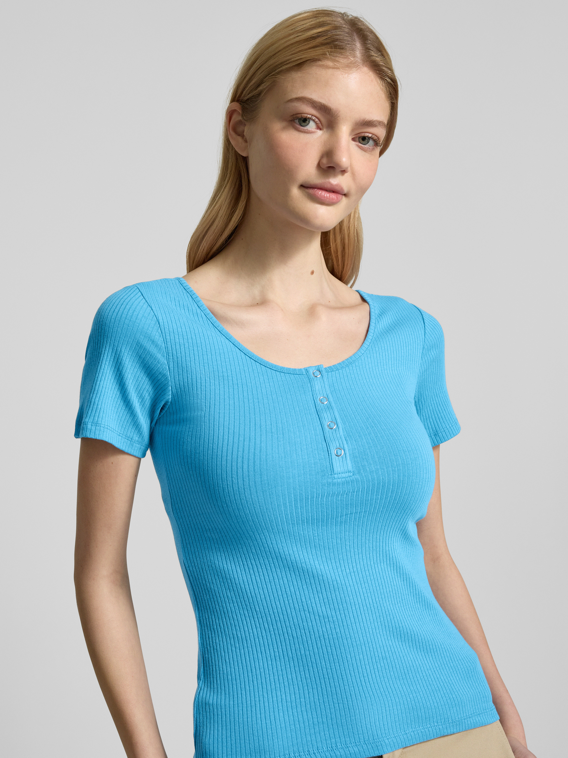 Slim fit T-shirt van katoenmix met kort drukknooppaneel, model 'KITTE' in oceaanblauw