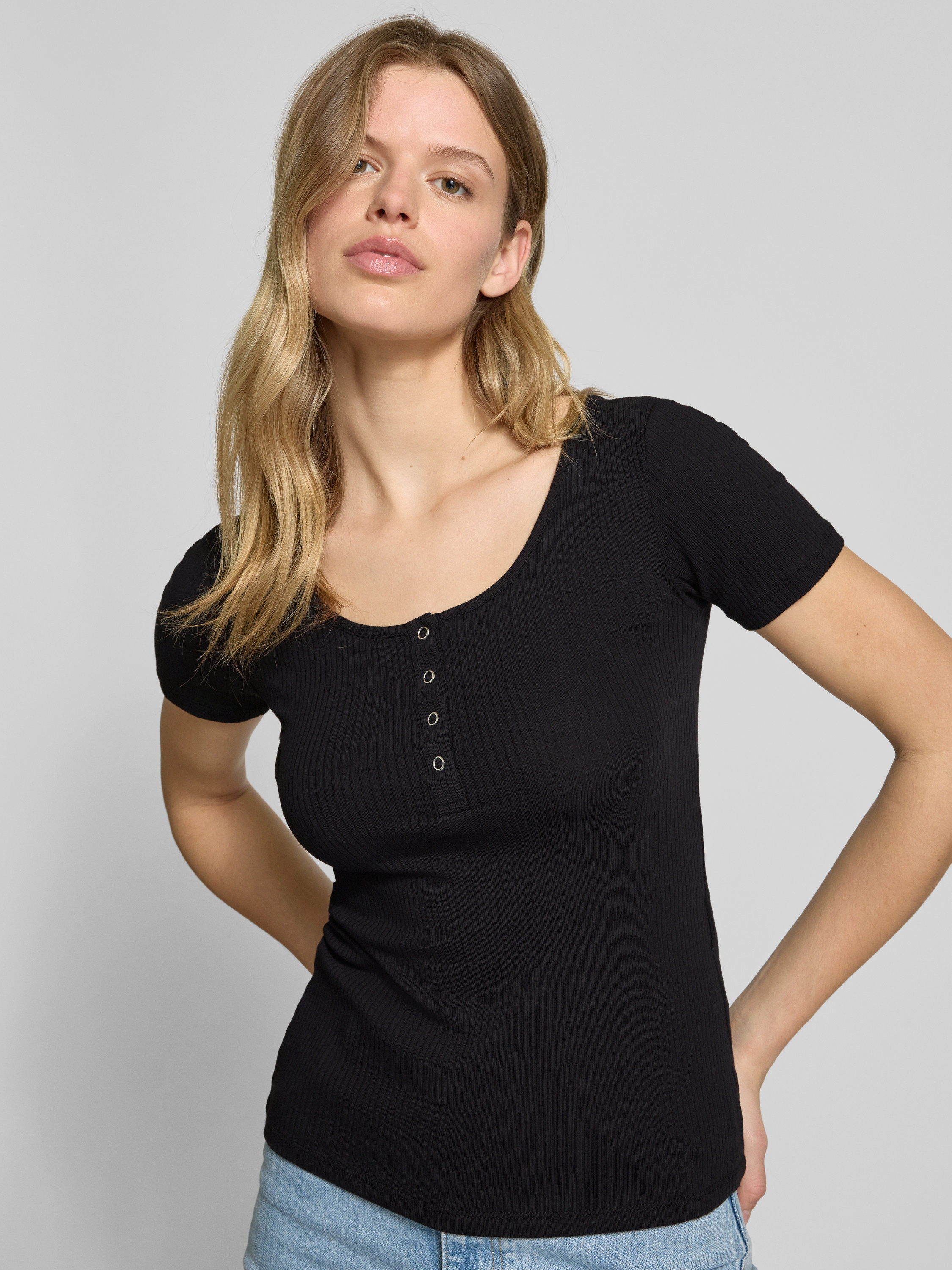 Slim fit T-shirt van katoenmix met kort drukknooppaneel, model 'KITTE' in zwart
