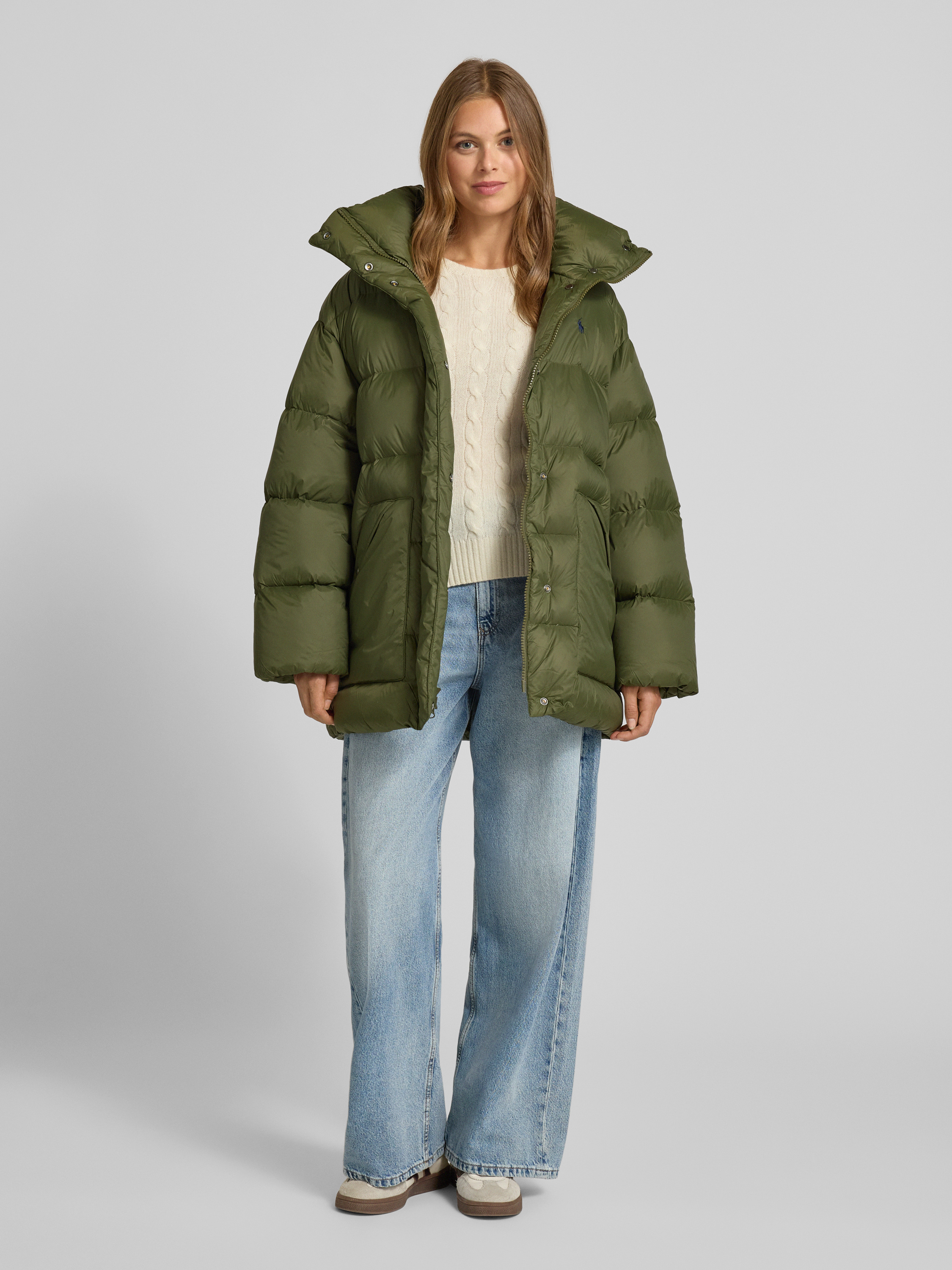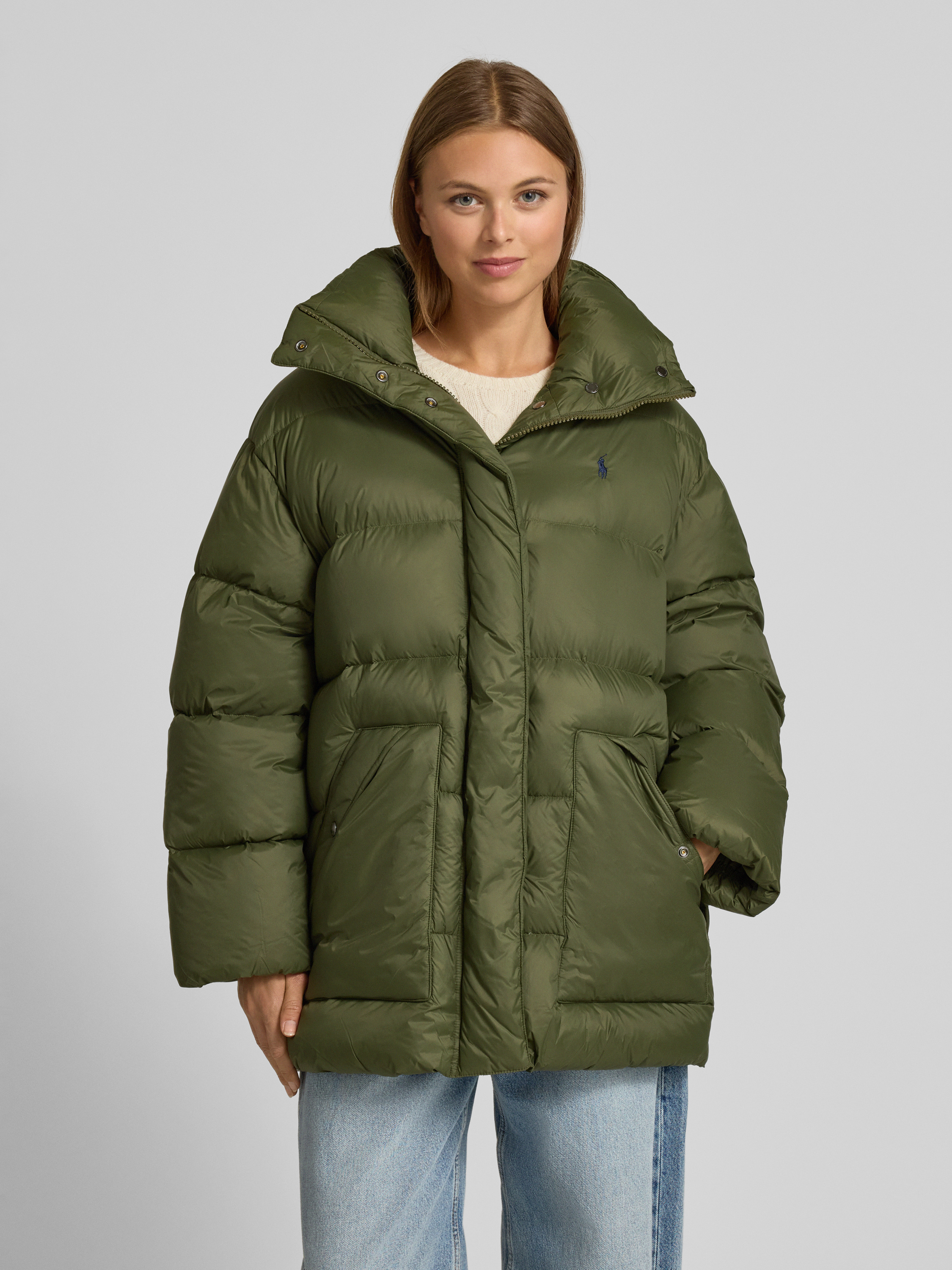 Donsjack met opstaande kraag in olijfgroen