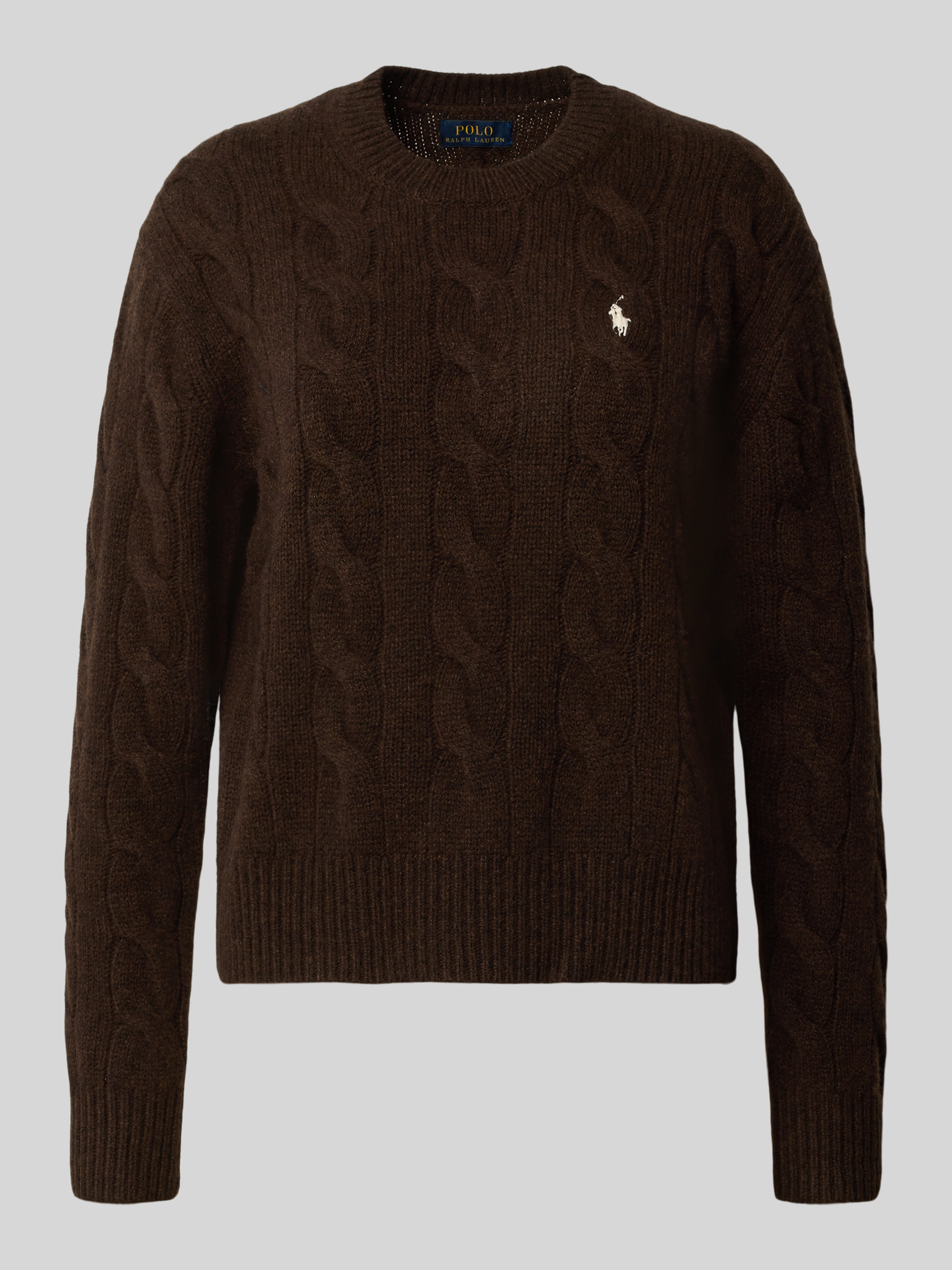 Gebreide pullover met kabelpatroon en ronde hals in donkerbruin