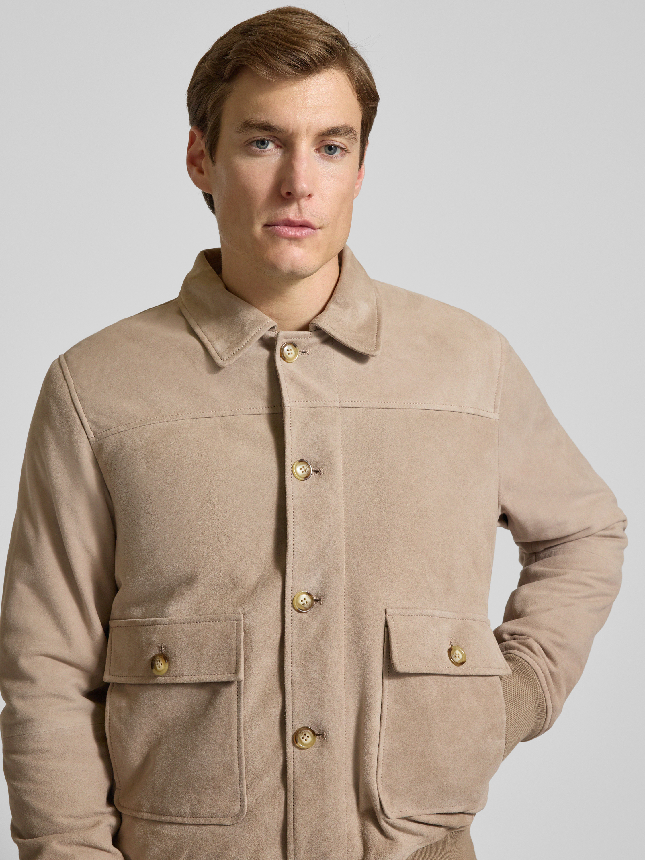 Bomberjack met platte kraag en klepzakken in beige