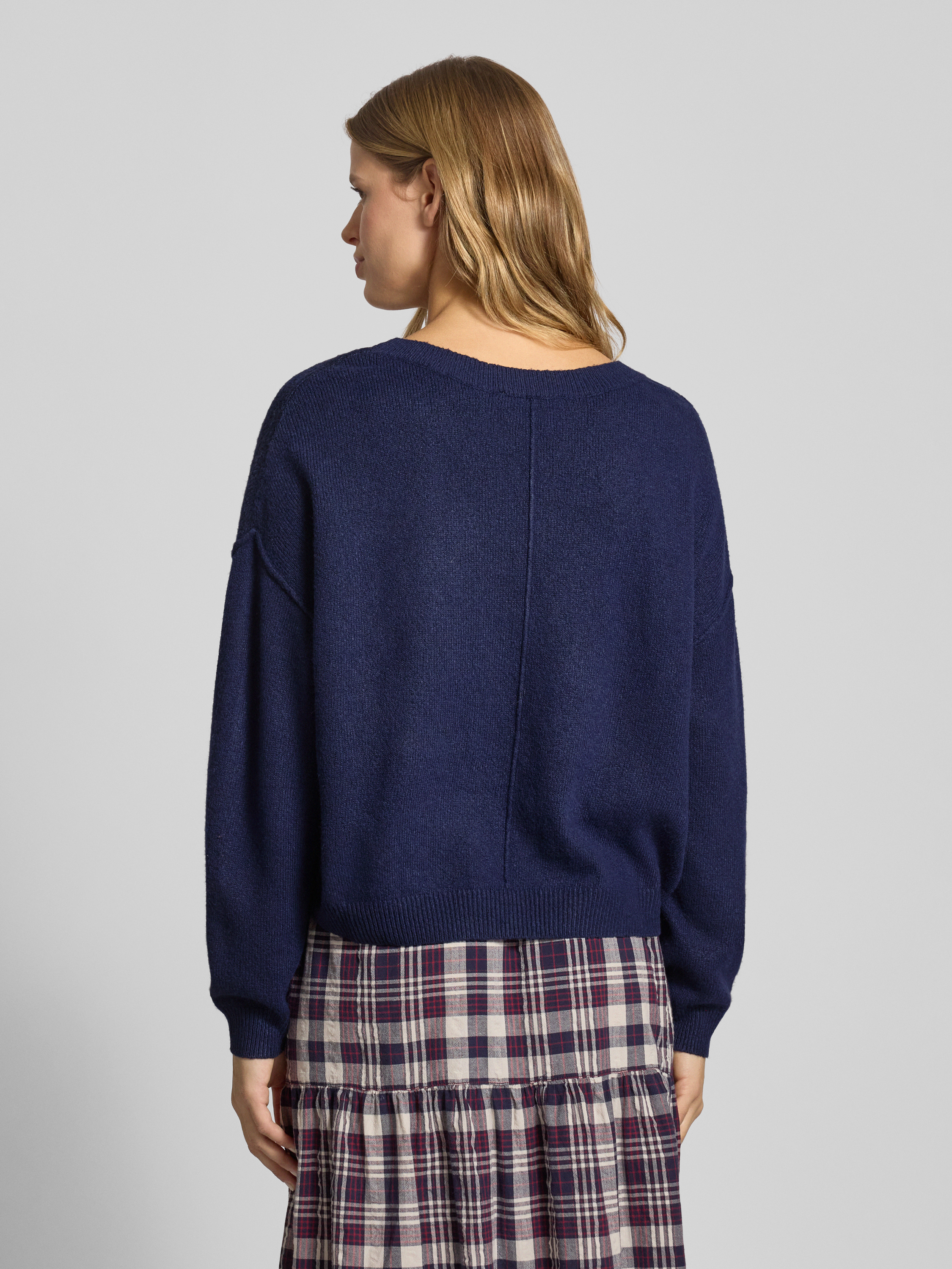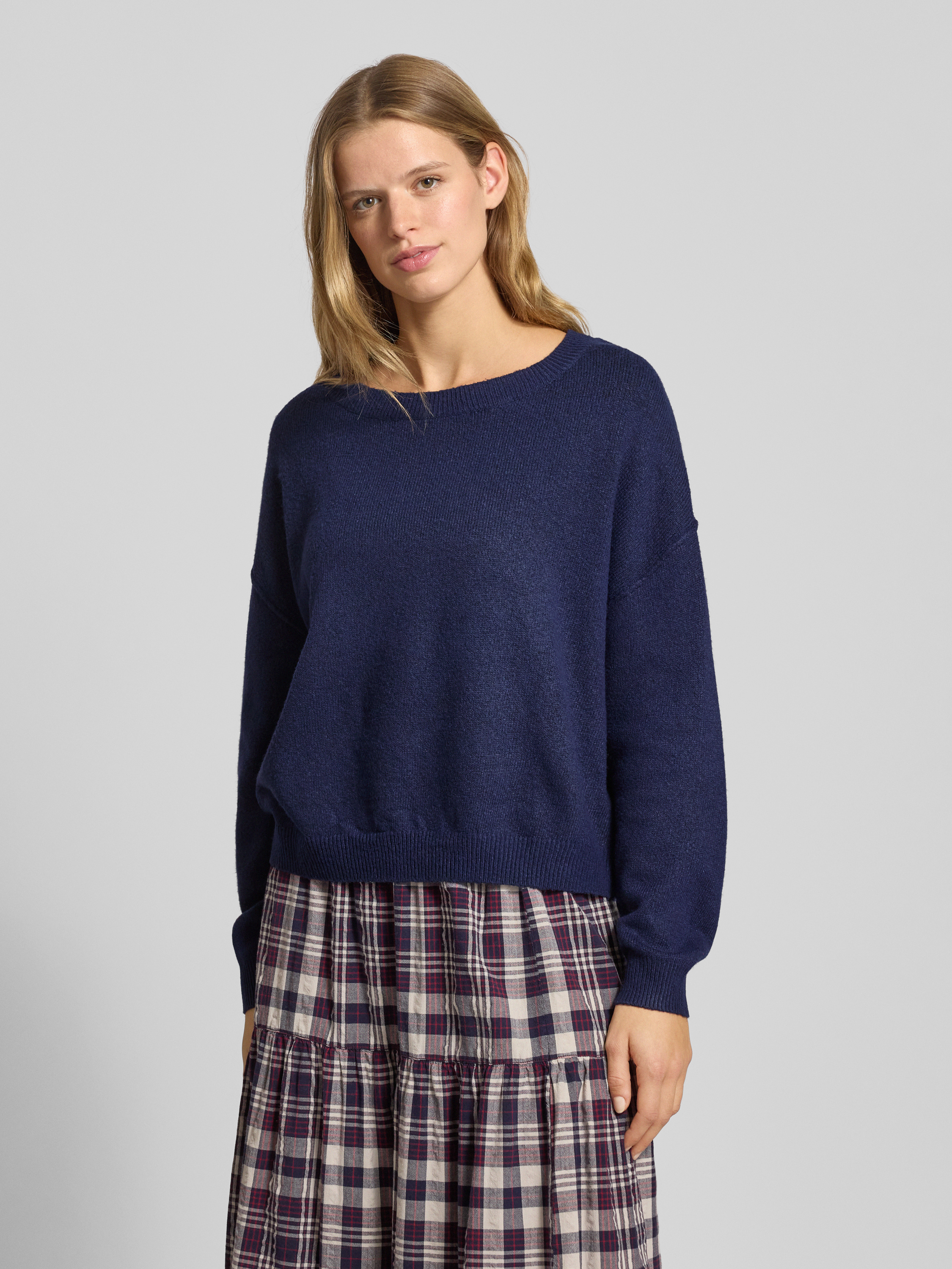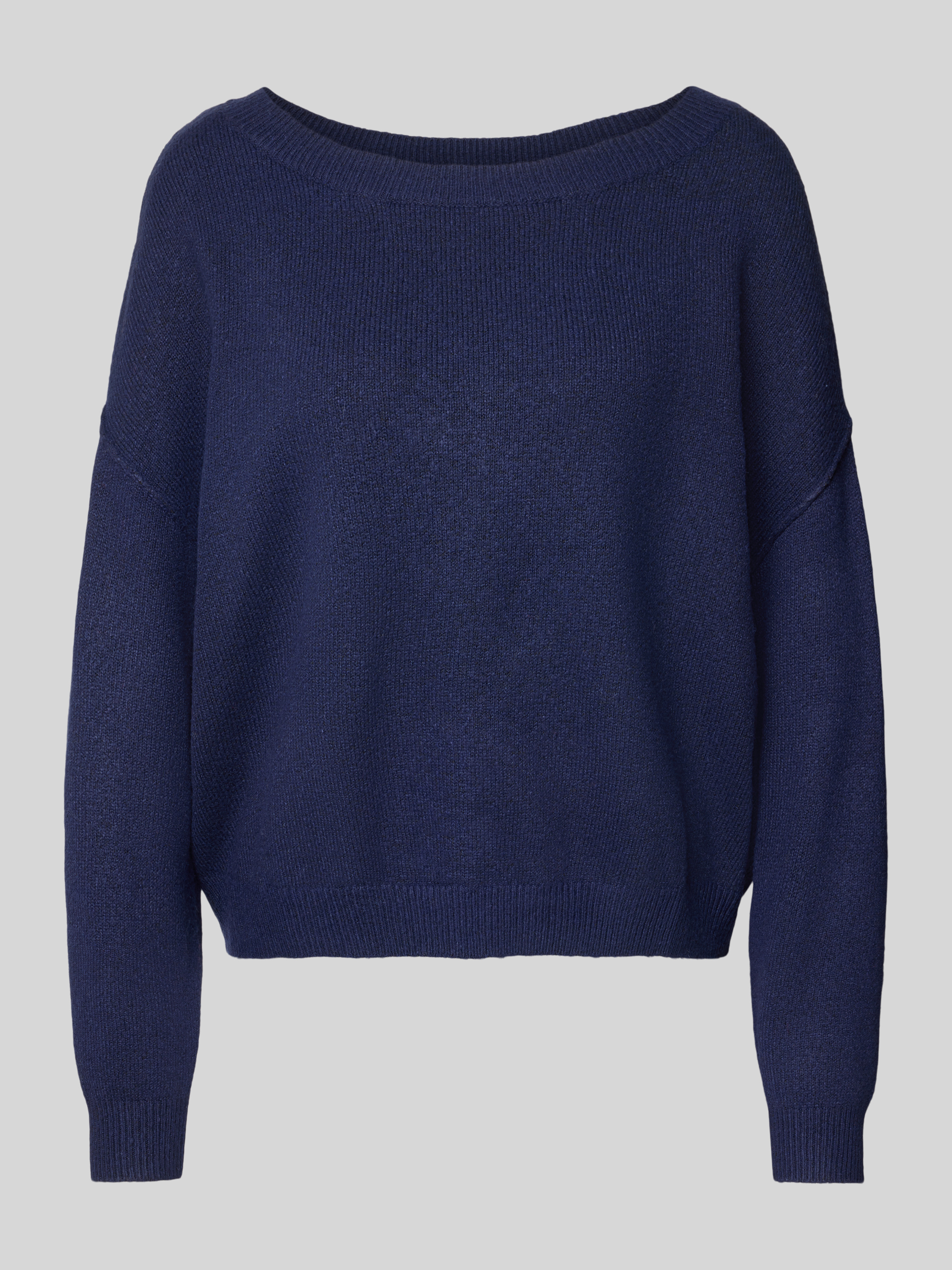 ReviewGebreide pullover met diepe boothals in donkerblauw gemêleerd
