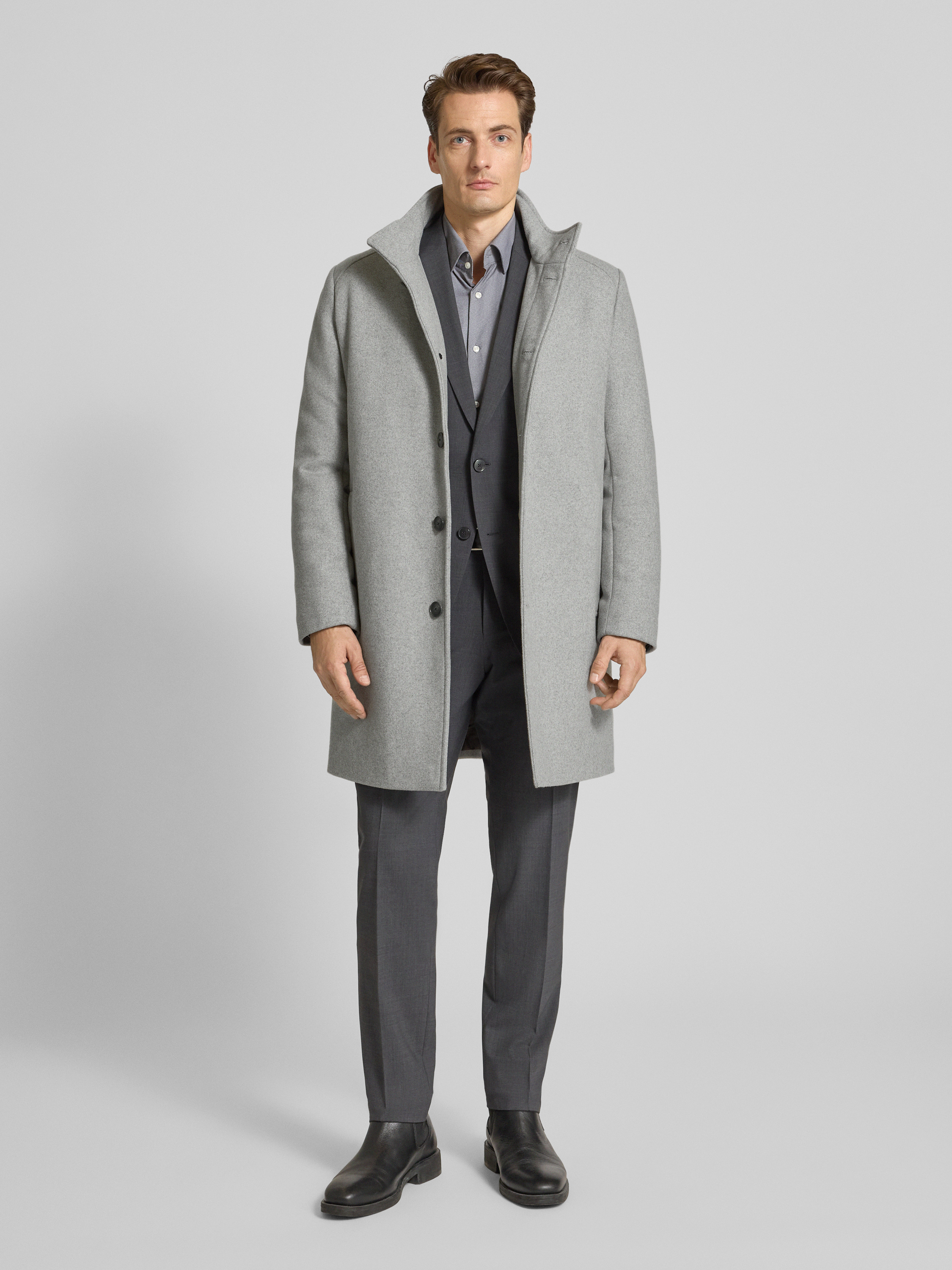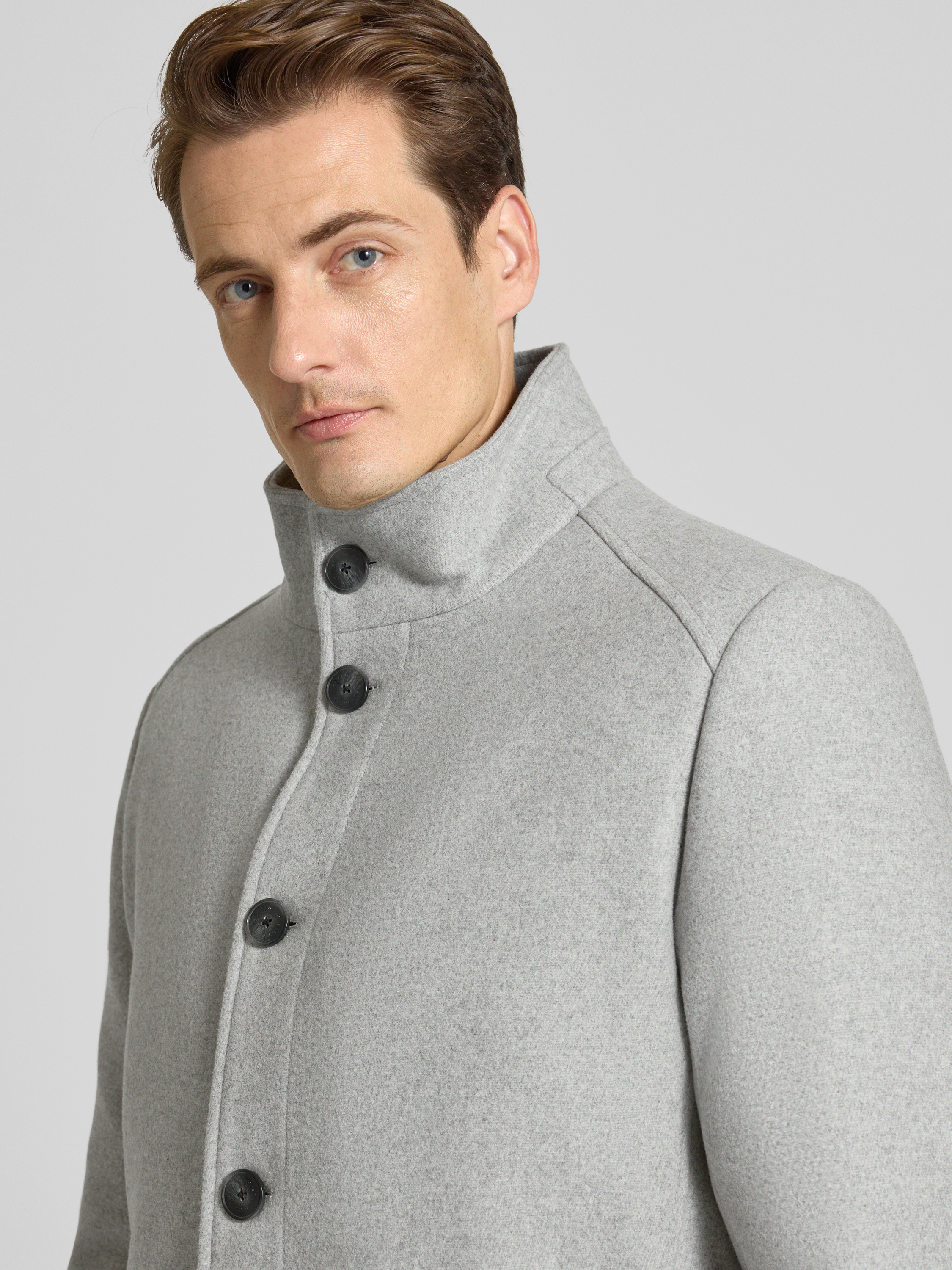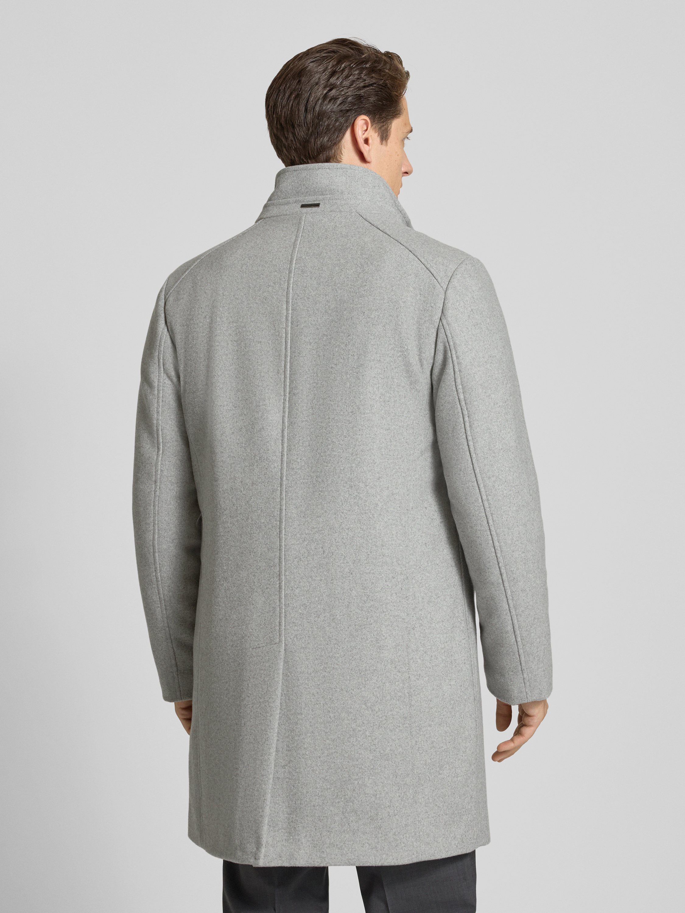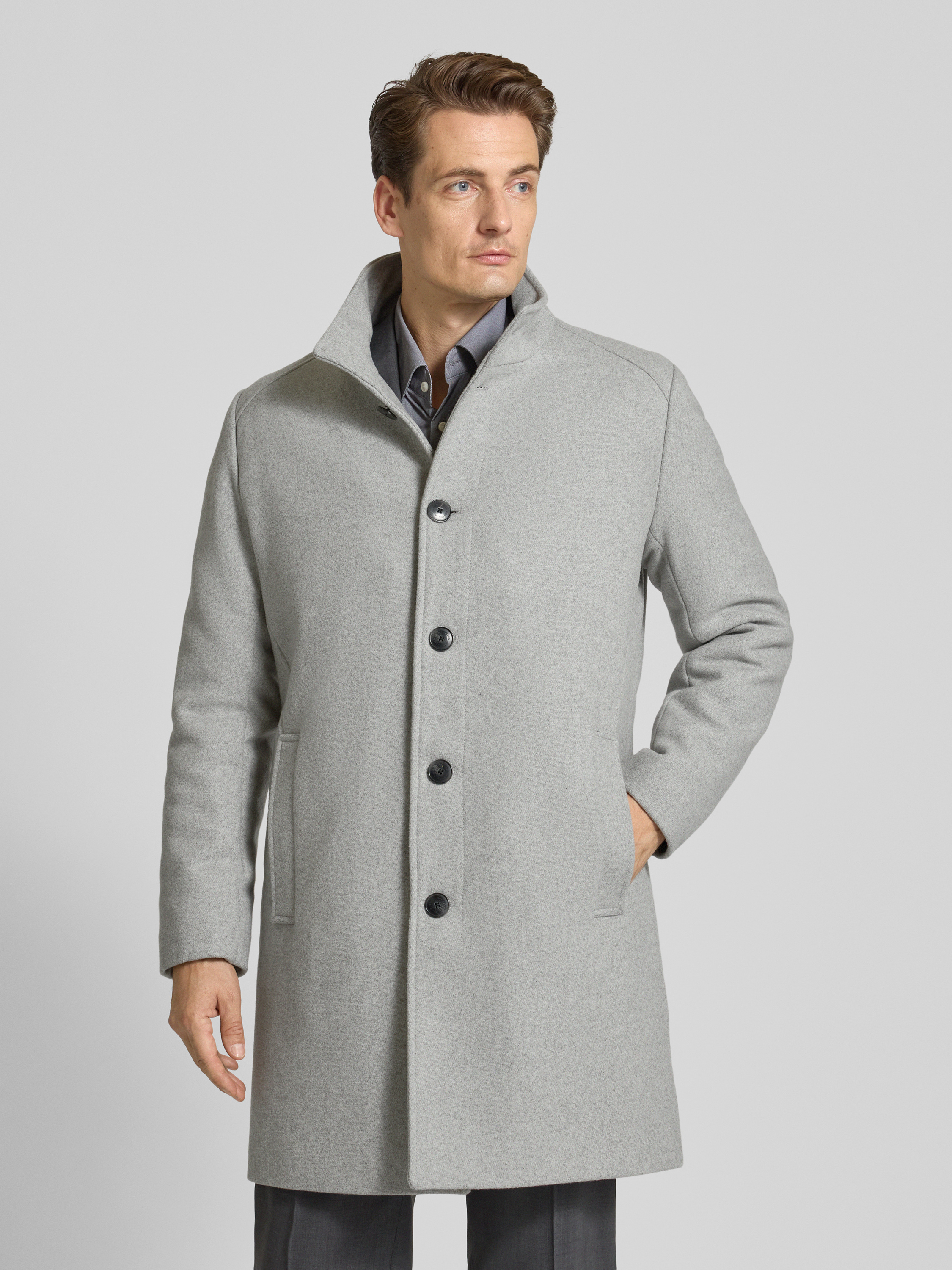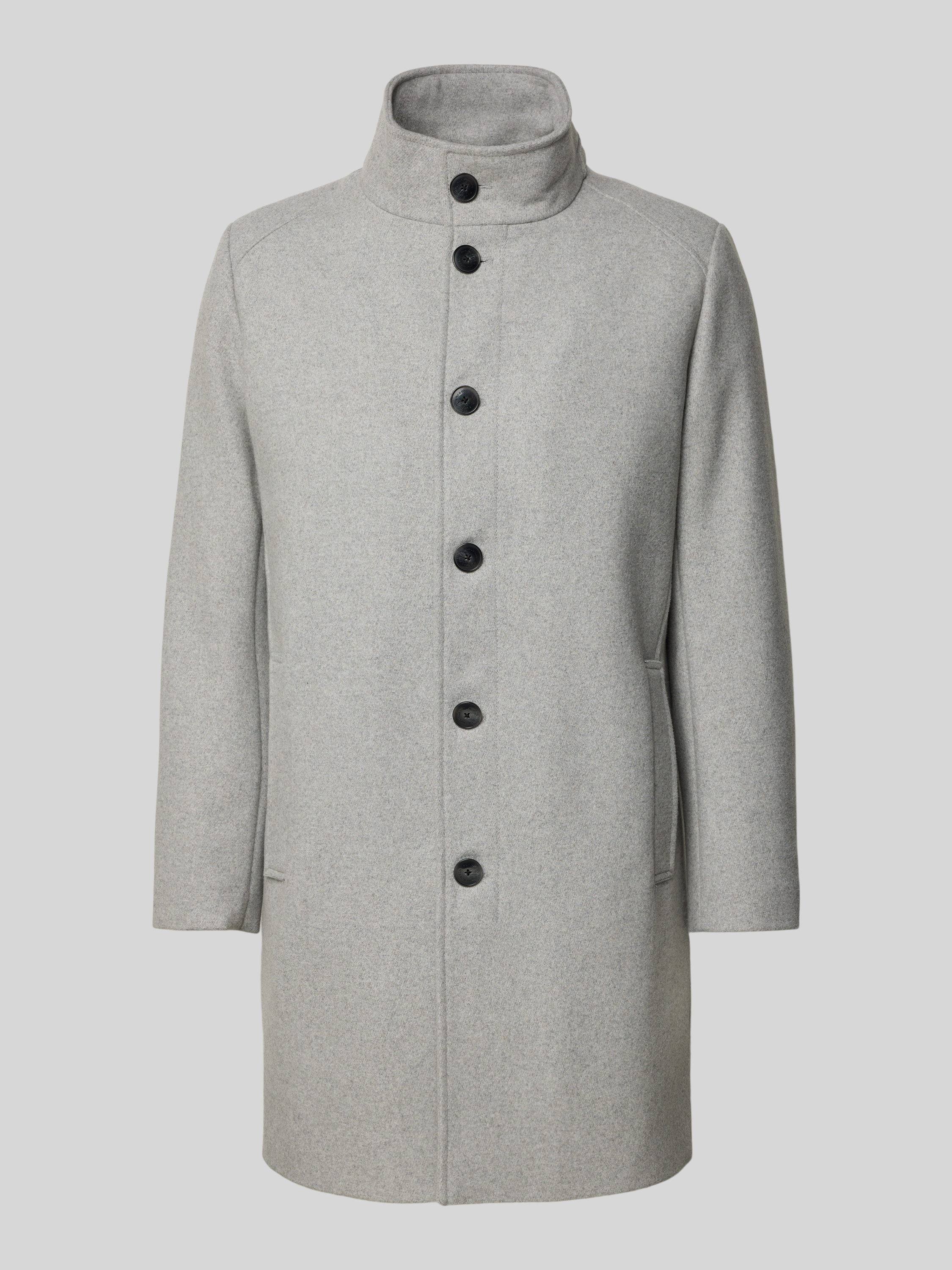 Lange jas met opstaande kraag en steekzakken in lichtgrijs
